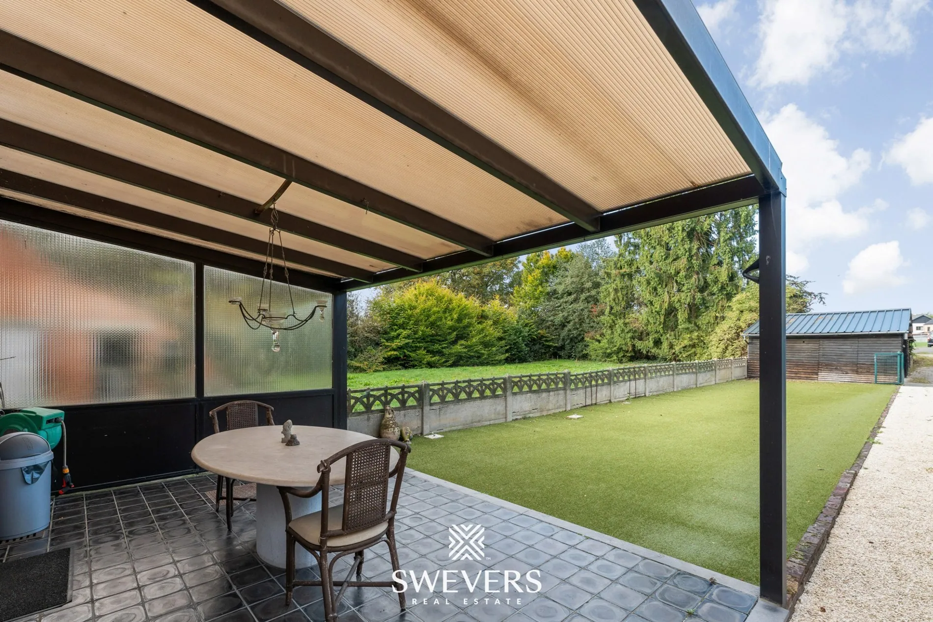 Met een perceeloppervlakte van 4a 09ca en een westelijke oriëntatie is er potentieel voor een aangename buitenruimte met middag- en avondzon. Het terras of de tuinzone achteraan biedt een rustige plek om na het werk te ontspannen, terwijl de grote ramen een mooi zicht bieden op dit private gedeelte.