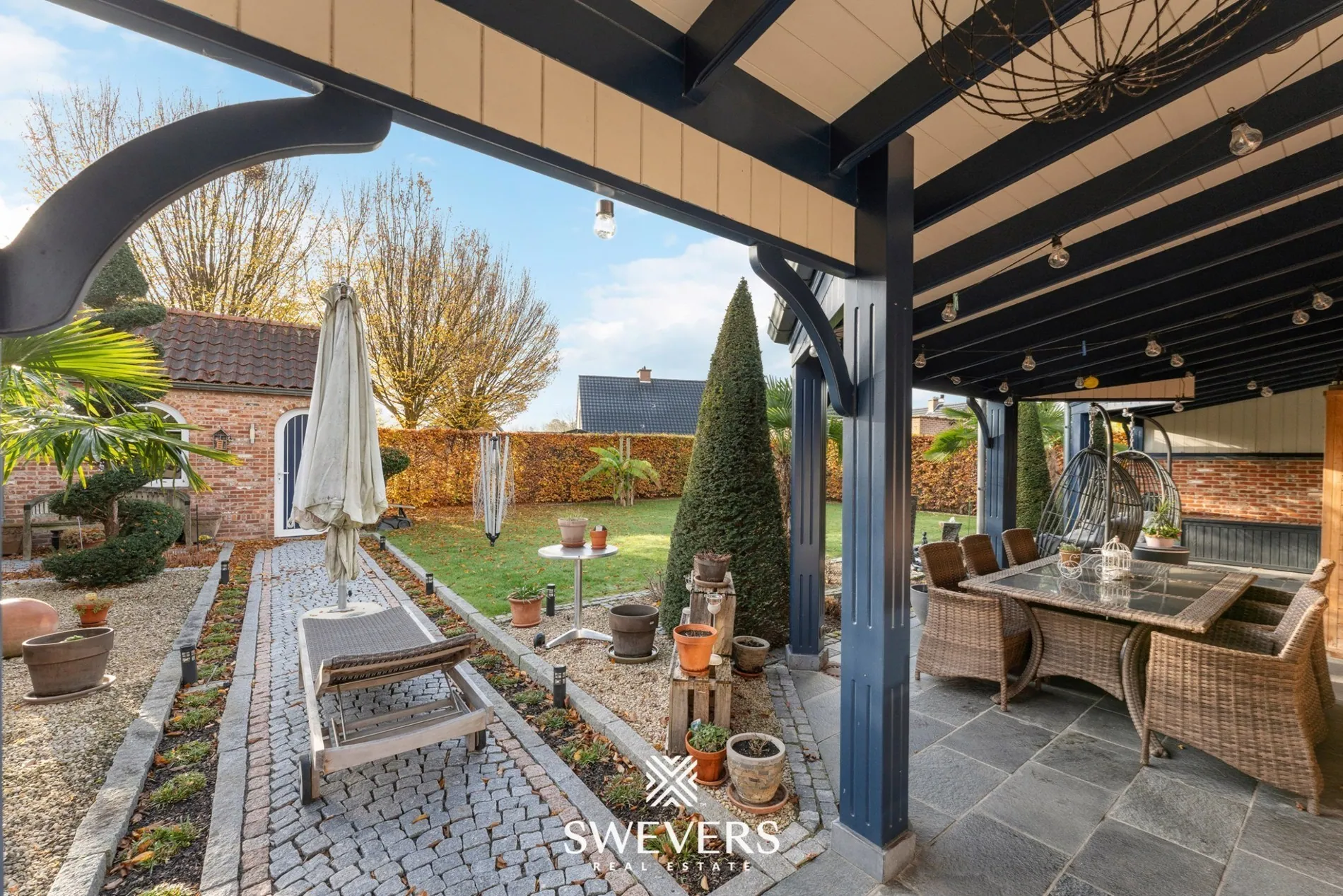 Buiten geniet je van een zonnige, zuidgerichte tuin waar het heerlijk vertoeven is. Het overdekte terras maakt het mogelijk om elk seizoen van de buitenlucht te profiteren en de tuinberging van 14,70 m² biedt praktische opbergruimte voor al je tuinmateriaal of fietsen. Het geheel is ideaal voor wie houdt van rust, privacy en een goed onderhouden buitenomgeving.