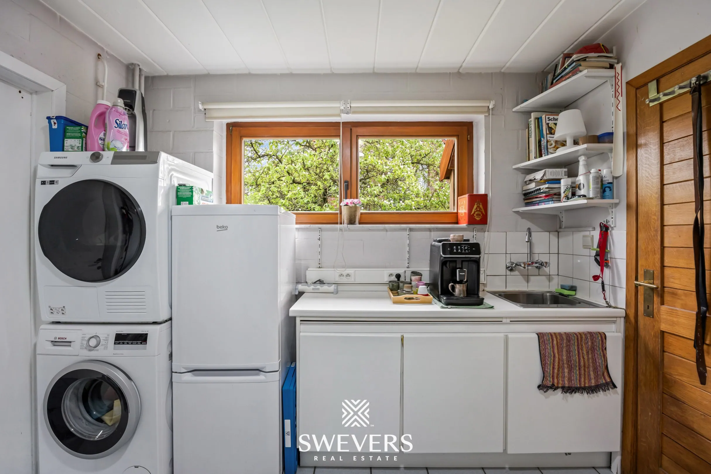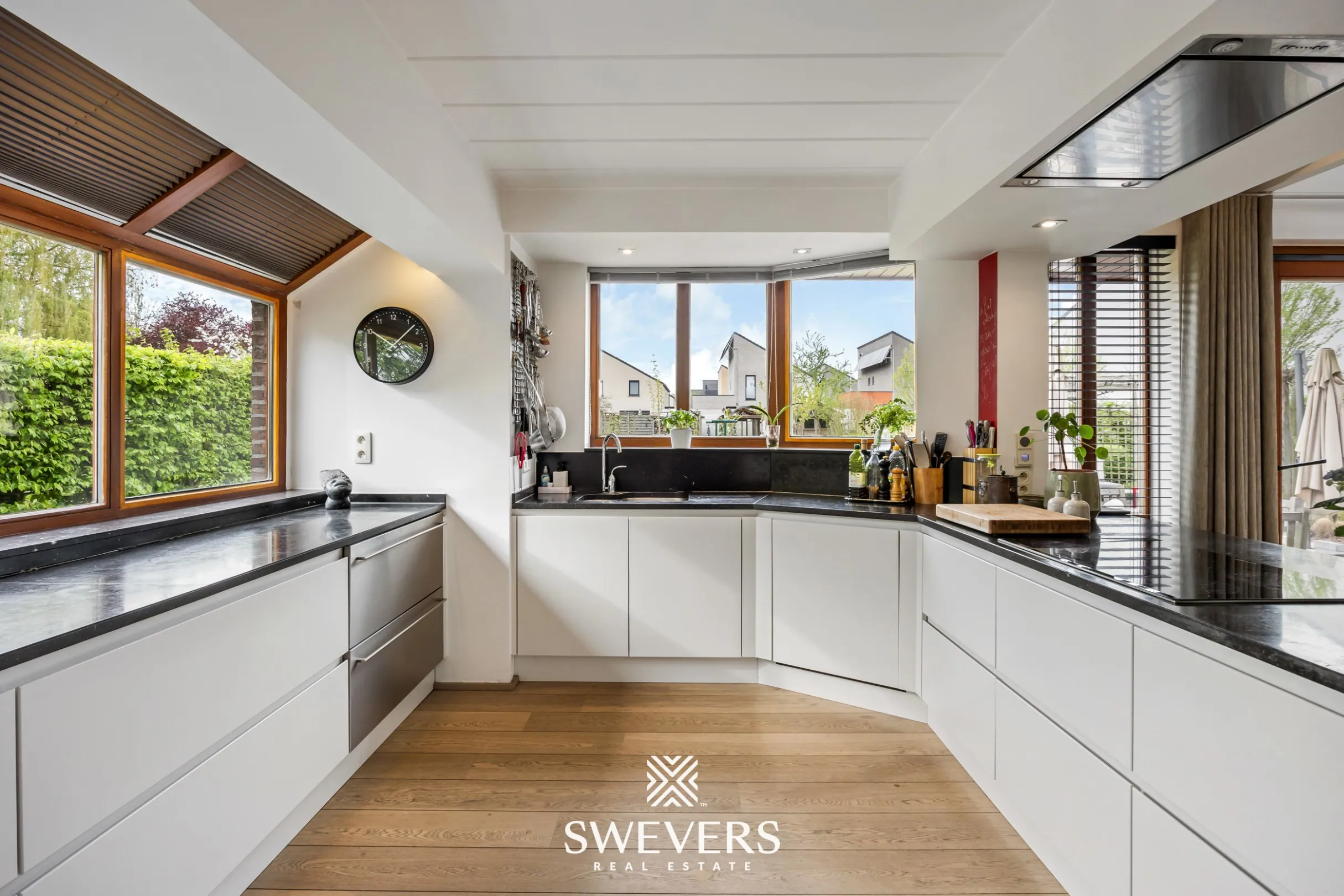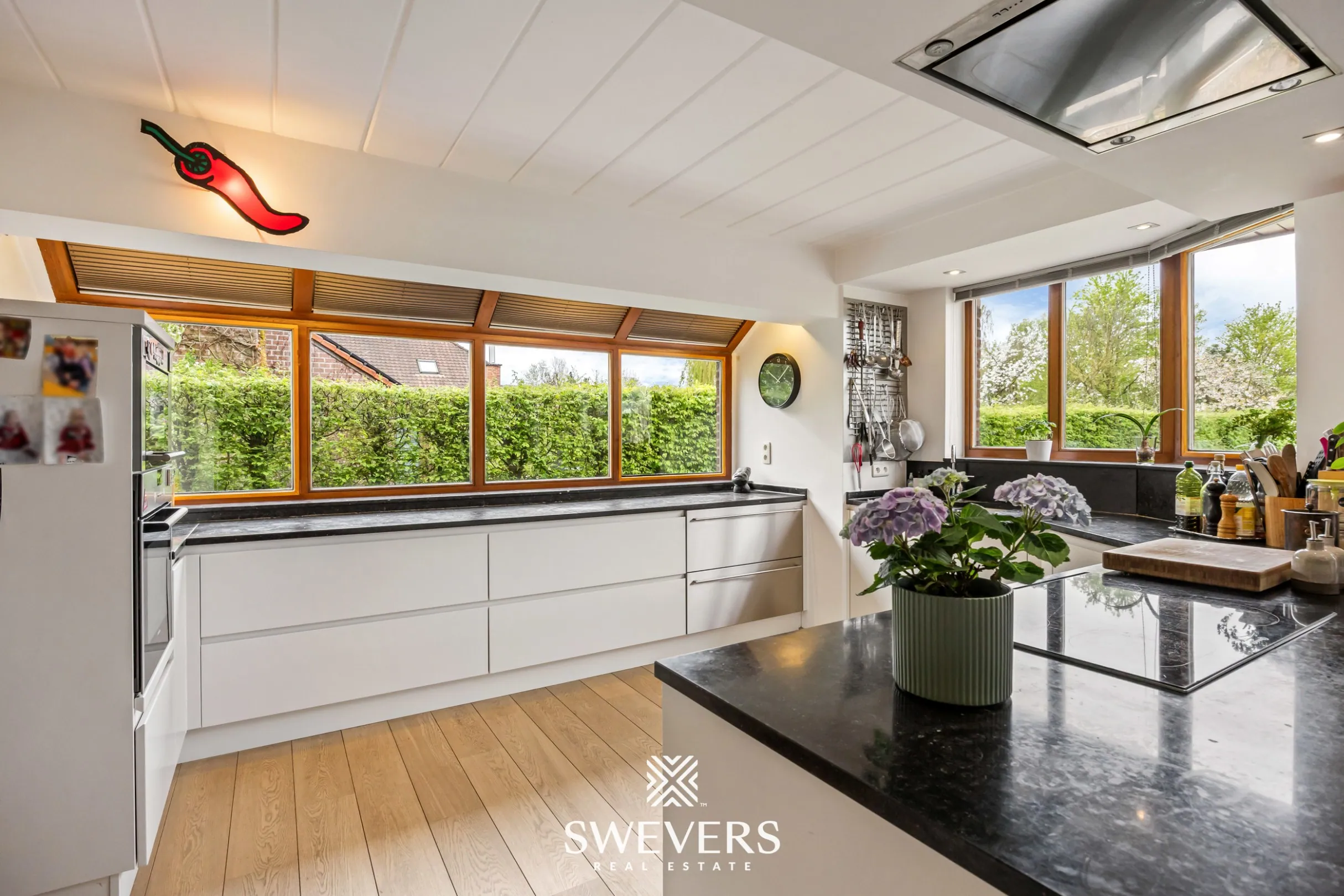 De open keuken van 15,75 m² sluit naadloos aan op de leefruimte en biedt alle ruimte voor culinaire momenten. Hier wordt koken een echte beleving, of het nu gaat om een uitgebreid diner met vrienden of een snelle maaltijd met het gezin. De open indeling versterkt het gevoel van ruimte en verbondenheid terwijl je vanuit de keuken zicht hebt op de prachtige tuin.