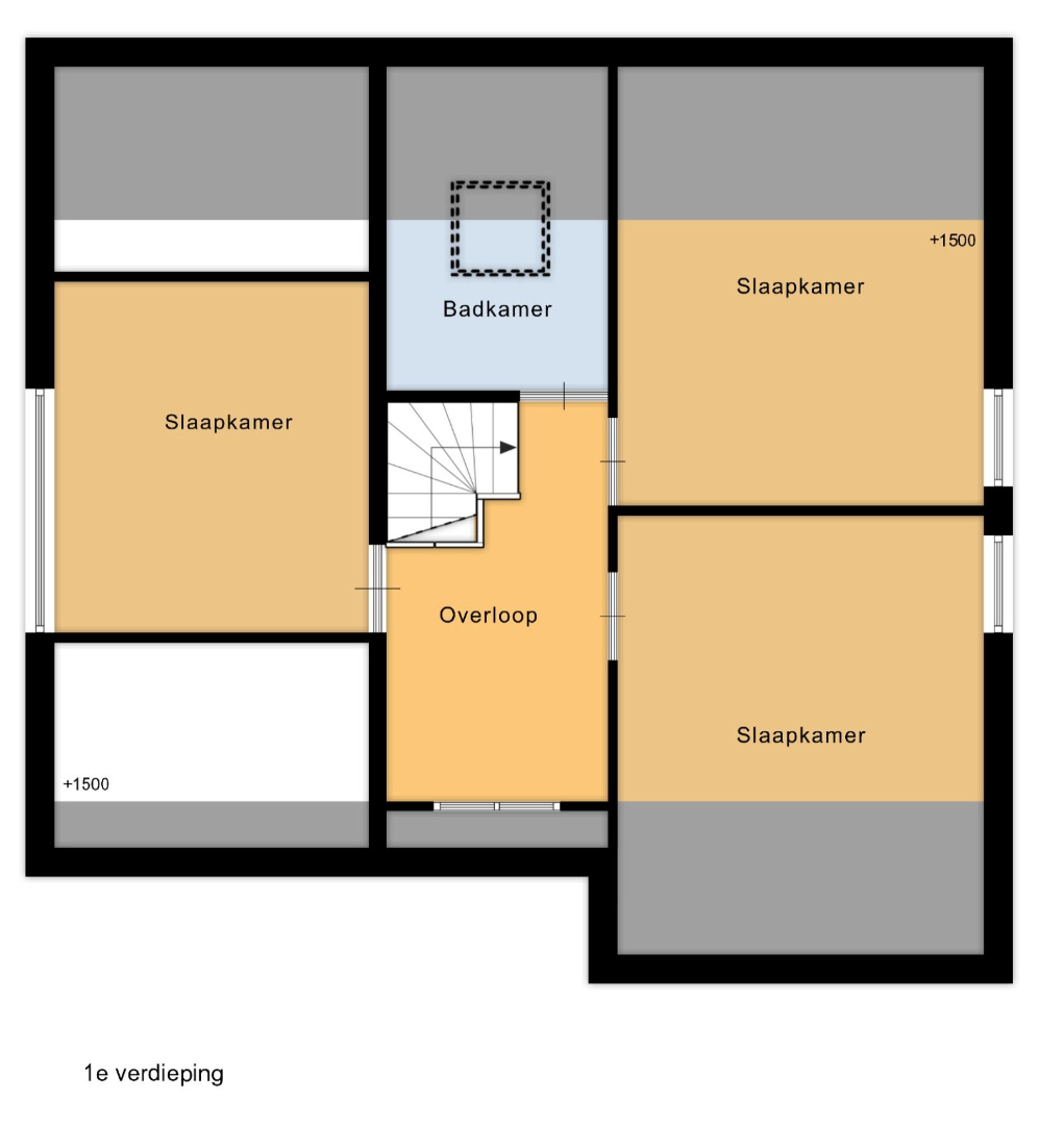 Op de eerste verdieping bevinden zich drie ruime en lichtrijke slaapkamers van respectievelijk 14,58 m², 11,59 m² en 16,87 m². De centrale badkamer is voorzien van zonnewering en biedt net dat extra comfort op zonnige dagen. De overloop zorgt voor een logische verbinding tussen de kamers en versterkt het open gevoel van deze verdieping.