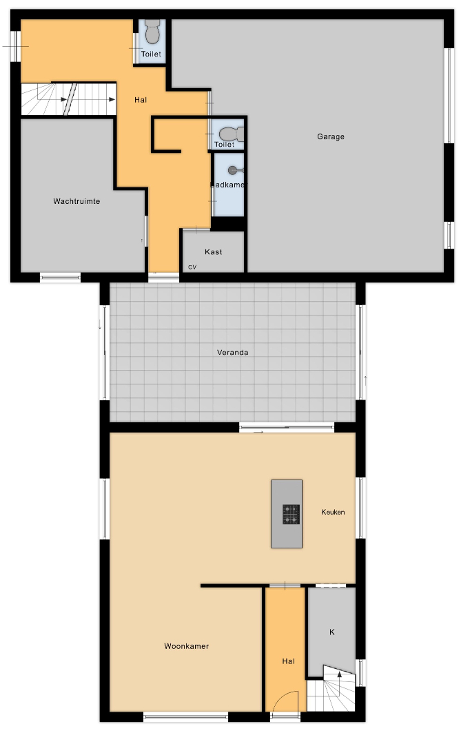 De gelijkvloerse verdieping wordt gekenmerkt door een mooie mix van openheid en geborgenheid. De inkomhal leidt rechtstreeks naar de lichtrijke leefruimte van 37 m². Grote raampartijen zorgen voor een natuurlijke lichtinval die het wooncomfort naar een hoger niveau tilt. De keuken van 14,63 m² bevindt zich achteraan en is strak ingericht met een centraal eiland, veel opbergruimte en een directe doorgang naar de veranda. Deze veranda fungeert als een aangename tussenzone richting het achterliggende deel van de woning. Verder bevinden zich op het gelijkvloers een tweede hal met gastentoilet, een badkamer met douche, een praktische wachtruimte, een technische ruimte (CV), een handige bergkast en de toegang tot de garage.
