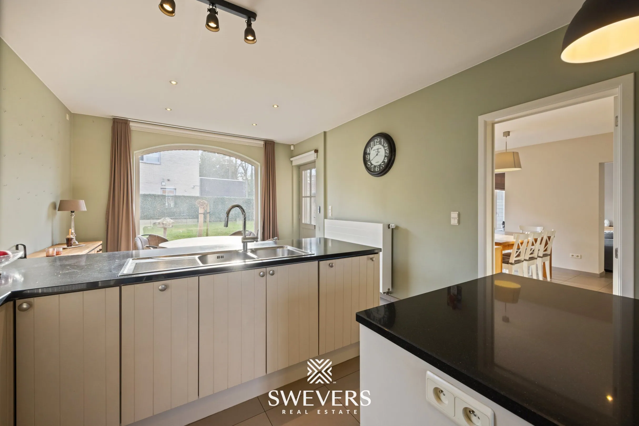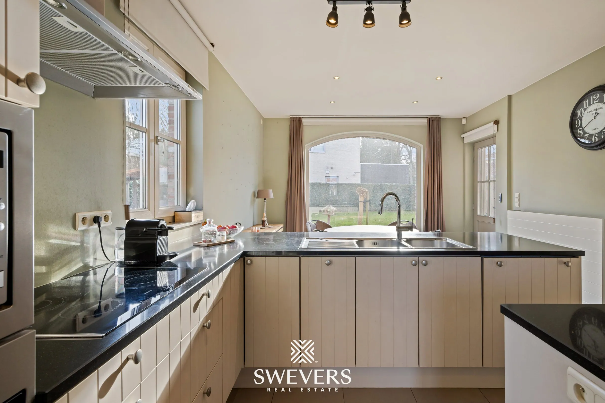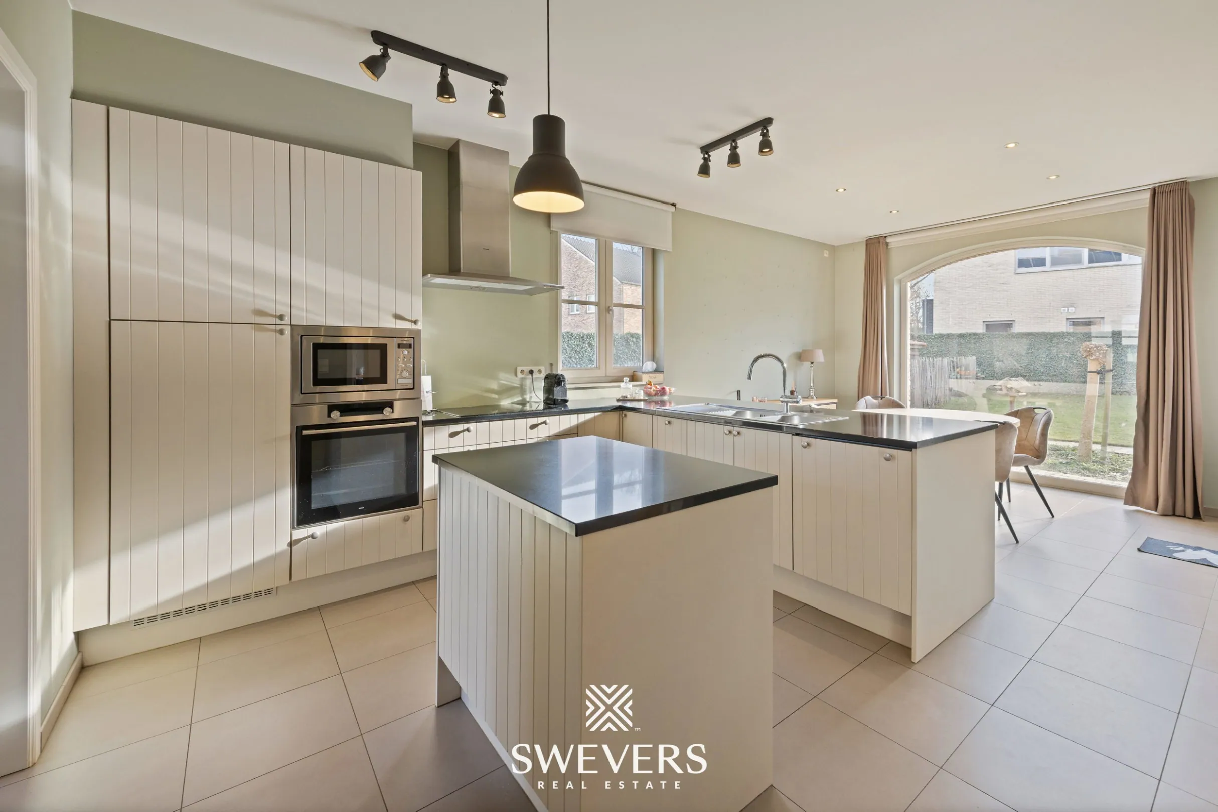 Dankzij de aanwezigheid van zonnepanelen (24 stuks, geplaatst in 2011) is ook energiezuinig wonen hier mogelijk. Op de gelijkvloerse verdieping vormt de riante leefruimte van ruim 41 m² het hart van het huis. Deze lichtrijke ruimte is uitgerust met een ingebouwde gashaard en praktische maatwerkkasten. Grote ramen bieden een rustgevend zicht op de zuidgerichte tuin met ruim terras en zonneluifel. De aanpalende leefkeuken van maar liefst 24,47 m² is perfect geïntegreerd en geeft eveneens uit op de tuin. De keuken is ruim genoeg voor een grote eettafel en vormt een uitnodigende plek voor gezellige familiemomenten. Verder vinden we op deze verdieping een aparte bureauruimte, een gastentoilet, ingebouwde vestiairekasten, een handige berging én een inpandige garage van 27 m² met groot toegangsluik naar de kelder.