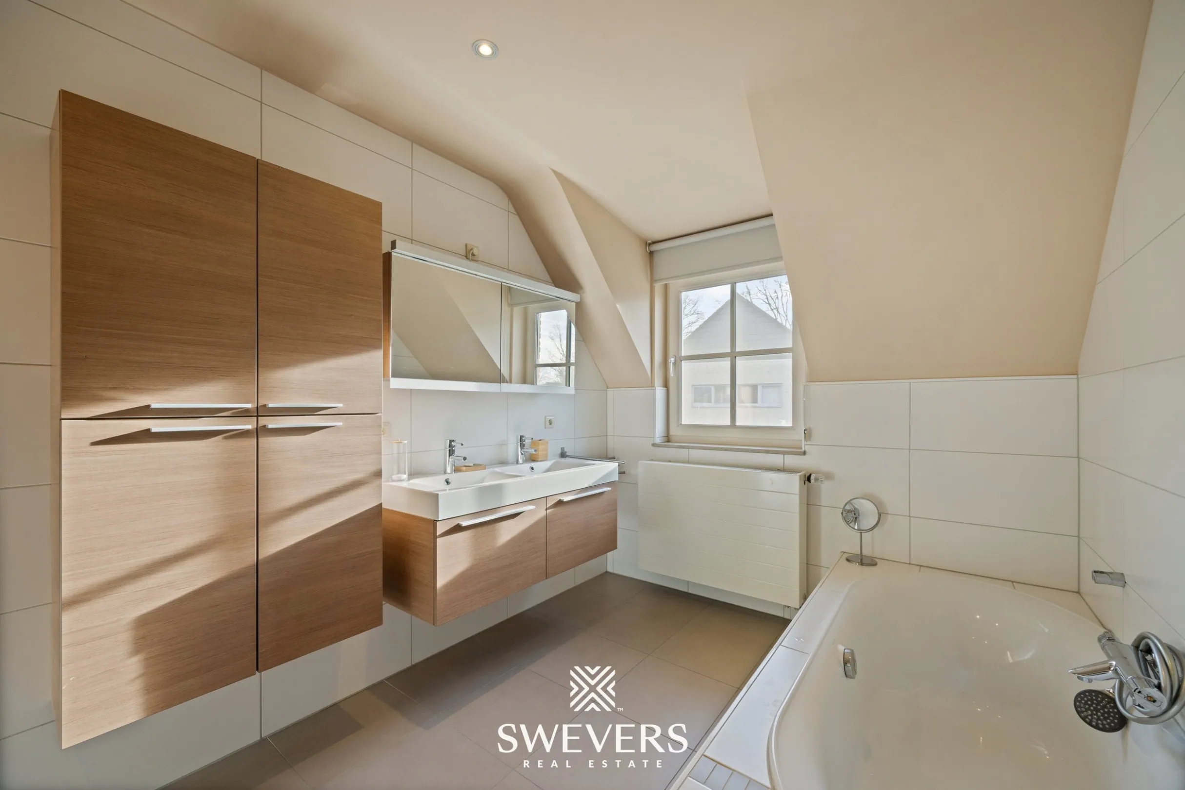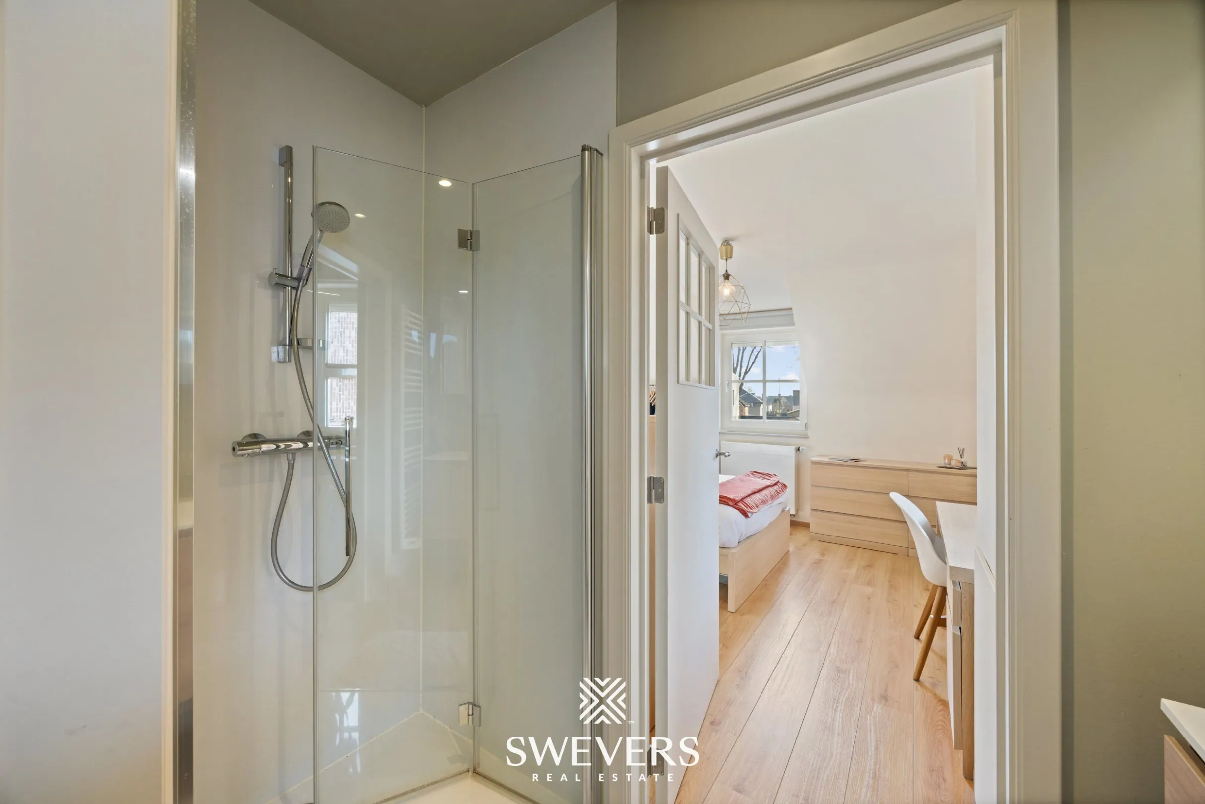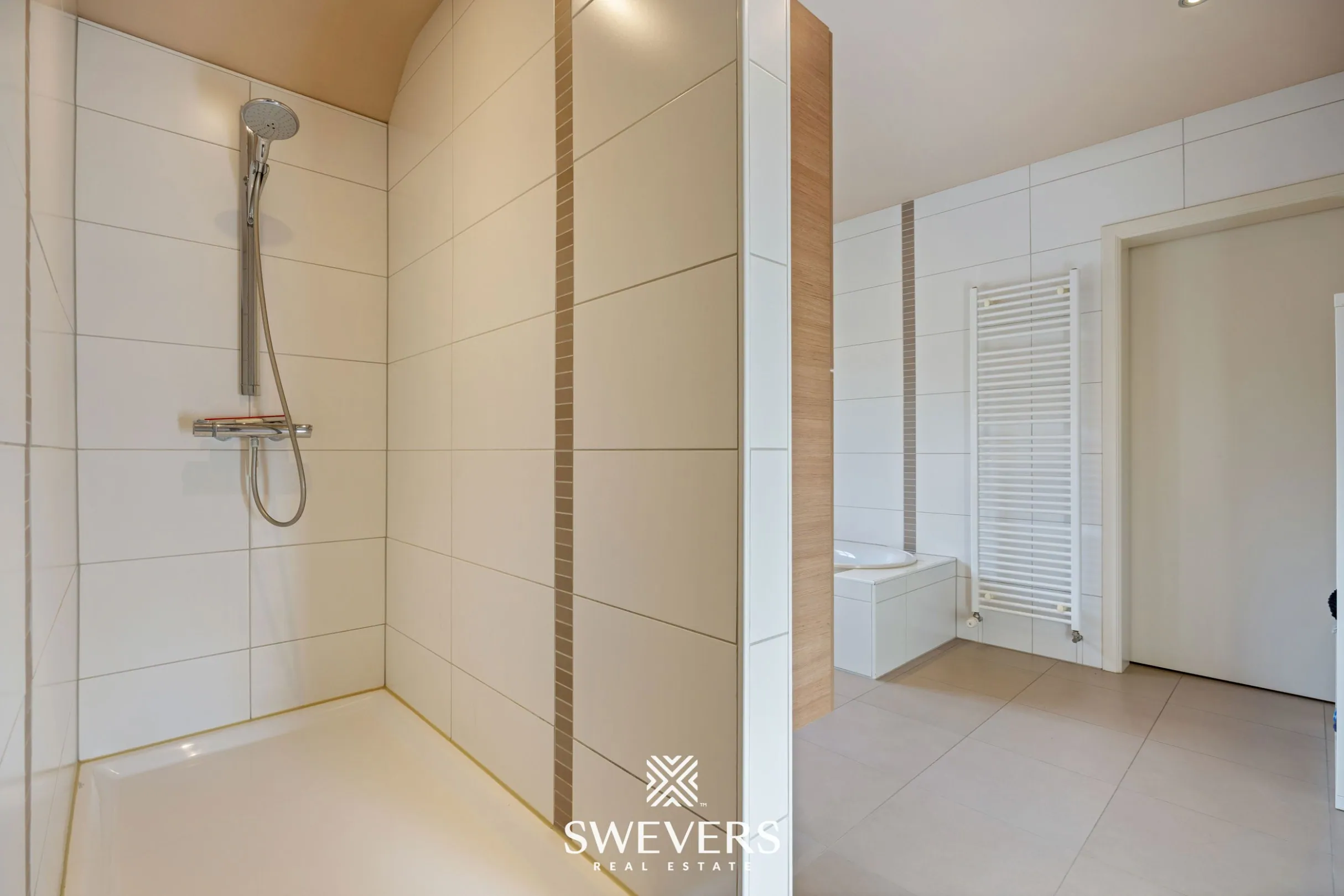 Op de eerste verdieping bevindt zich een bijzonder praktische en ruime indeling. De master bedroom van 14,67 m² is verbonden met een aparte dressing van 8,44 m². Daarnaast zijn er nog drie bijkomende slaapkamers van respectievelijk 17,02 m², 17,20 m² en 21,56 m², waarvan 3 uitgerust met airconditioning en screens. De ruime badkamer van 13,72 m² ligt centraal en beschikt over een ligbad, dubbele lavabo, douche en voldoende opbergruimte. Een extra doucheruimte, strategisch gelegen tussen de kinderkamers, verhoogt het dagelijks comfort. Ook is er op deze verdieping een wasplaats aanwezig, opnieuw een voorbeeld van de slimme indeling. Een afzonderlijk toilet vervolledigt het geheel.
