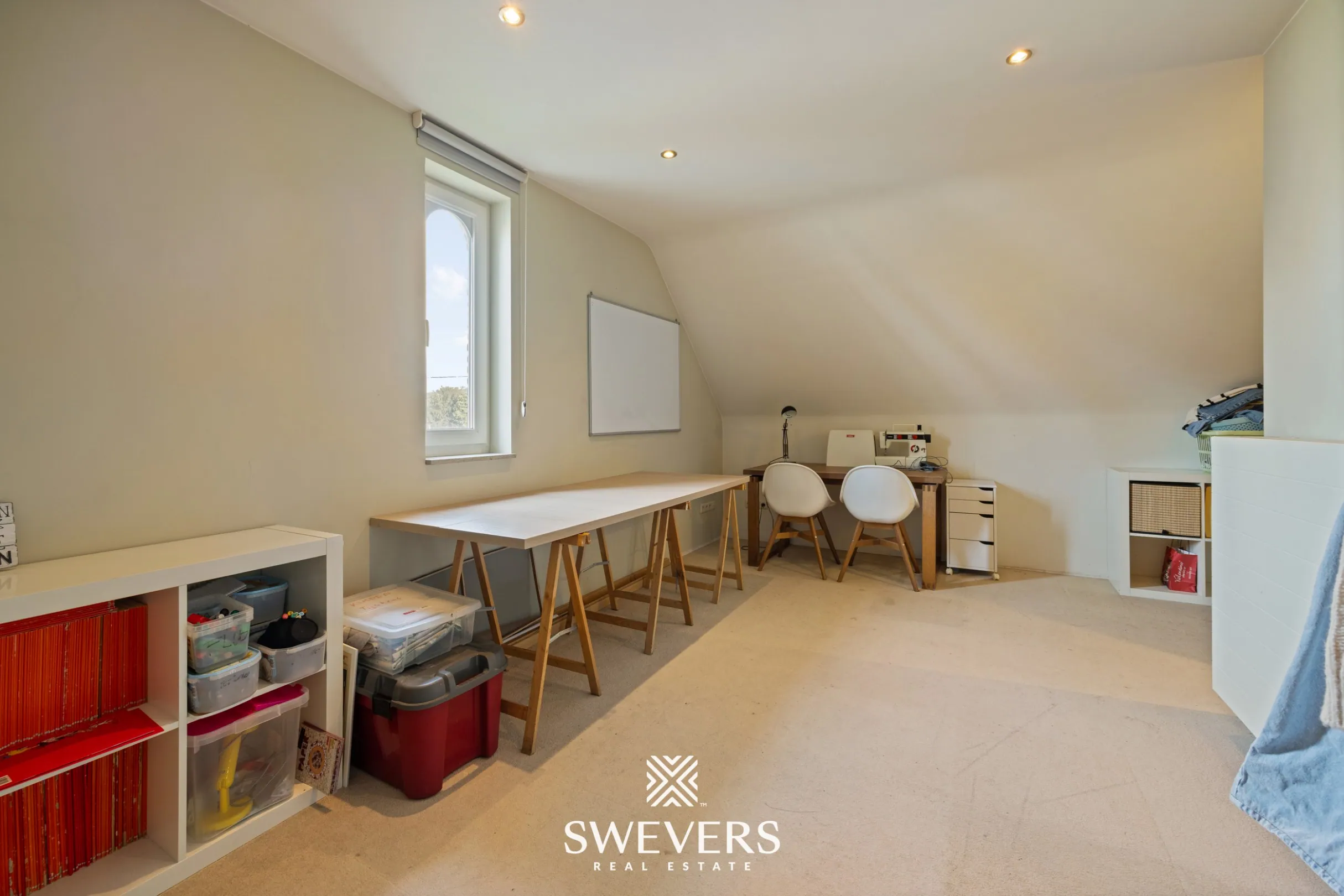 De zolderverdieping is bereikbaar via een uittrektrap en biedt 49 m² extra bergruimte. Deze ruimte is niet ingericht als volwaardige woonlaag, maar ideaal voor het opbergen van seizoensgebonden spullen of archiefmateriaal.