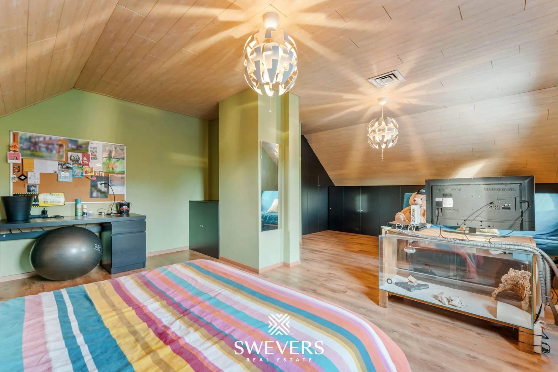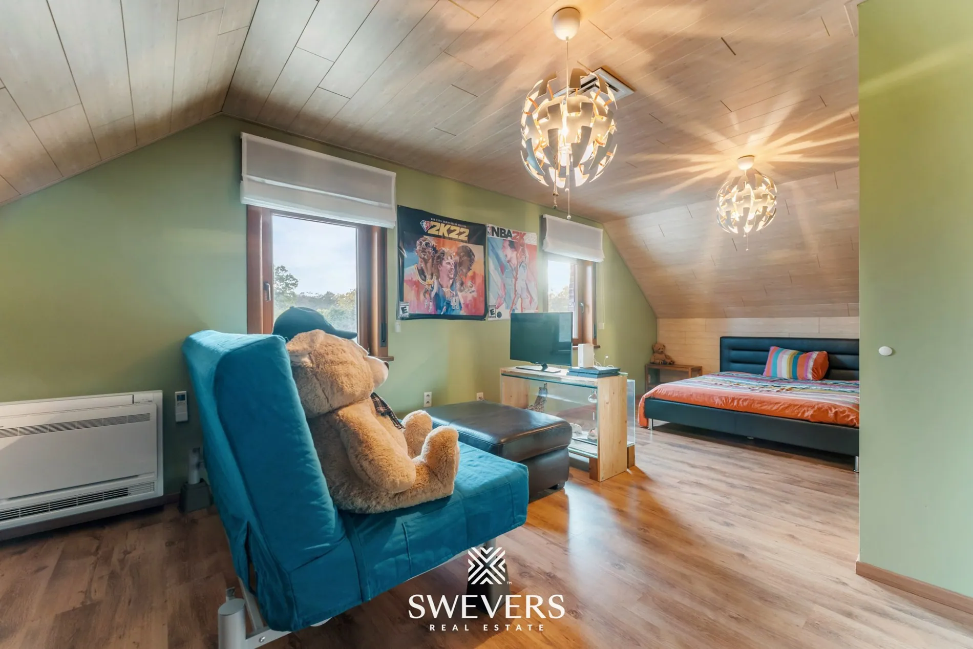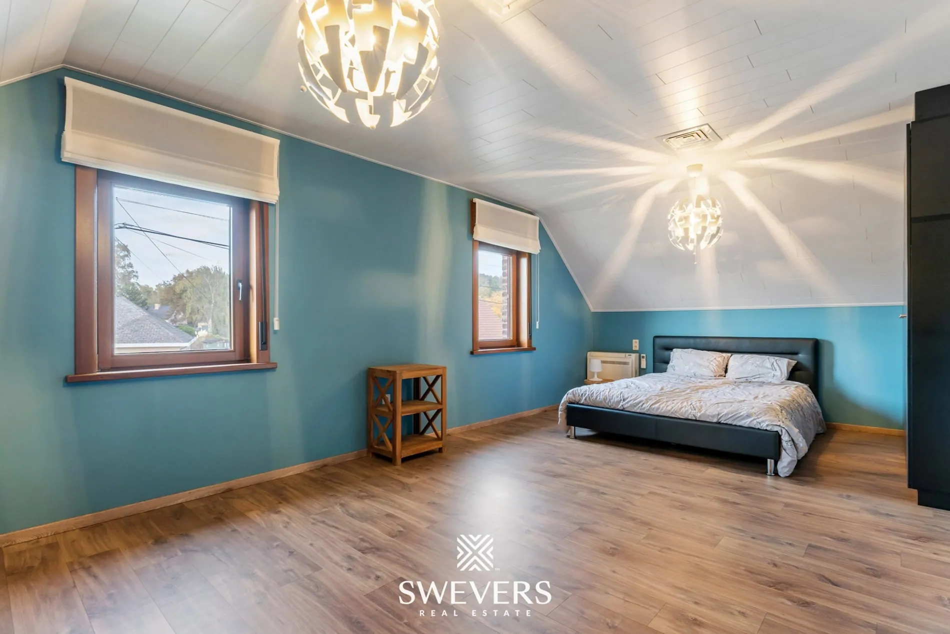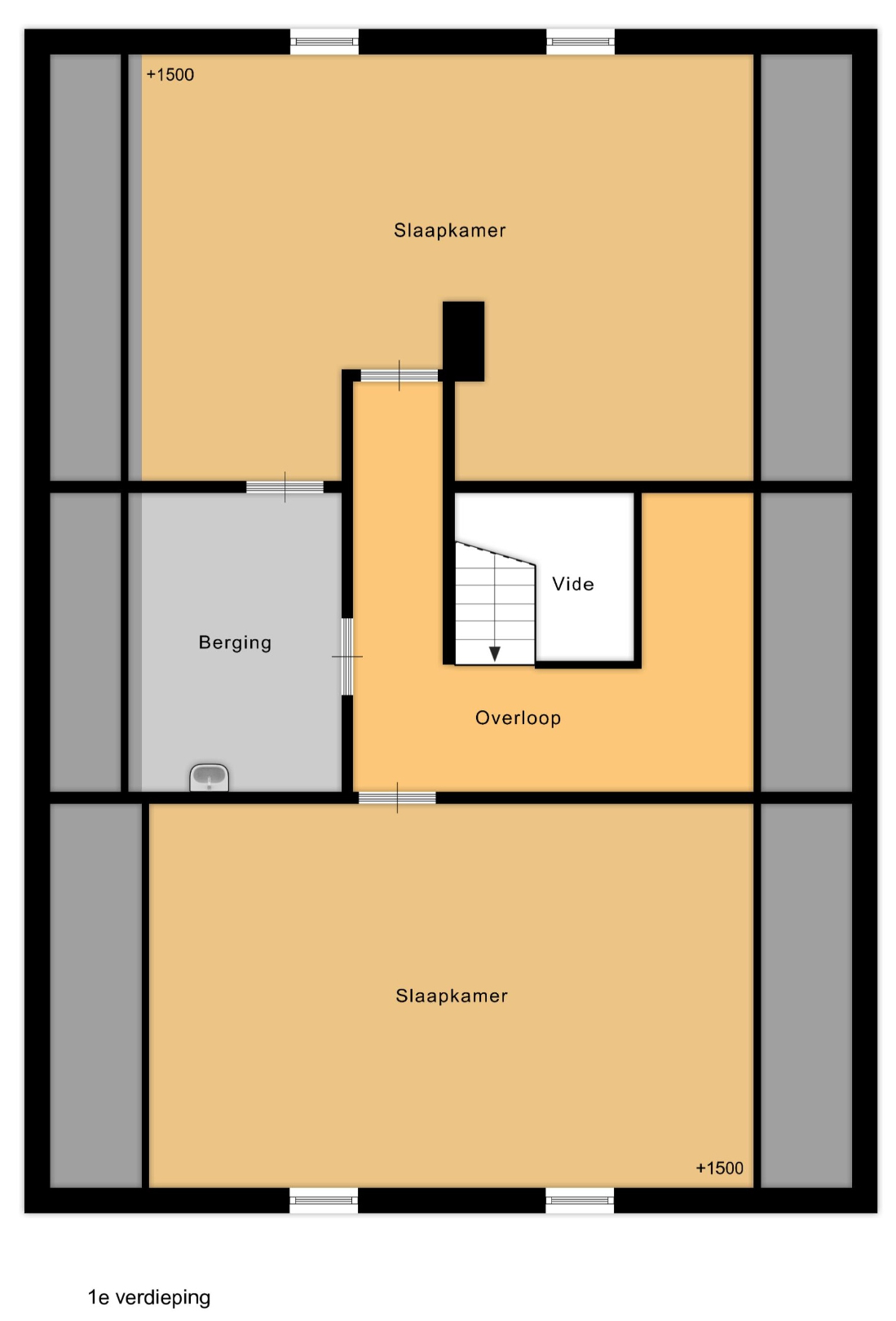 Op de eerste verdieping, volledig gerenoveerd in 2015, vindt u twee uitzonderlijk ruime slaapkamers. De grootste aan de voorzijde meet maar liefst 35,5 m², terwijl de tweede kamer met haar 31,95 m² eveneens alle comfort biedt. Beide kamers zijn lichtrijk en bieden voldoende ruimte voor een volwaardige slaap-, werk- en ontspanningszone. Een praktische overloop met vide en extra bergruimte vervolledigt deze verdieping.
