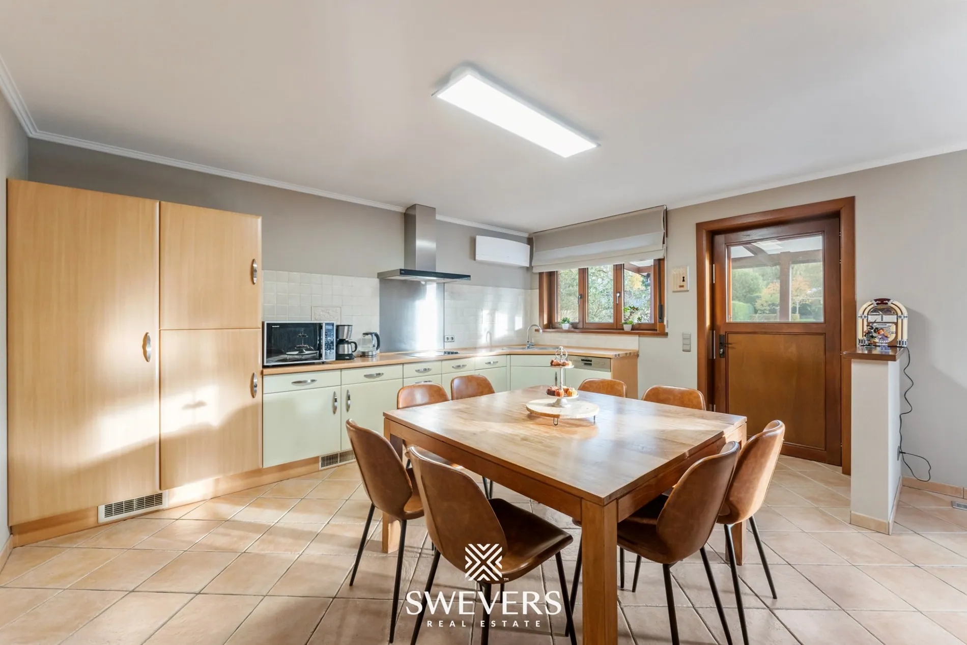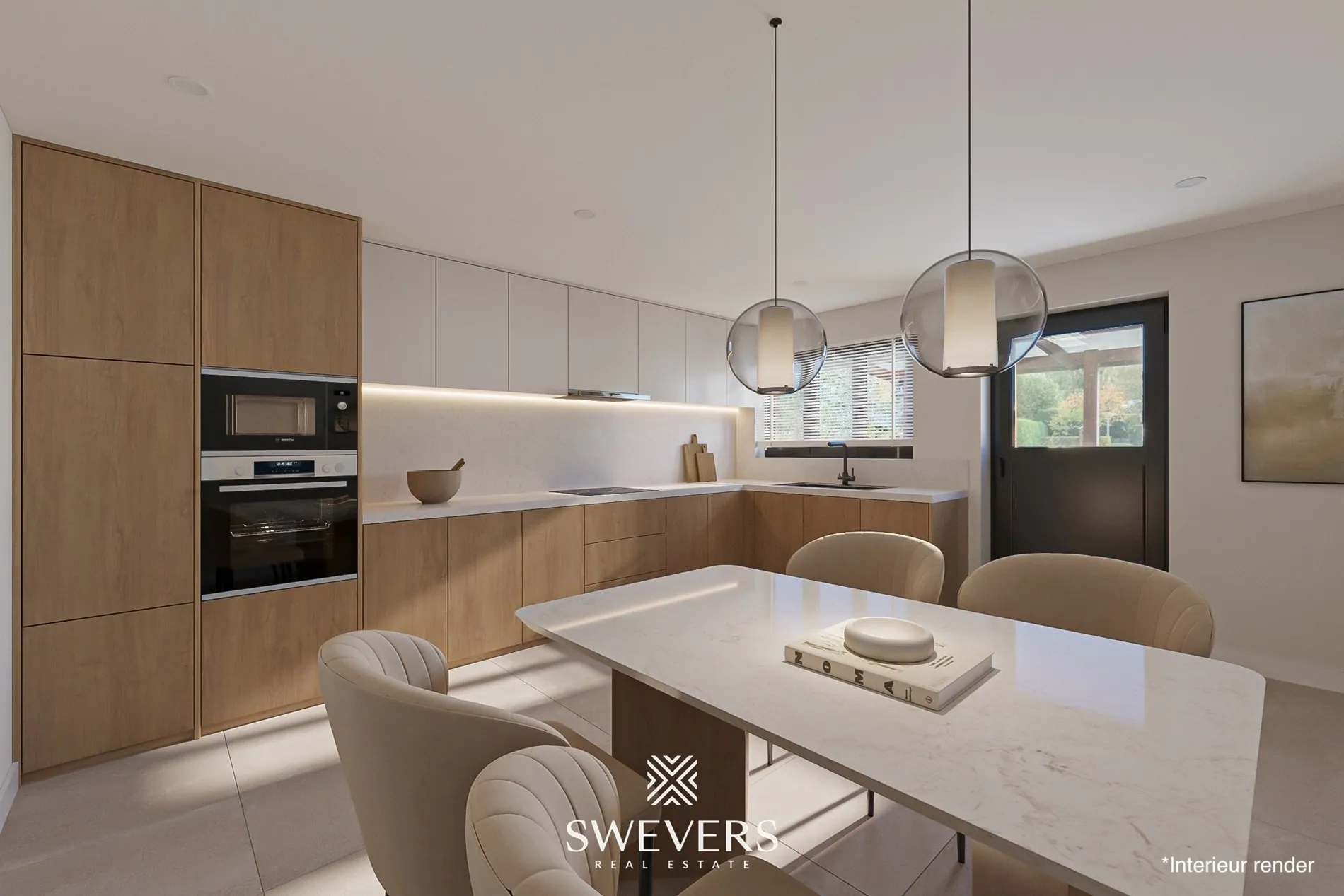 De rechterzijde van het gelijkvloers is gewijd aan het gezinsleven met een leefkeuken van 23 m² die naadloos overloopt naar het zuidgerichte terras. De aangrenzende zithoek van 23,3 m² baadt in natuurlijk licht dankzij de grote raampartijen en vormt het perfecte decor voor gezellige familiemomenten.