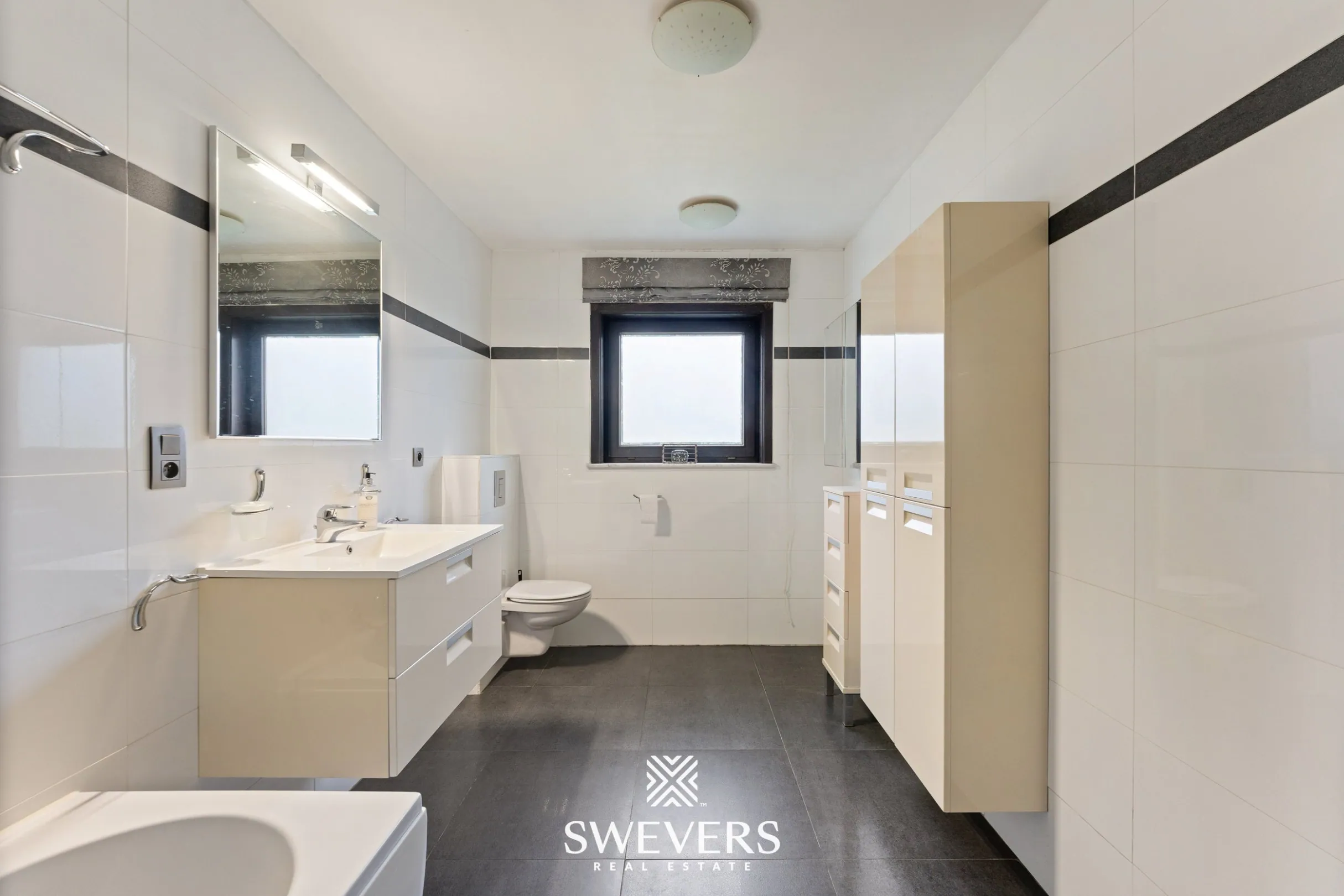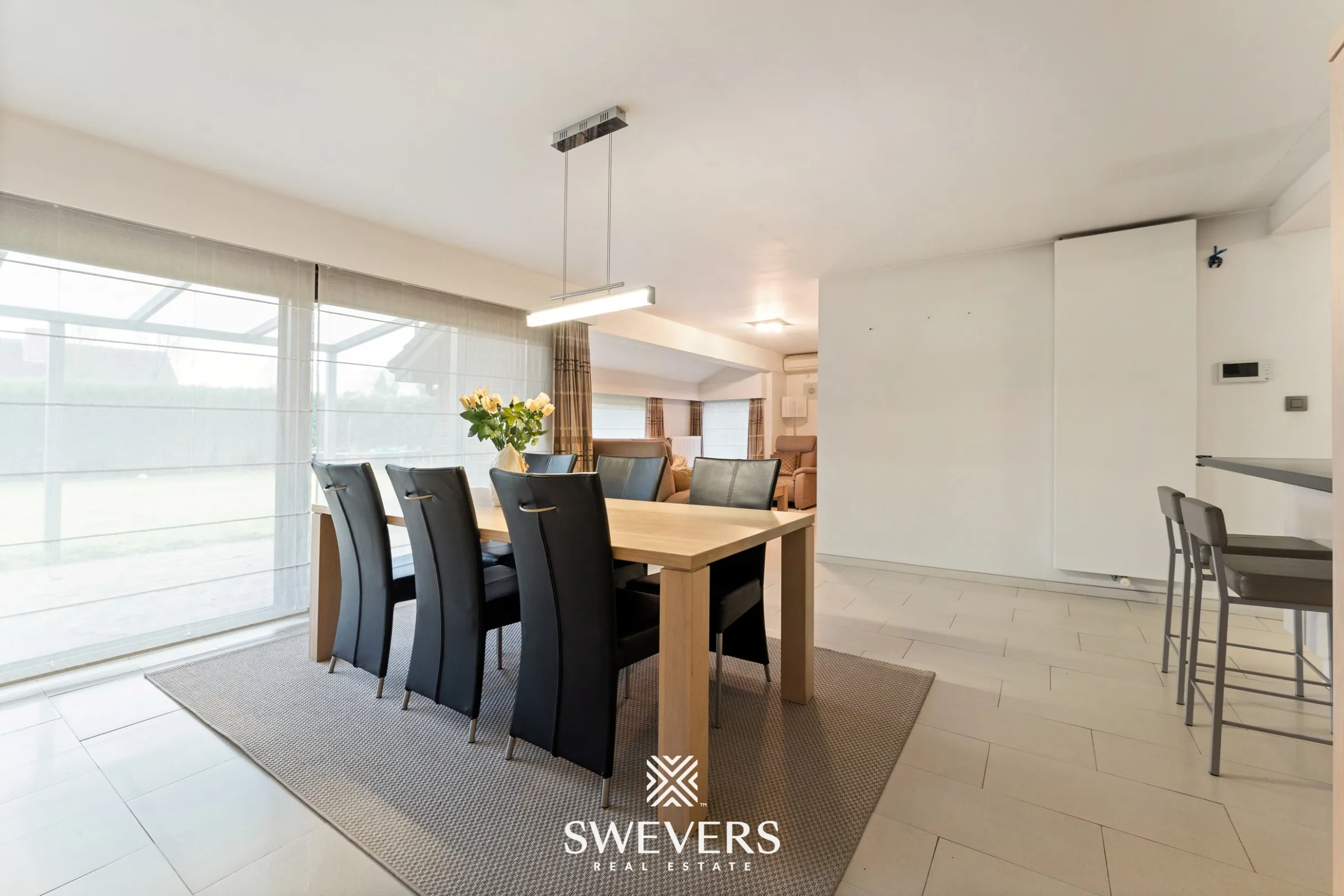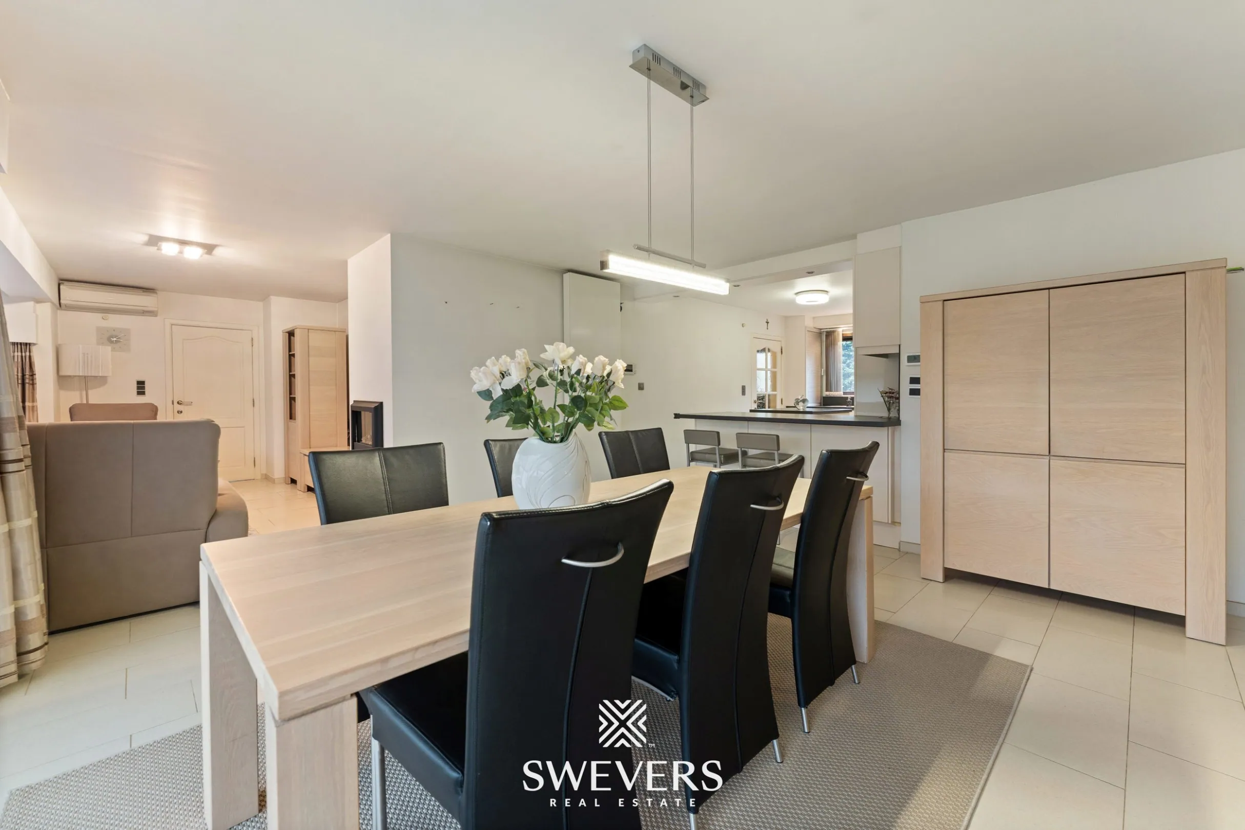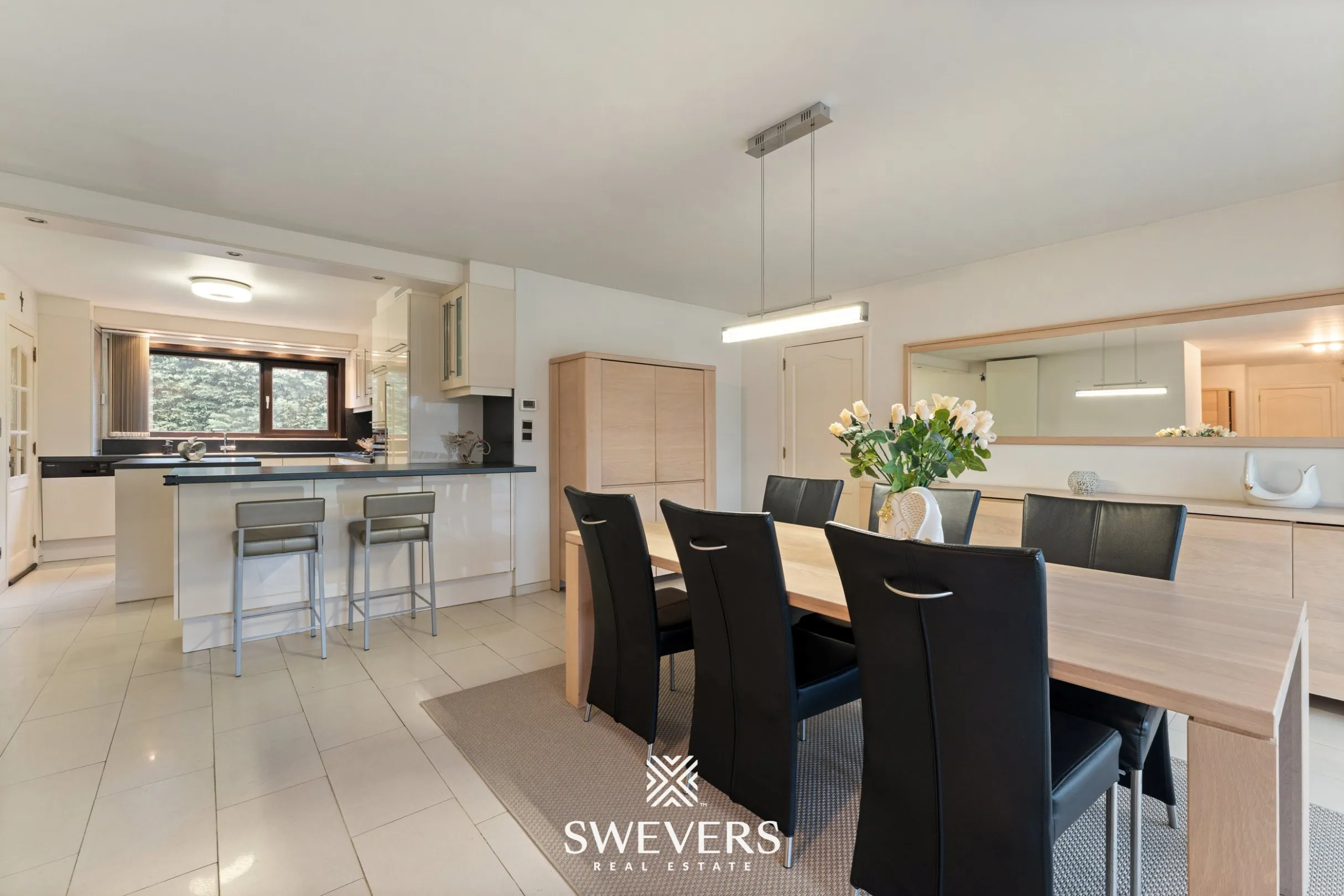 Via de inkomhal met gastentoilet stap je binnen in een bijzonder aangename leefomgeving. De woonkamer van 16,80 m² en eetkamer van 21,6 m² baden in het licht dankzij meerdere raampartijen en geniet van een knusse maar open sfeer. Aansluitend bevindt zich de aparte keuken van 8,51 m², perfect geplaatst, afgescheiden maar toch in contact met de leefruimte. Bovendien biedt de keuken directe toegang tot de praktische berging en ruime garage, wat zorgt voor een vlotte dagelijkse flow.