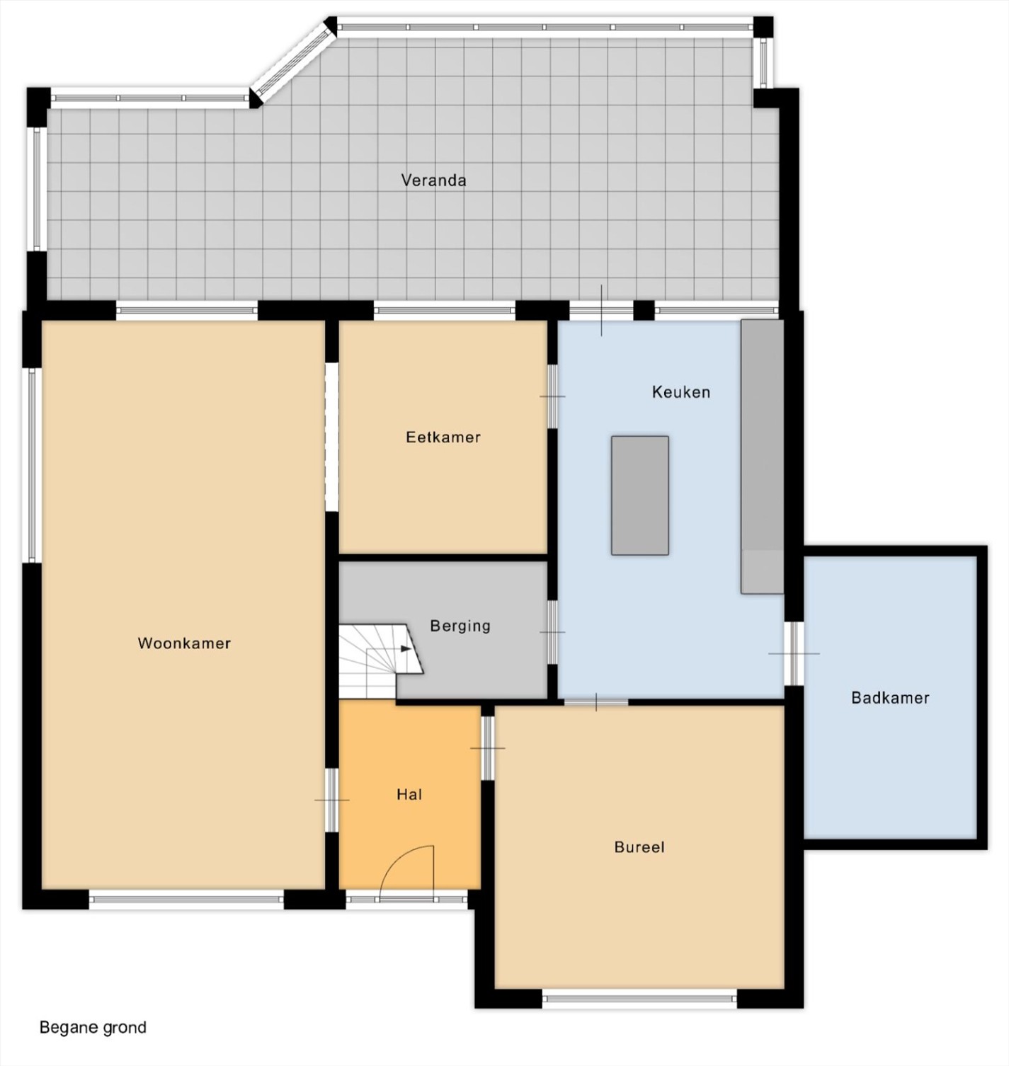 De begane grond opent met een centrale hal die toegang geeft tot de verschillende leefruimtes. De woonkamer, met een oppervlakte van maar liefst 43,21 m², geniet van een mooie lichtinval en biedt uitzicht op de tuin. Aansluitend ligt de eetkamer die via een open doorgang naadloos overgaat in de moderne keuken van 17,66 m². Deze keuken biedt plaats voor een eettafel en heeft een functionele kastenwand. Een koele berging is ingewerkt onder de trap. Grenzend aan de keuken bevindt zich de ruime veranda, perfect voor gezellige familiemomenten. Verder vinden we op deze verdieping nog een eerste badkamer en een ruime slaapkamer ( 16,36m²) die zeker ook dienst kan doen als bureau of praktijkruimte.