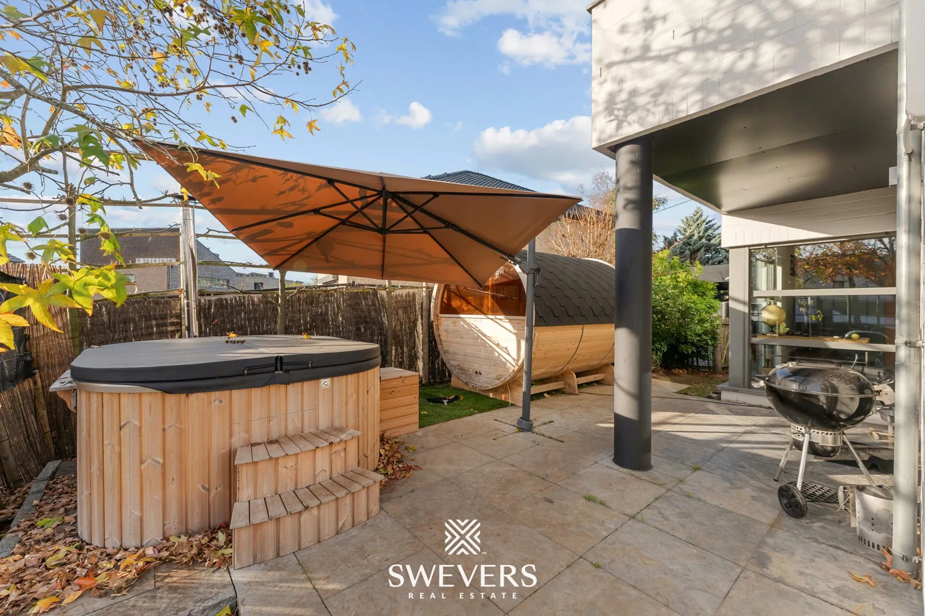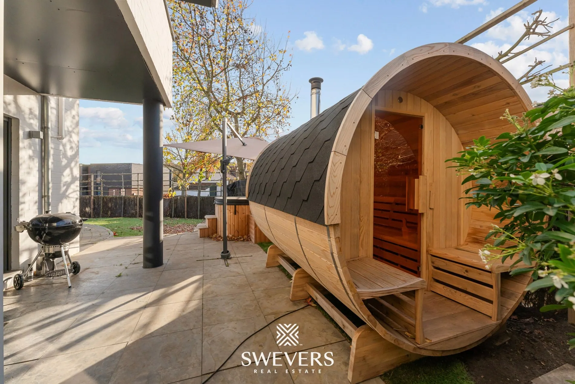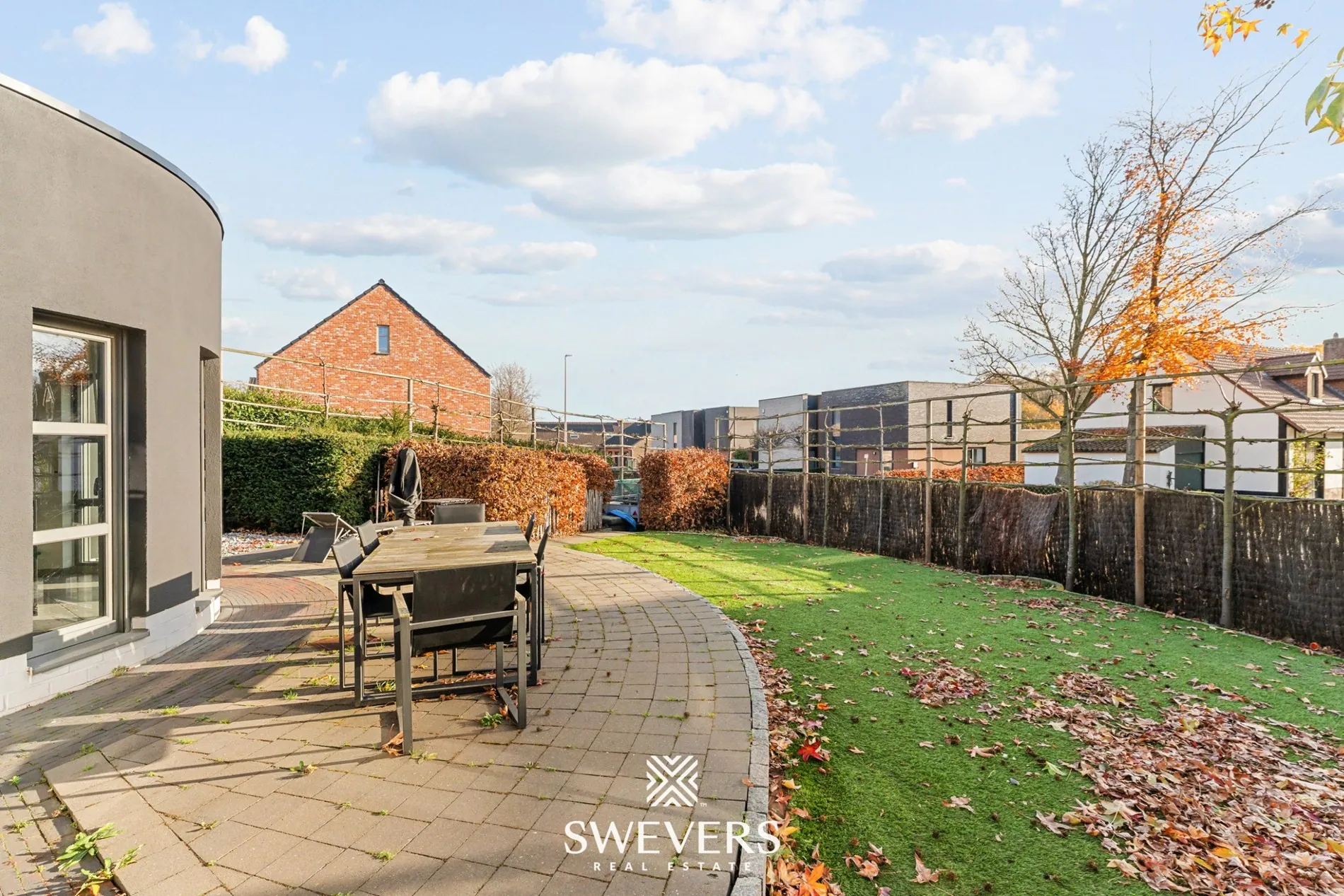 perceel en meteen voel je de rust en privacy die deze plek omarmt. De onderhoudsvriendelijke tuin, zuid-oost georiënteerd en aangelegd met kunstgras, vormt een heerlijk verlengstuk van de leefruimtes. Hier zie je jezelf straks ontspannen ontbijten in de ochtendzon of geniet je samen met vrienden van lange zomeravonden in een uitnodigende buitenomgeving.
