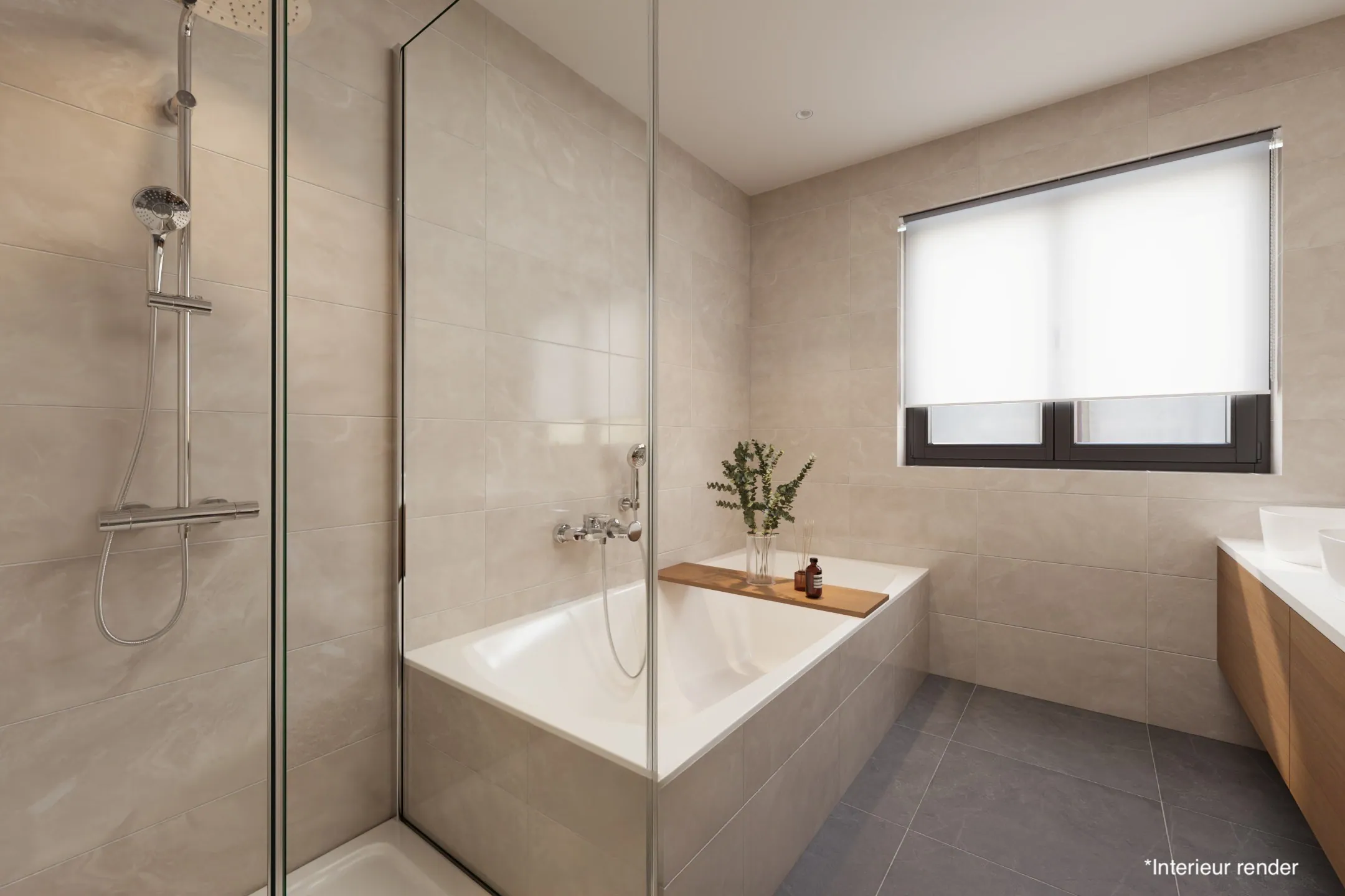 Op de begane grond ligt de focus op een praktische indeling en maximale lichtinval. De inkomhal geeft toegang tot een gastentoilet en leidt meteen naar de ruime leefruimte van 39,60 m². De zithoek en eethoek vormen een open geheel met zicht op de tuin en het terras. Aansluitend bevindt zich de aparte keuken van 16 m², waar voldoende plaats is voor een gezellige ontbijttafel. Vanuit de keuken is er directe toegang tot het terras. De gelijkvloerse badkamer is praktisch ingericht met een dubbel lavabomeubel, ligbad en douche. Ook de eerste slaapkamer bevindt zich op dit niveau, wat de woning levensloopbestendig maakt. Daarnaast is er nog een berging met aansluitingen voor wasmachine en droogkast, en directe toegang tot de inpandige garage.