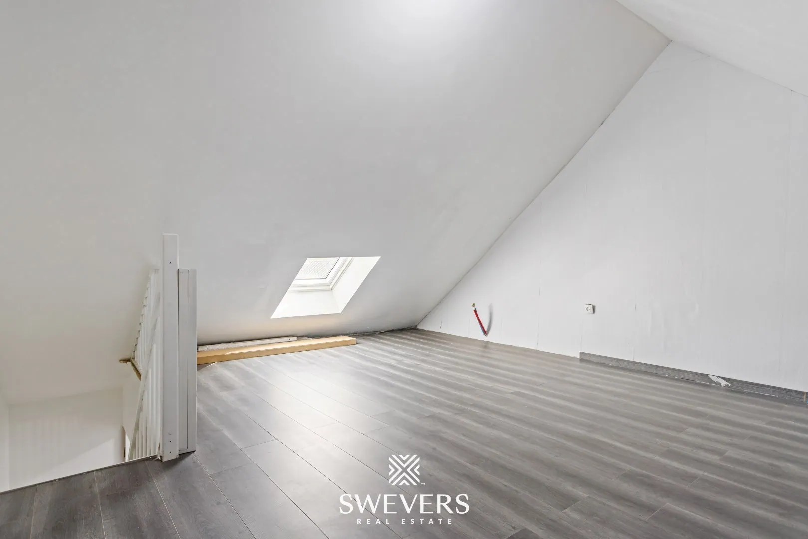 De tweede verdieping is ingericht als zolderruimte, maar door de vaste trap en de mooie afmetingen werd deze slim benut als derde slaapkamer. Deze kamer is 20 m² groot en biedt dankzij de dakraam een heldere, rustige plek, perfect voor tieners of als hobbyruimte. Het schuine dak zorgt voor karakter, terwijl de nuttige vloeroppervlakte ten volle wordt benut.