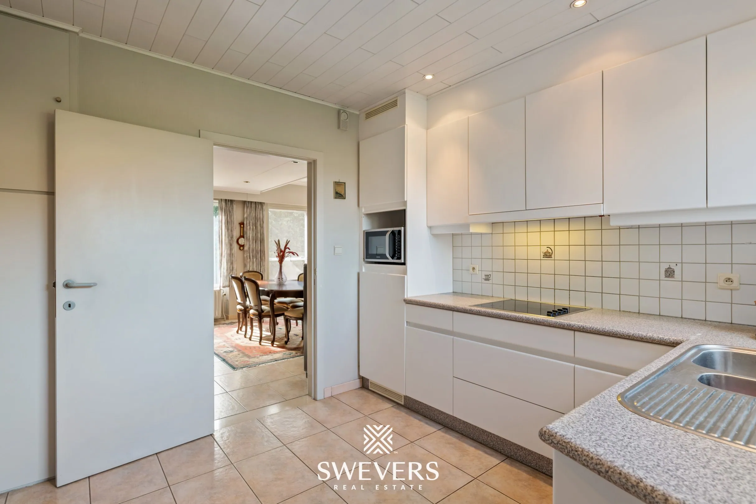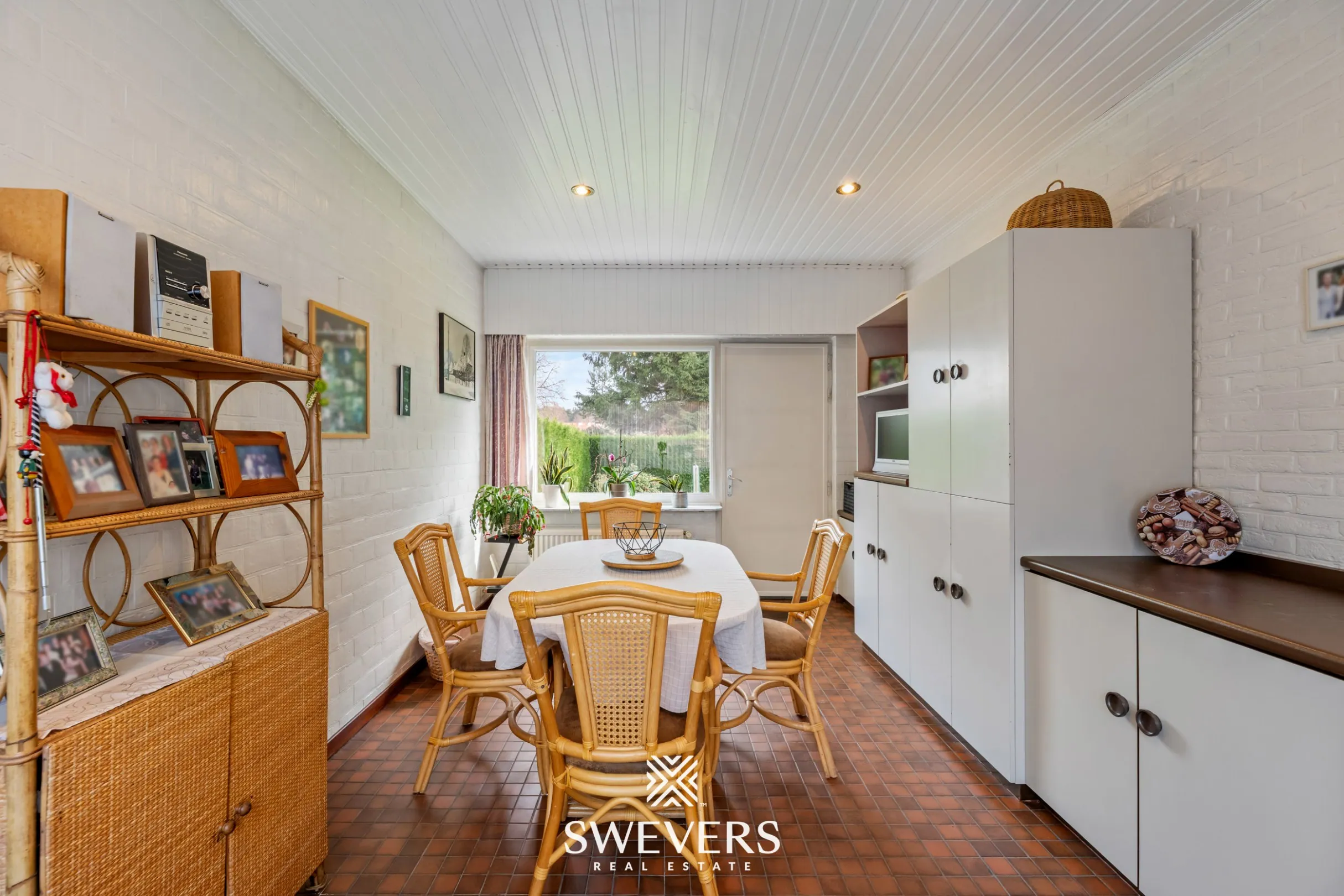 Verder op het gelijkvloers bevindt zich een extra ruimte die momenteel ingericht is als ontbijthoek. Deze zone kan eenvoudig aangepast worden naar een bureau, speelruimte of hobbykamer, afhankelijk van de noden. Vanuit deze ruimte is er ook toegang tot het terras, wat het binnen- en buitenleven mooi met elkaar verbindt.
