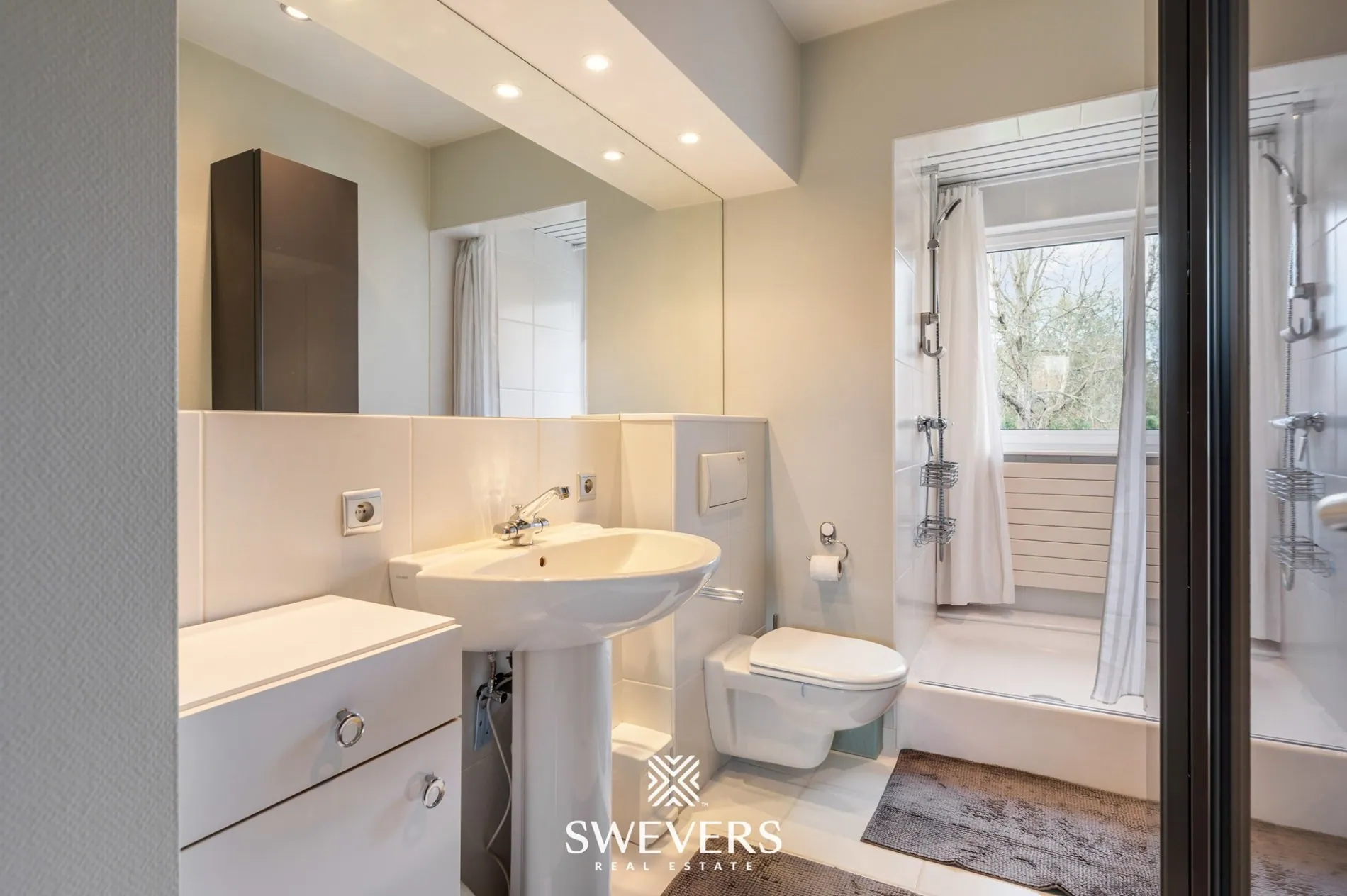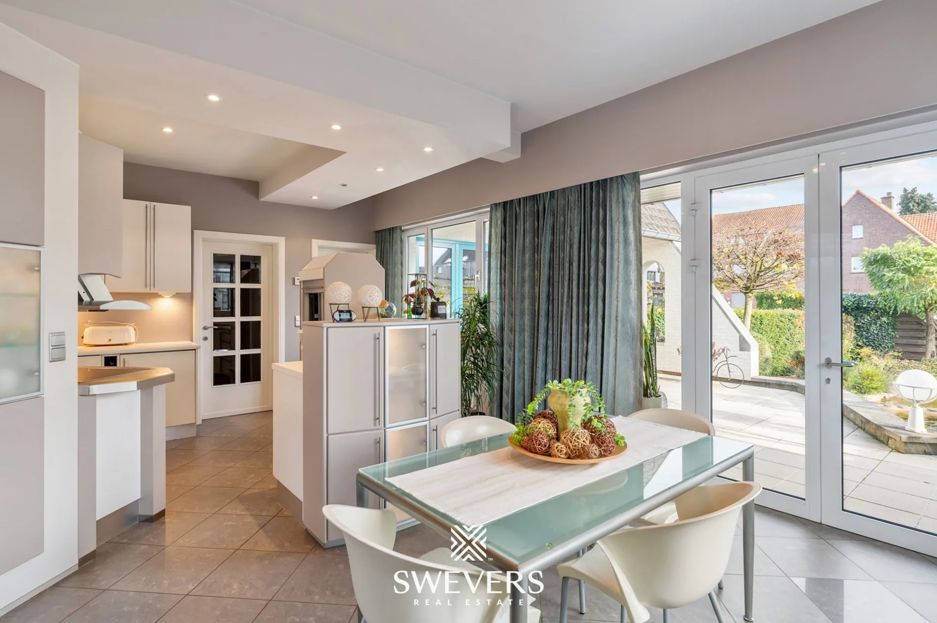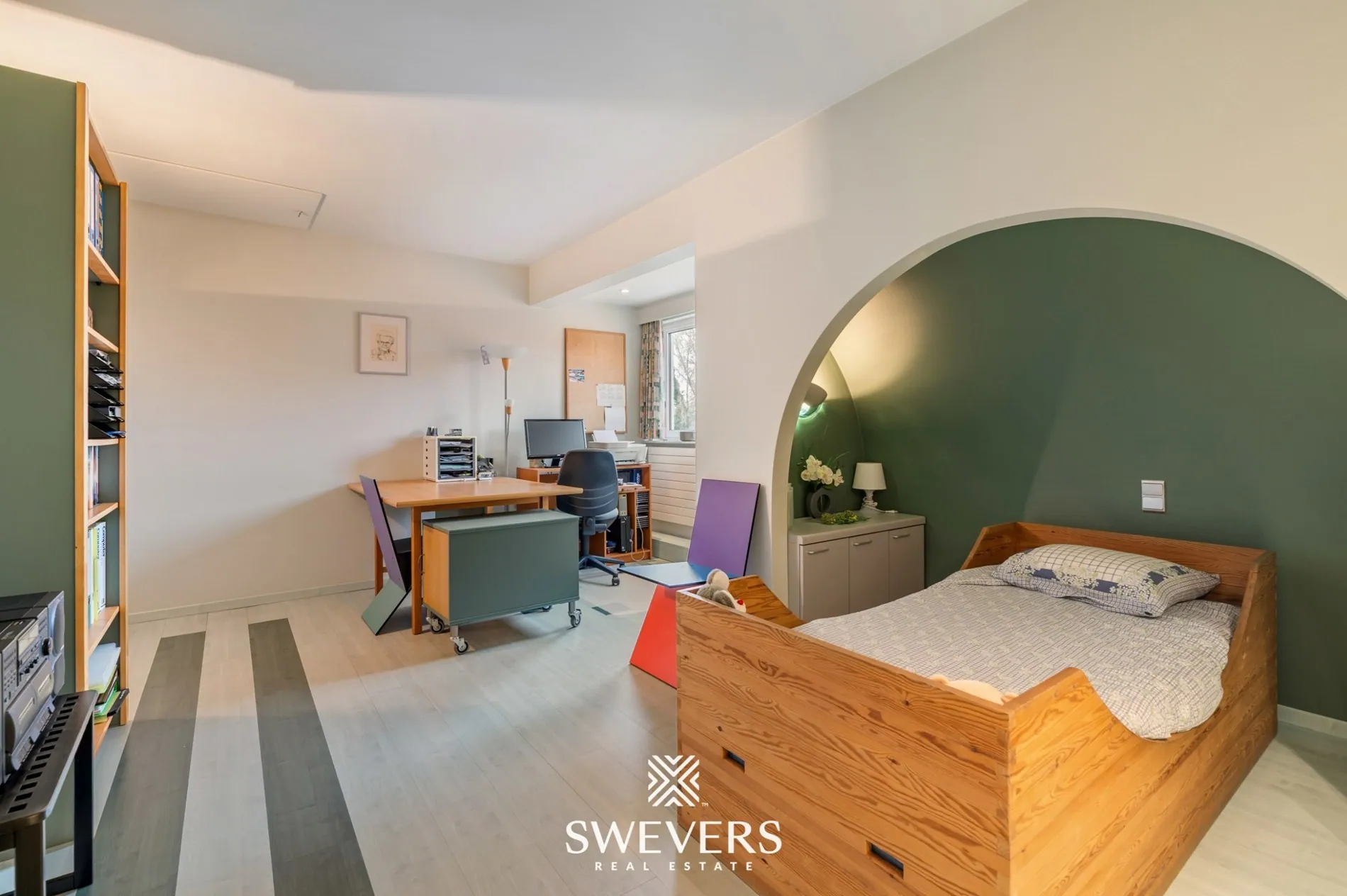 De sas aan de achterzijde en de terraszone vooraan zorgen voor een vlotte verbinding met de tuin. Daarnaast bevinden zich op deze verdieping een volledig ingerichte badkamer, een afzonderlijk gastentoilet en een bureauruimte die perfect dienst kan doen als thuiswerkplek of extra kamer.