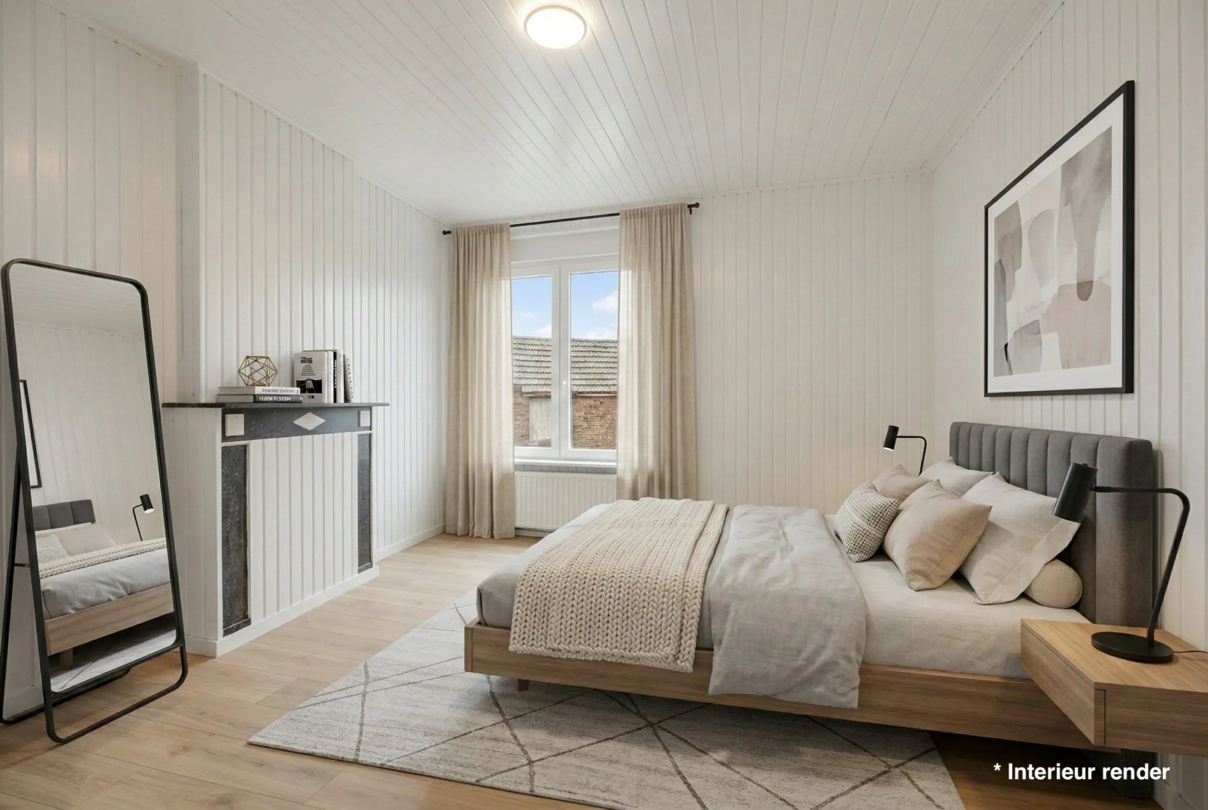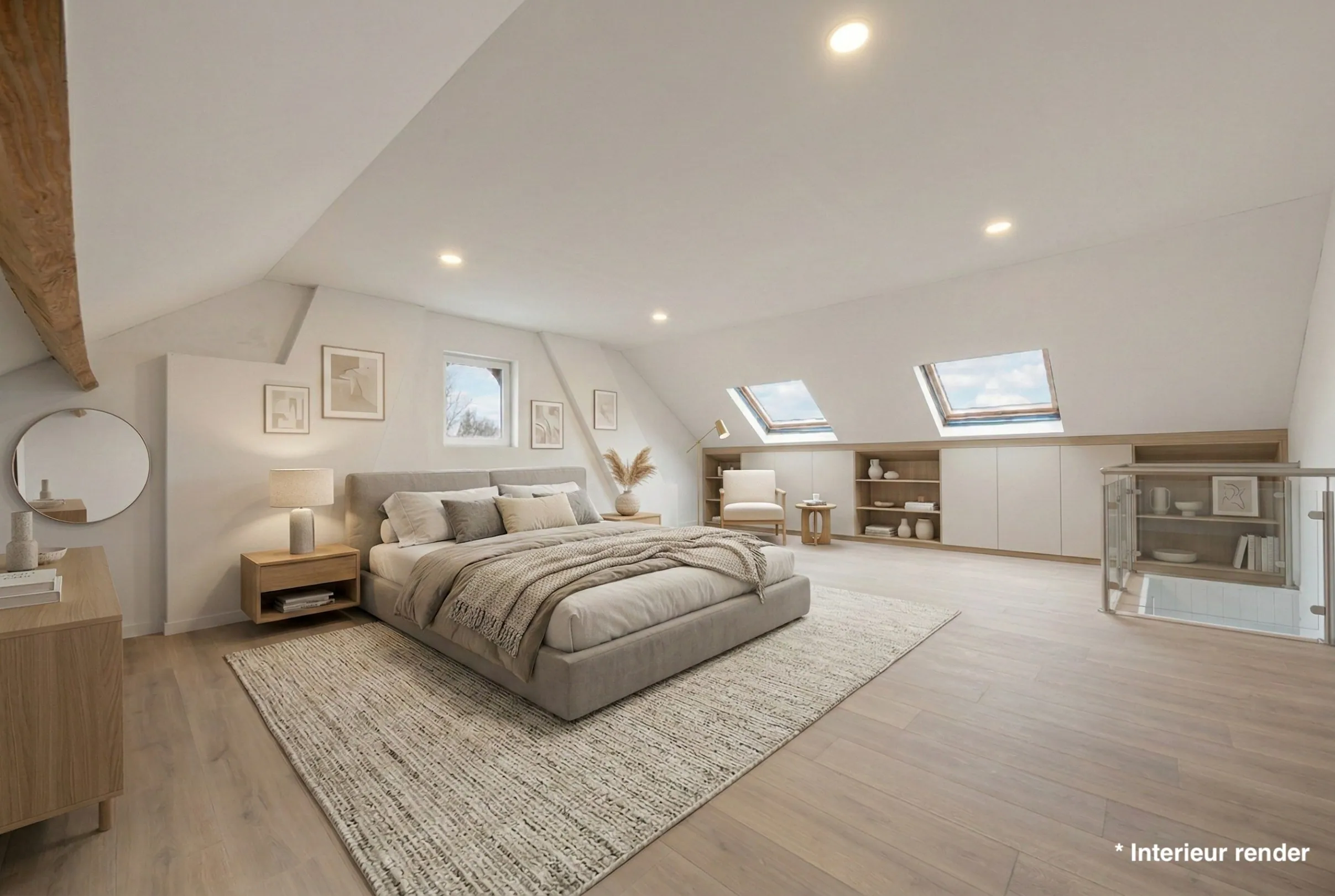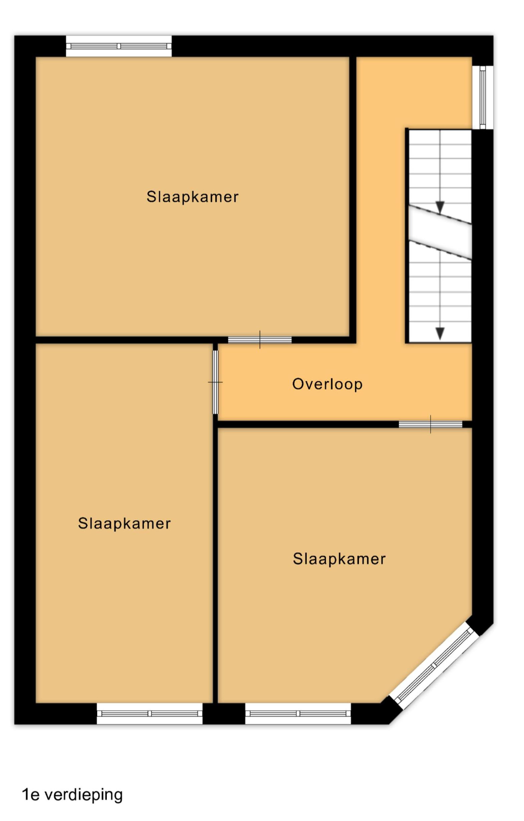De eerste verdieping omvat drie slaapkamers. Elke kamer beschikt over voldoende ruimte om in te richten als volwaardige slaapkamer. De indeling maakt het mogelijk om naast een bed ook kasten of een bureau te plaatsen. Dit biedt perspectief voor wie extra ruimte wenst voor een dressing of thuiswerkplek. De kamers zijn vlot bereikbaar via de centrale nachthal.