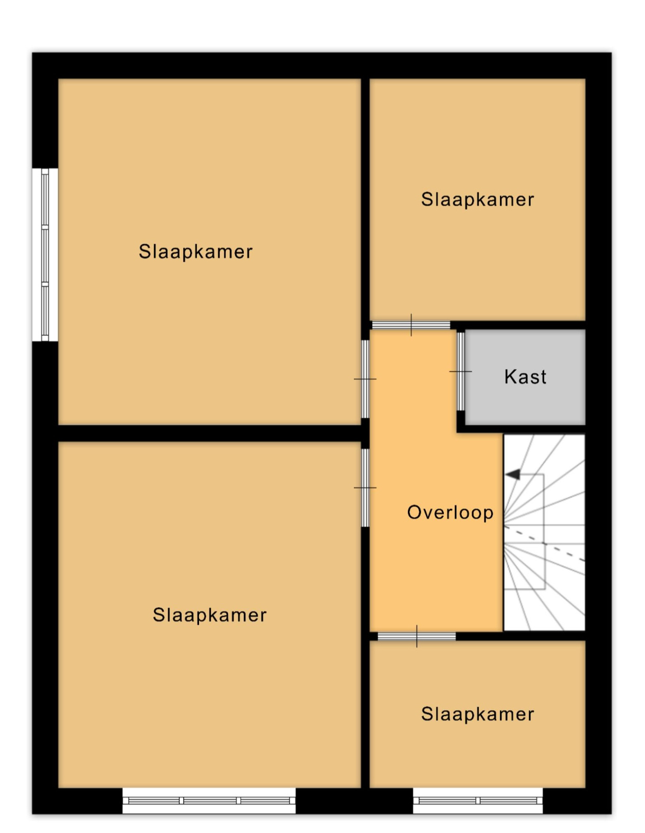 Op de twee verdiepingen bevinden zich vier slaapkamers, met oppervlaktes van 14 m², 14 m², 7 m² en 14 m². Ook op de verdieping bevindt zich nog een tweede badkamer. Hierdoor is er ruimte genoeg voor een gezin, een bureau of hobbykamer. Met de juiste inrichting kan elke kamer een comfortabele en functionele plek worden waar iedereen zijn eigen ruimte vindt.
