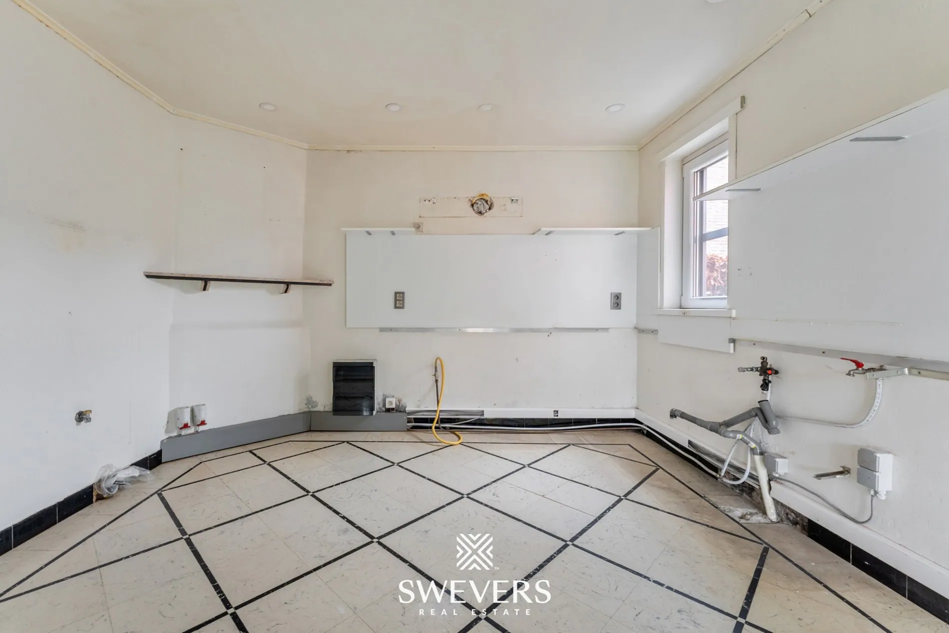 Aansluitend bevindt zich de keuken van 15,20 m². De ruimte is praktisch opgevat en biedt voldoende werk- en bergruimte. Vanuit de keuken is er toegang tot de veranda, die in 2017 werd geplaatst. Dit is een aangename extra leefruimte met zicht op de tuin. Verder bevinden zich op het gelijkvloers een badkamer met toilet en een berging. De badkamer werd eveneens vernieuwd en is functioneel ingericht.