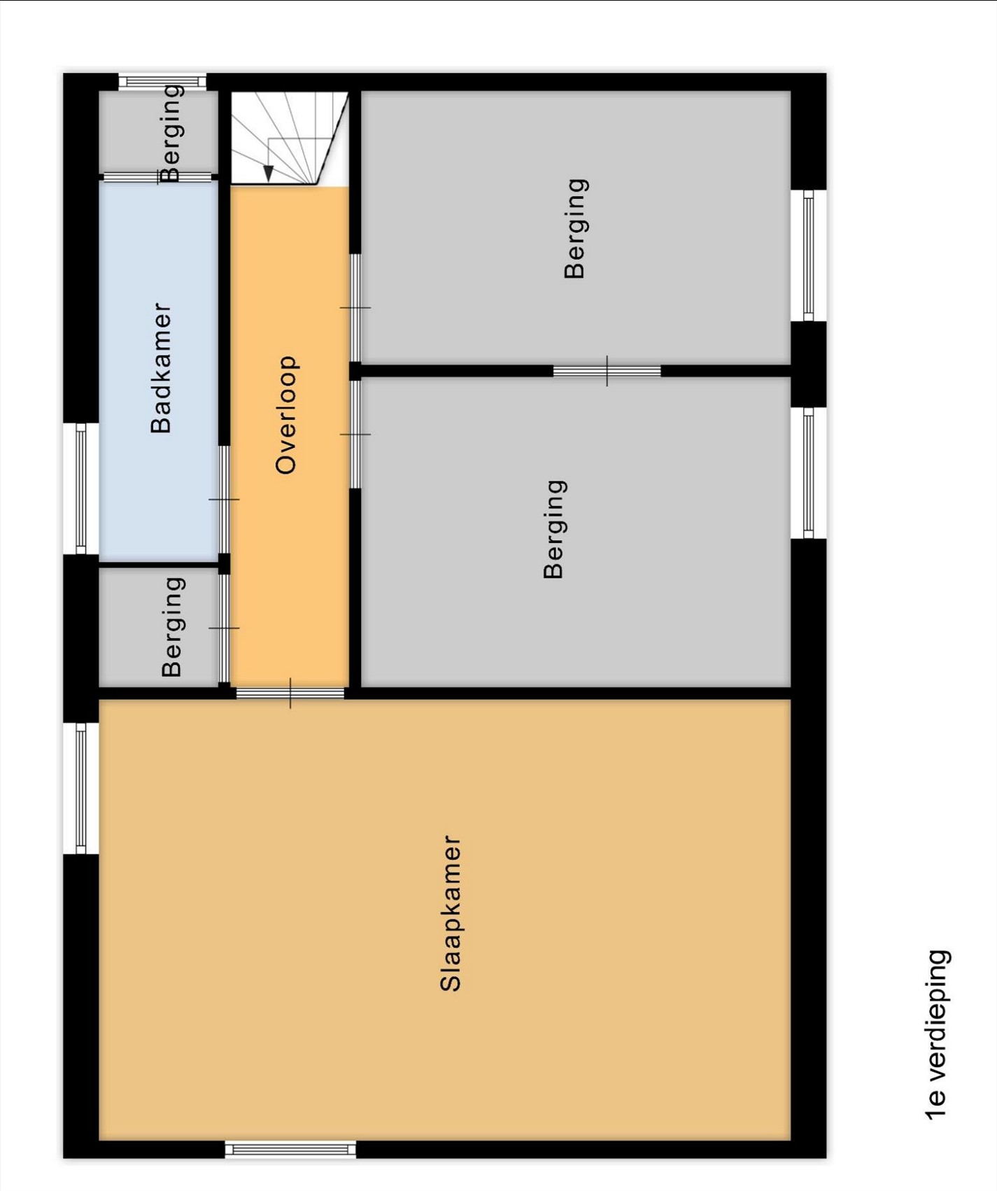 De eerste verdieping herbergt de nachtruimte. Hier bevindt zich één ruime slaapkamer van 21,46 m². Dankzij de oppervlakte is er plaats voor een volwaardige slaapkamerinrichting met extra kastruimte of een bureauhoek. De badkamer bevindt zich eveneens op deze verdieping en is praktisch ingedeeld. De huidige inrichting vraagt om opfrissing, maar biedt een duidelijke basis voor wie een hedendaagse afwerking wenst.