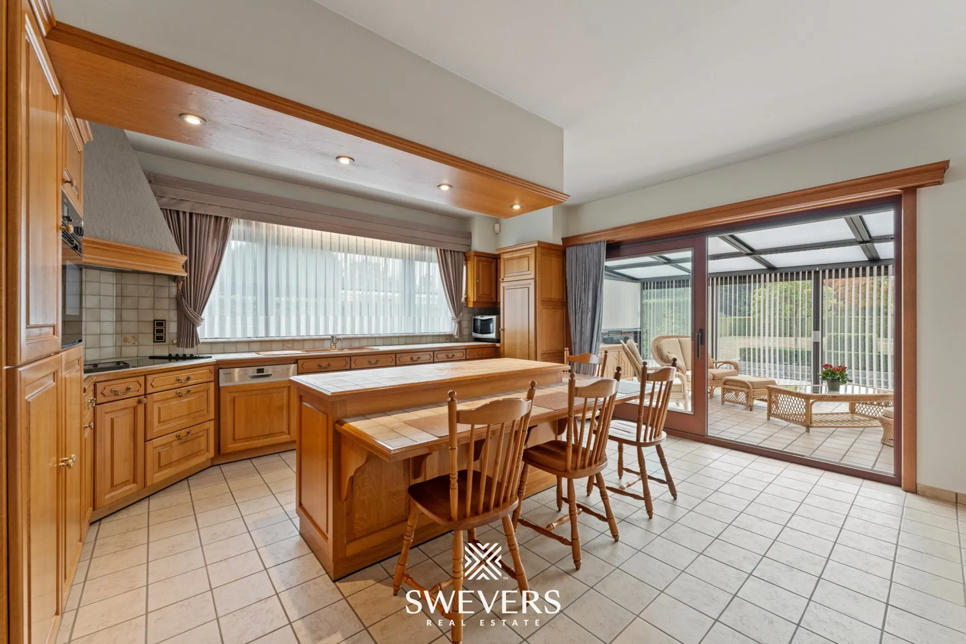 Bij het betreden van de woning kom je via de inkomhal met gastentoilet in de ruime en lichtrijke woonkamer van 44 m². Grote raampartijen zorgen hier voor een aangename lichtinval en een vlotte verbinding met de tuin. Aansluitend bevindt zich de leefkeuken van 25 m², volledig uitgerust en met directe toegang tot de veranda. Deze veranda vormt een heerlijke overgang tussen binnen en buiten en laat je in elk seizoen genieten van het zonlicht.