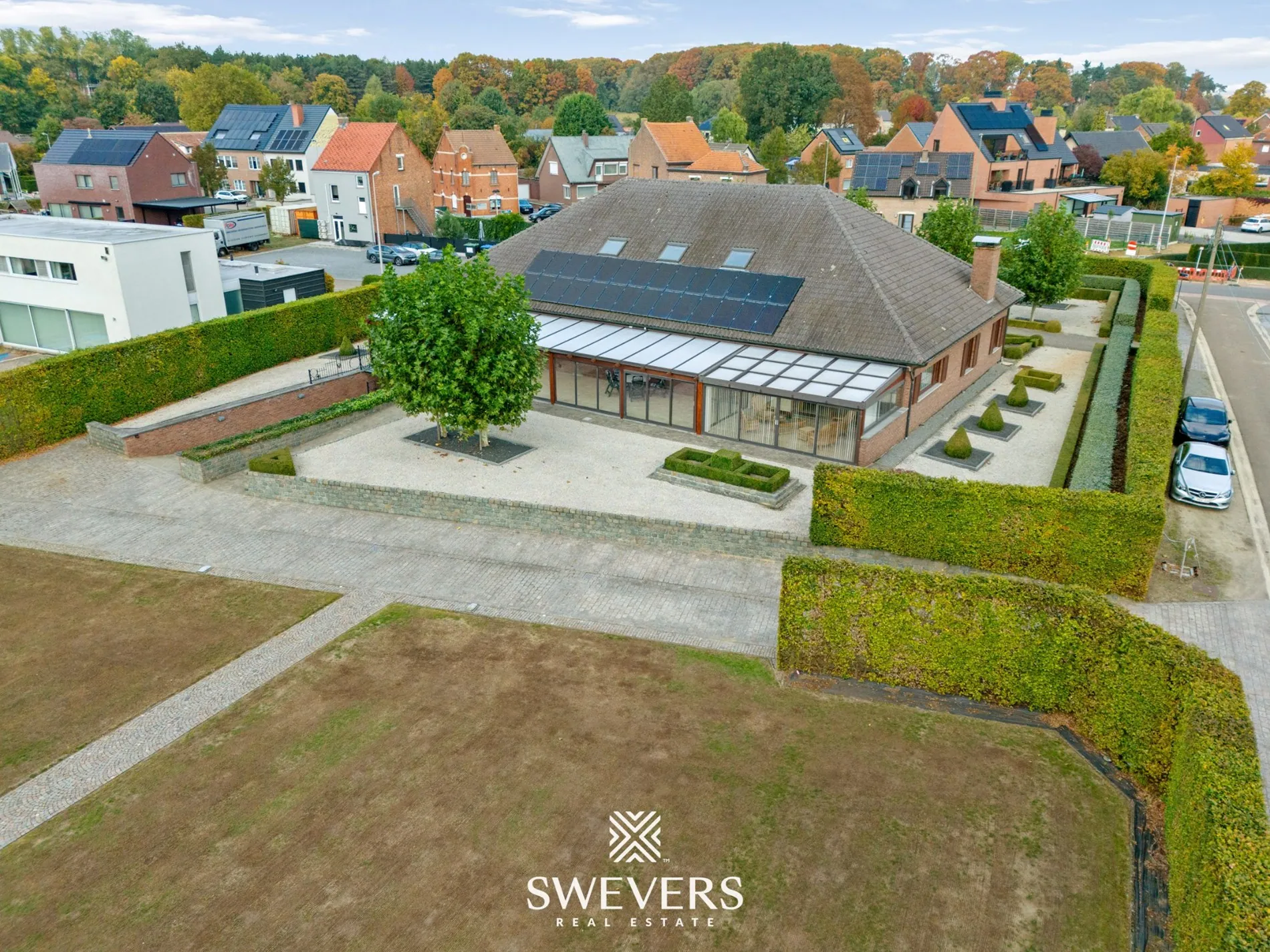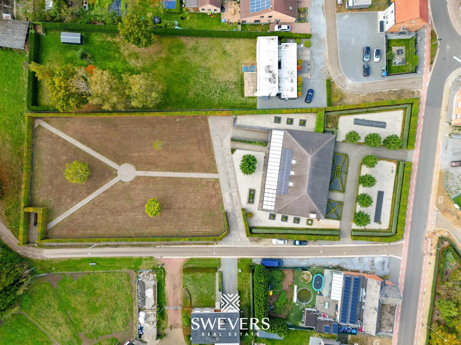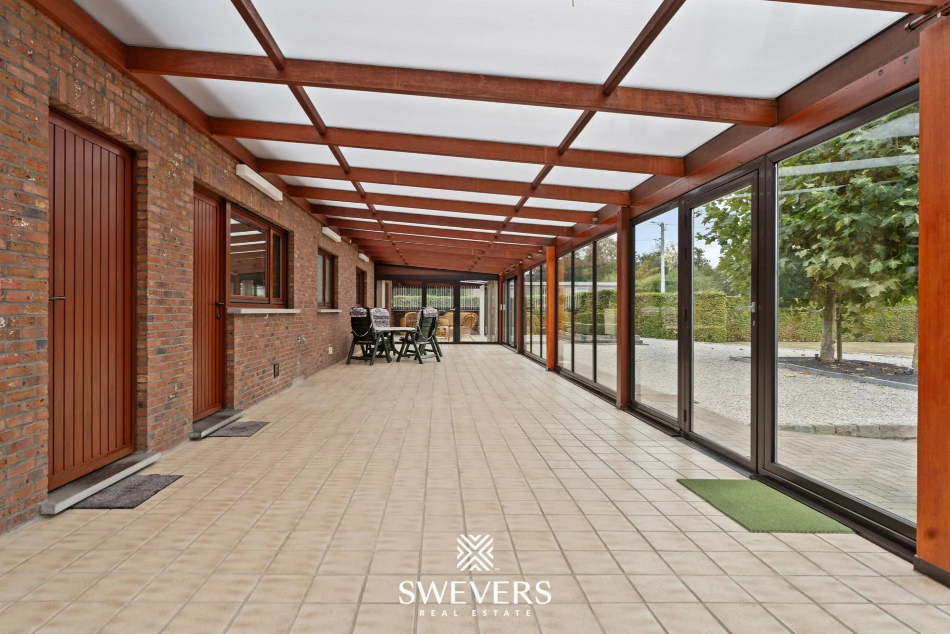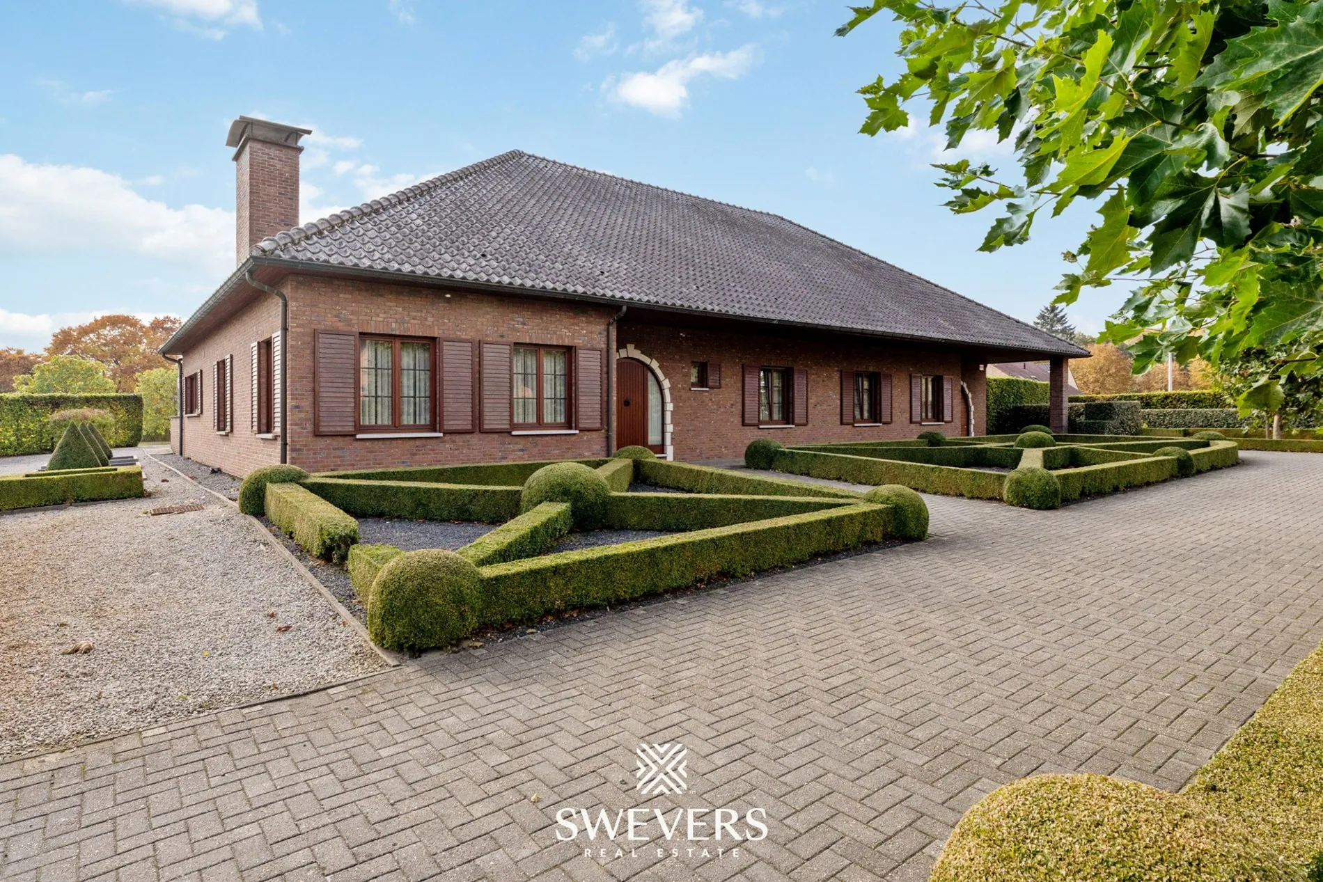 Het perceel van 48 are 60 centiare is zuidelijk georiënteerd en dat voel je in elk hoekje van de tuin. Dankzij de royale breedte en doordachte aanplanting geniet je hier van volledige privacy. De oprijlaan leidt naar meerdere parkeerplaatsen vooraan, en de tuin rondom is smaakvol aangelegd met hagen, grindpaden en een centrale boom die het geheel karakter geeft. In combinatie met de veranda en het open zicht op het perceel, vormt dit een ideale plek om te ontspannen en tot rust te komen.