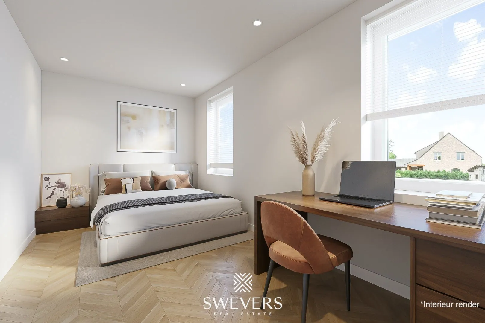 Op de eerste verdieping bevinden zich twee ruime slaapkamers, bereikbaar via de centrale overloop. Met oppervlaktes van 15,58 m² en 16,32 m² bieden beide kamers voldoende plaats voor een tweepersoonsbed, een grote kleerkast en eventueel een bureau of werkhoek. Door hun royale afmetingen laten deze slaapkamers zich flexibel inrichten, wat ze geschikt maakt voor gezinnen, thuiswerk of hobbygebruik.