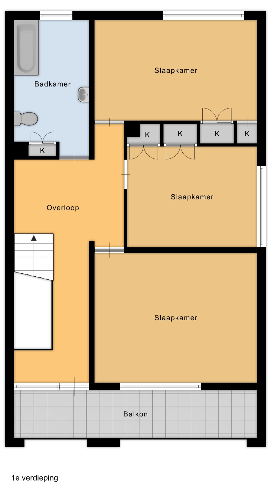 De eerste verdieping telt drie slaapkamers. De grootste kamer meet 20 m² en bevindt zich aan de rustige achterzijde, ideaal voor een master bedroom met zicht op de tuin. De tweede slaapkamer is 15,5 m² groot en ligt aan de zijkant van het huis. De derde kamer, 12,4 m² groot, leent zich perfect als kinderkamer, bureau of hobbyruimte. Verder is er op deze verdieping een badkamer met ligbad, dubbele wastafel en toilet. Vanuit de nachthal en de slaapkamer aan de voorzijde is ook het balkon bereikbaar, waar het 's ochtends heerlijk vertoeven is met een koffie in de zon.