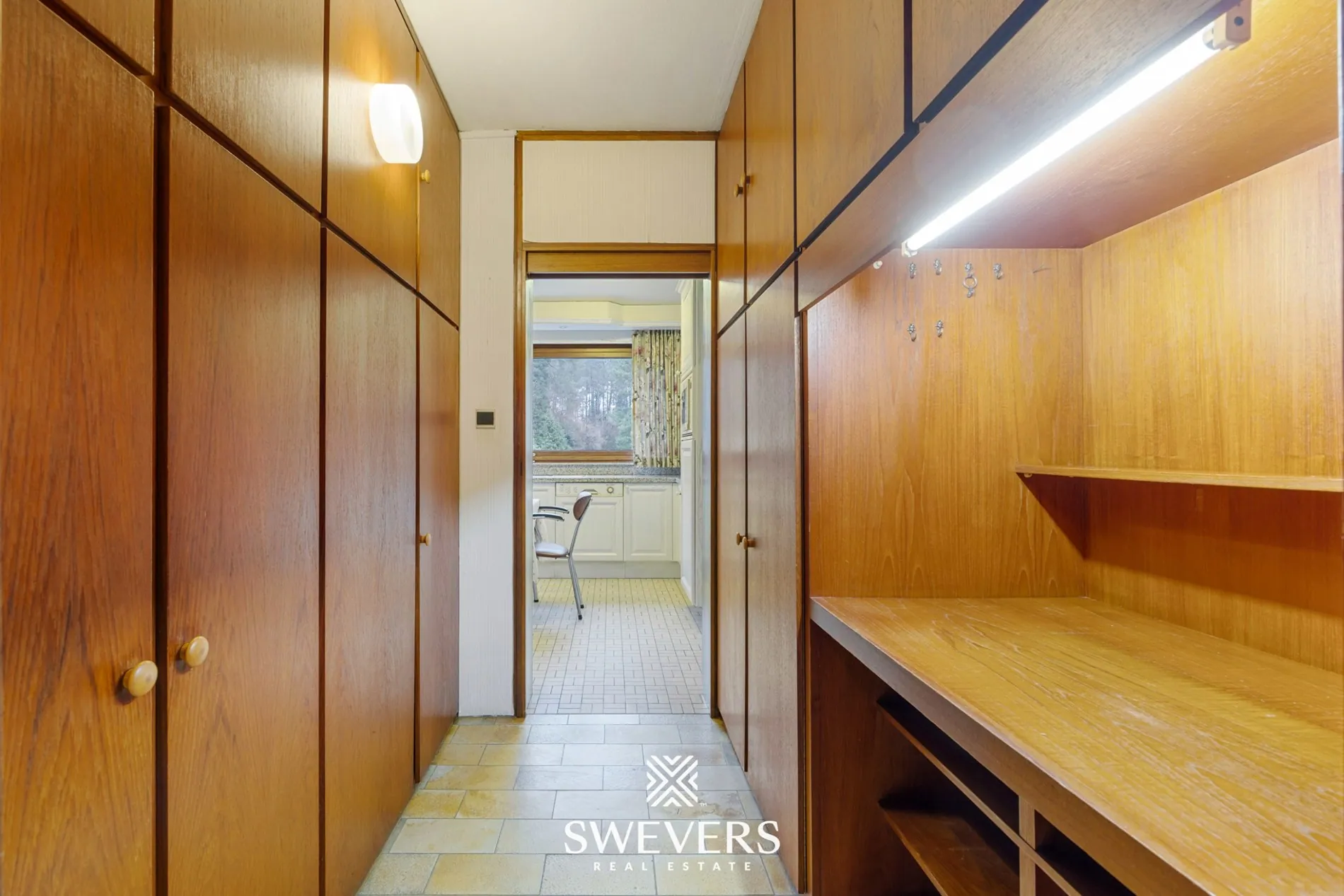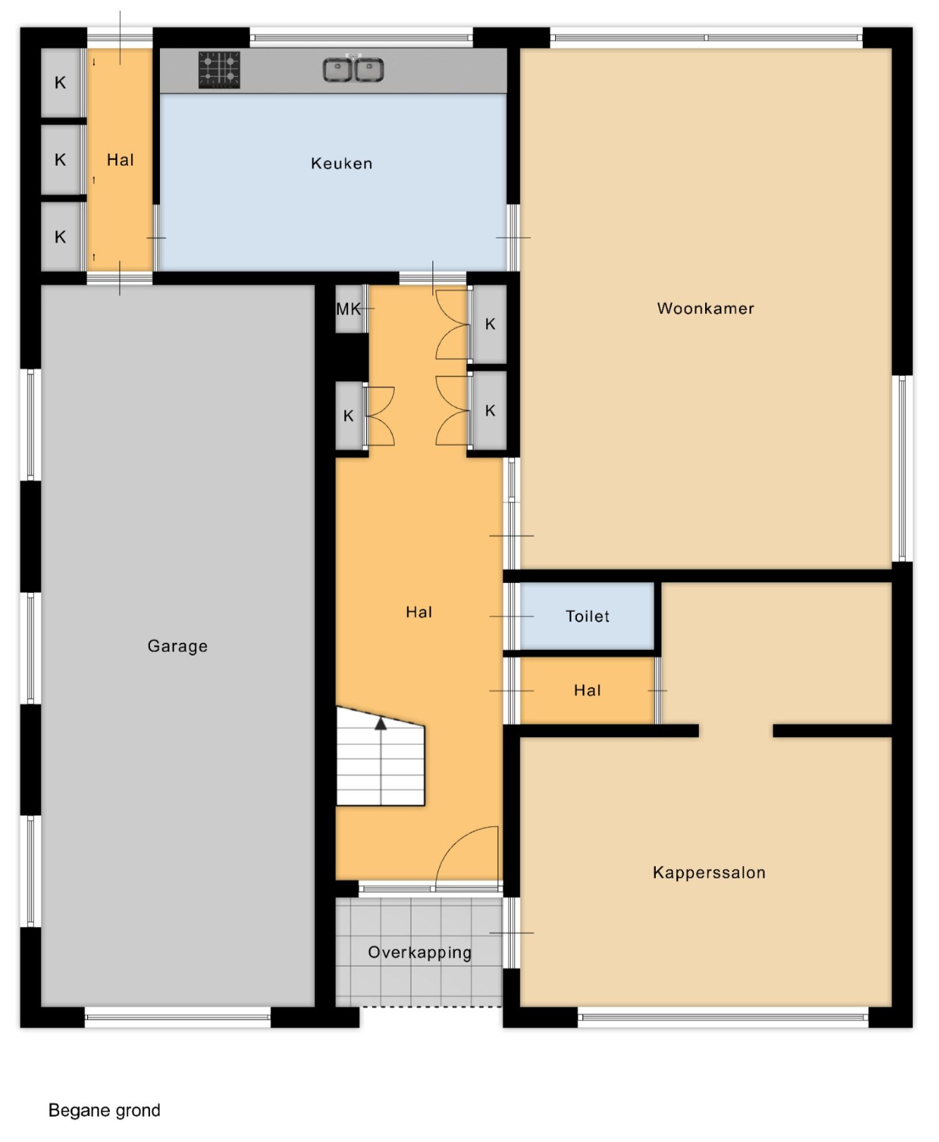 Via de inkomhal kom je binnen in het centrale hart van de woning. Aan de straatzijde is er een afzonderlijke ruimte die vroeger dienstdeed als kapsalon. Deze ruimte is ideaal voor wie een praktijk of kantoor aan huis wenst, volledig afgescheiden van het woongedeelte. Verder naar achteren ligt een centrale gang met toegang tot een apart gastentoilet en de trap naar de eerste verdieping. Achteraan de woning strekt zich een lichtrijke leefruimte uit van 35 m² met directe verbinding via een deur naar de keuken van 13,98 m². Deze functionele opstelling maakt het eenvoudig om gezellig te tafelen en samen te leven. Daarnaast bevindt zich op het gelijkvloers ook nog een praktische berging en een vestiaire met ingebouwde bureau, wat het dagelijkse comfort aanzienlijk verhoogt. Ten slotte biedt de inpandige garage niet alleen plaats aan een wagen, maar ook aan extra stockage of een kleine werkplaats, mede dankzij de aanwezige werkput.