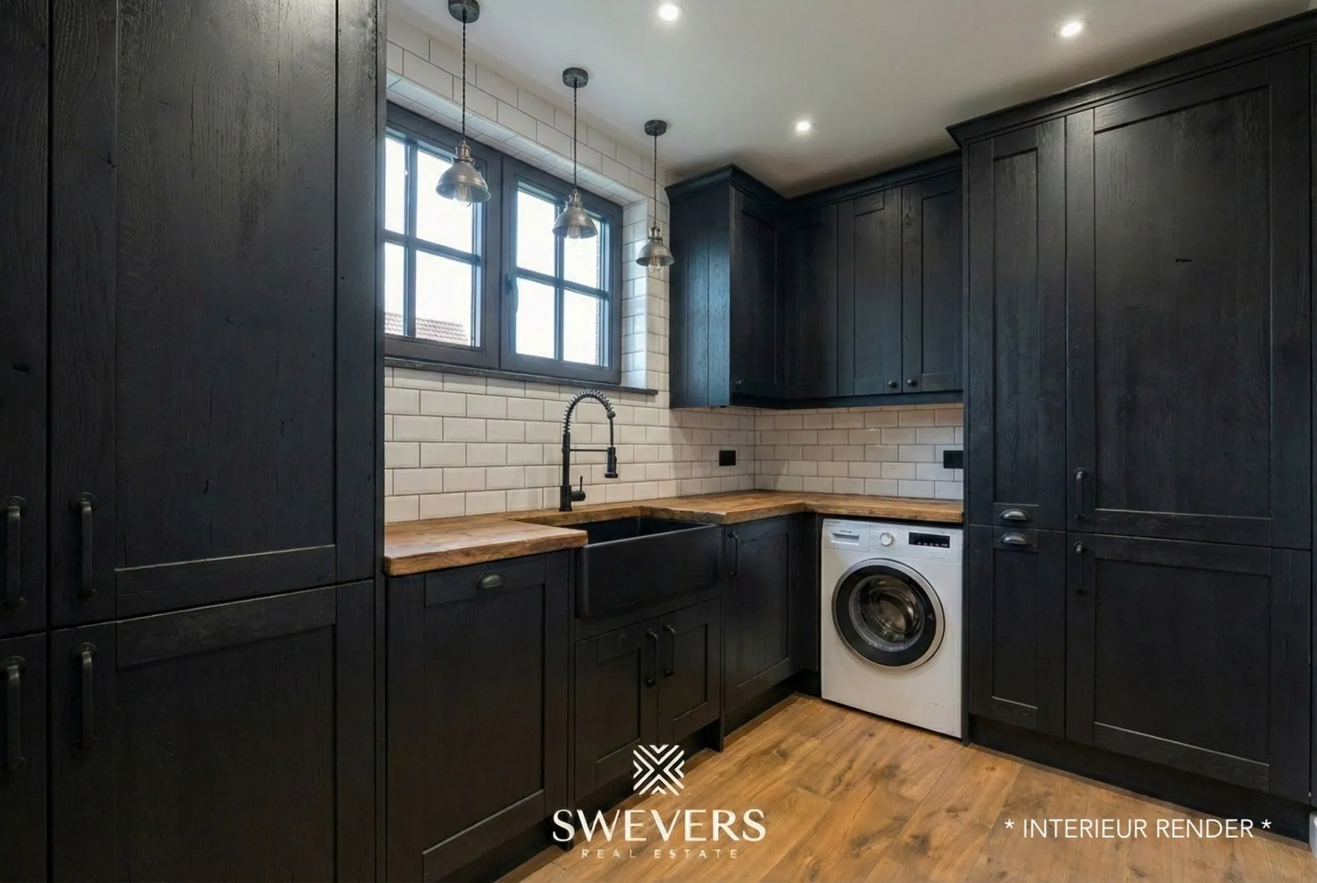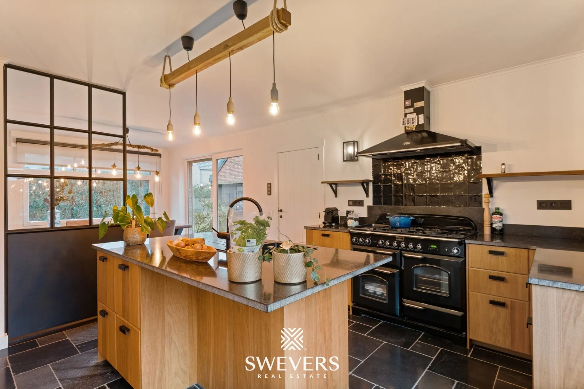 Aansluitend bevindt zich de keuken van 16 m², praktisch ingericht en ruim genoeg om comfortabel te koken. Terwijl je hier bezig bent, kijk je uit op de tuin en voel je hoe binnen en buiten naadloos in elkaar overvloeien. De regenwaterput van 20.000 liter, aangesloten op wc’s, wasmachine en een buitenkraantje, onderstreept het duurzame karakter van de woning.