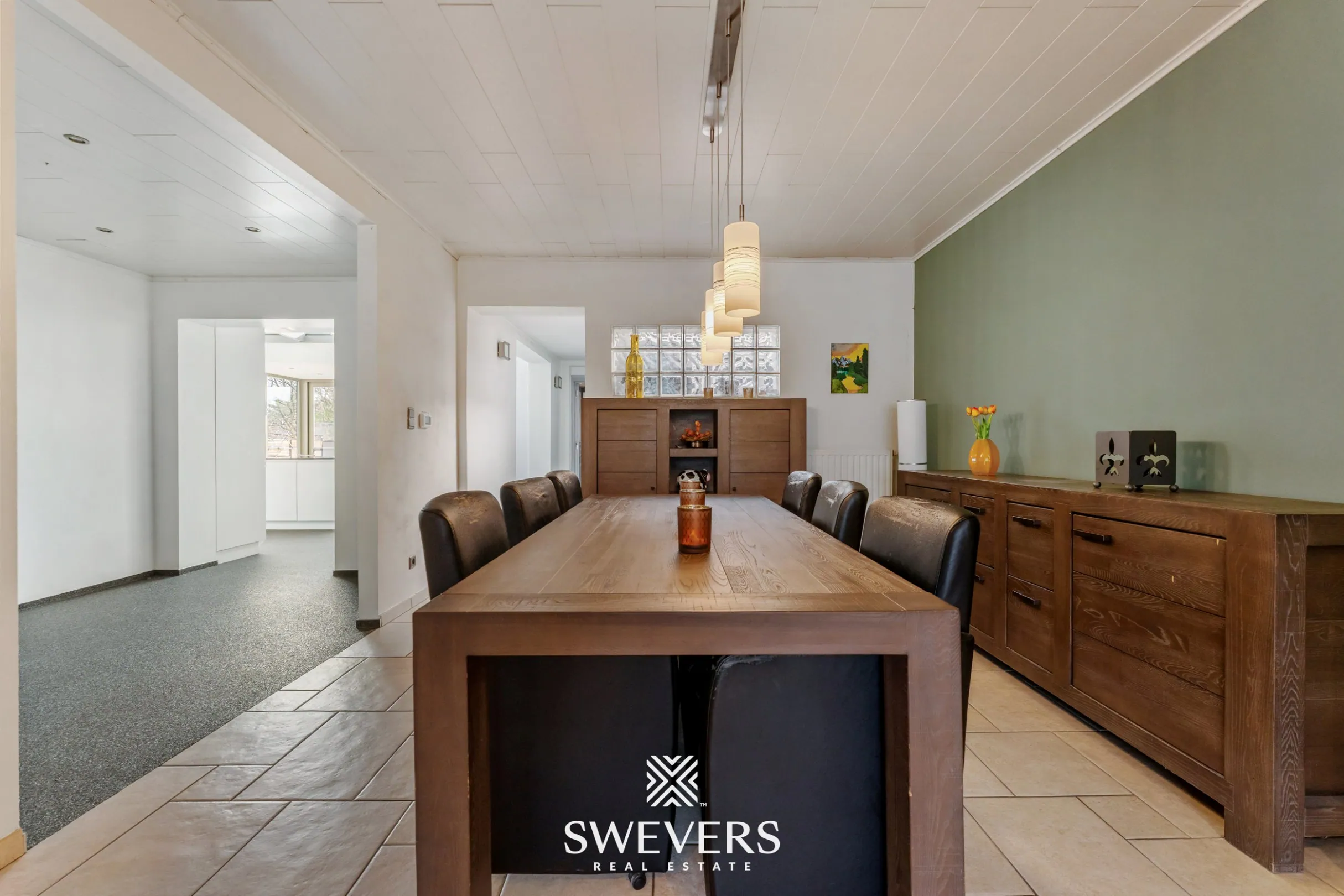 Aansluitend bevindt zich de bijzonder ruime en recent gerenoveerde keuken van 36 m². Een plek waar koken en samenkomen naadloos in elkaar overvloeien. Het uitzicht op de tuin maakt elke maaltijd tot een klein moment van genieten. Terwijl je kookt, heb je zicht op het groen en het zwembad – een panorama dat nooit verveelt.