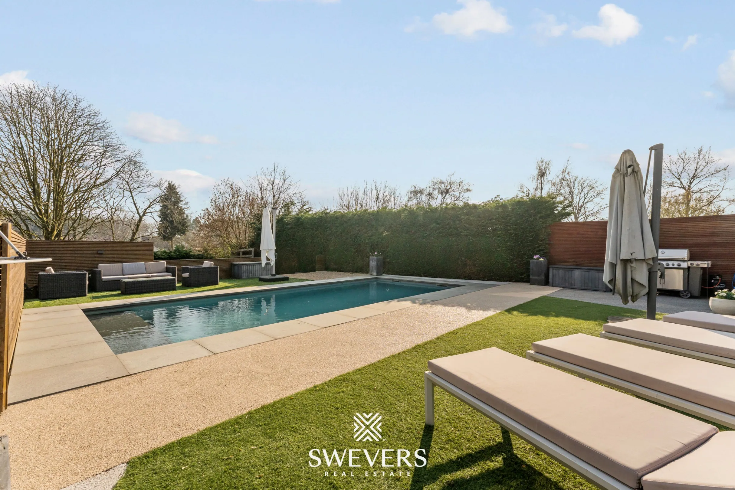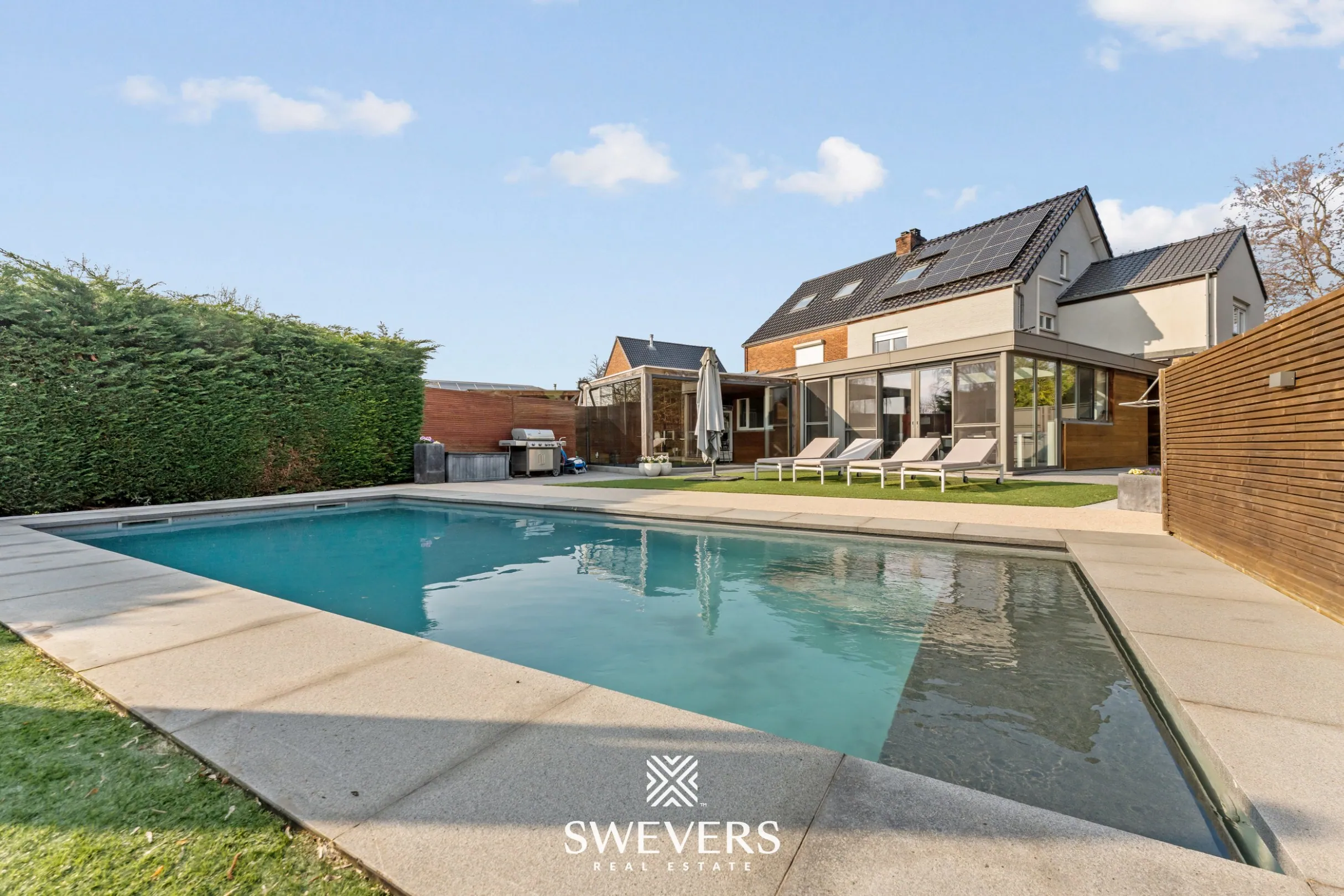 De buitenruimte is een van de absolute troeven van deze woning. De zuidoostgerichte tuin geniet de hele dag van zon en biedt volop ruimte om te ontspannen. Het zwembad van 4 op 10 meter wordt ongetwijfeld het favoriete plekje tijdens warme zomerdagen.