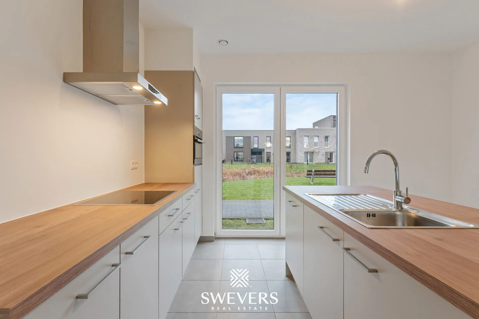 Binnenkomen doe je via een inkomhal met gastentoilet. De lichtrijke leefruimte vormt het hart van de woning, waar de open keuken naadloos aansluit op de eet- en zithoek. De keuken is stijlvol en voorzien van hoogwaardige materialen en toestellen. De grote schuiframen zorgen voor een overvloed aan daglicht en geven toegang tot het ruime terras en de zuidgerichte tuin – de ideale plek om te ontspannen na een drukke dag. Verder is er op de gelijkvloerse verdieping een handige berging die extra opbergruimte biedt.