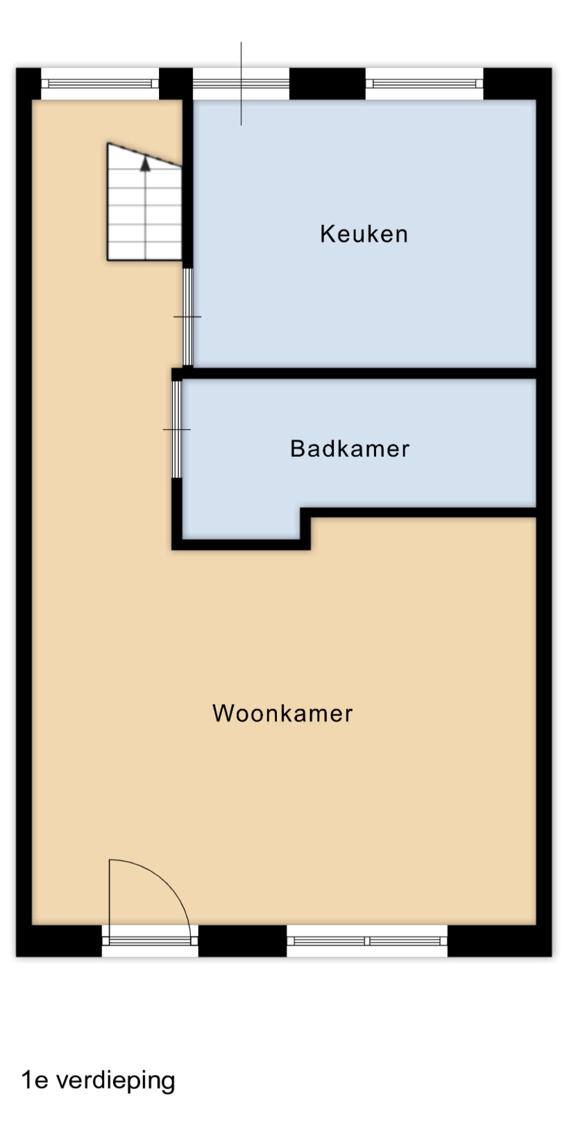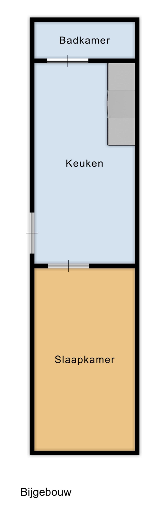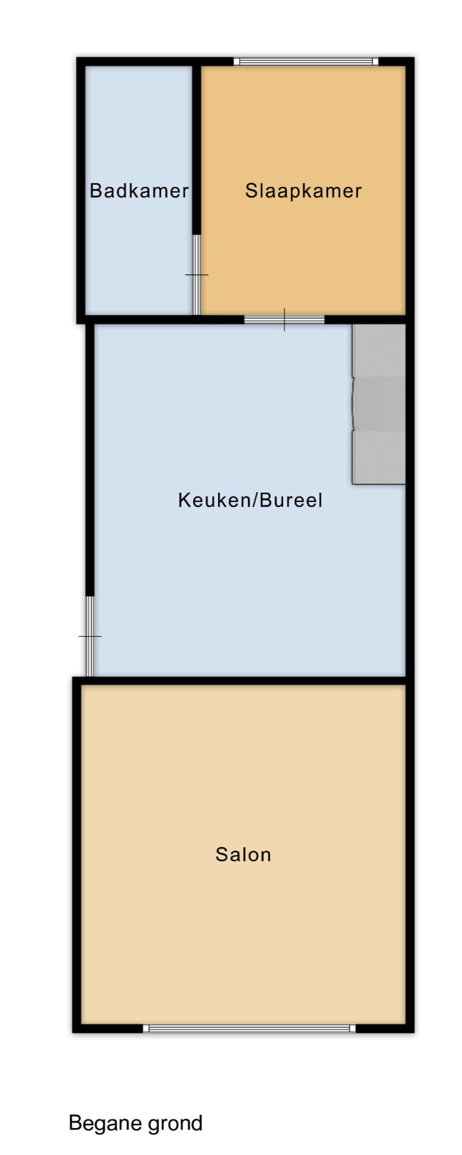 De studio van 30 m² vormt een derde entiteit binnen het gebouw. De woon- en kookruimte zijn samen 9,6 m² en sluiten aan op een aparte slaapkamer en een eigen badkamer. De indeling is compact maar efficiënt opgevat. Mits opfrissing kan hier een aangename studio gecreëerd worden.
