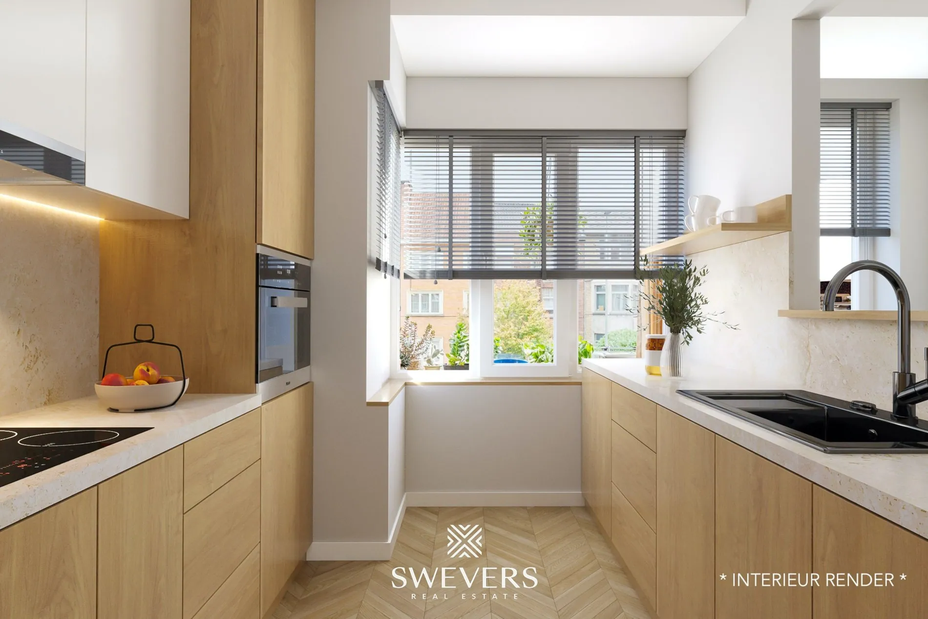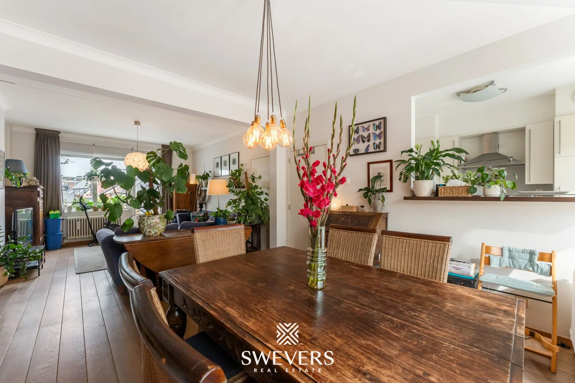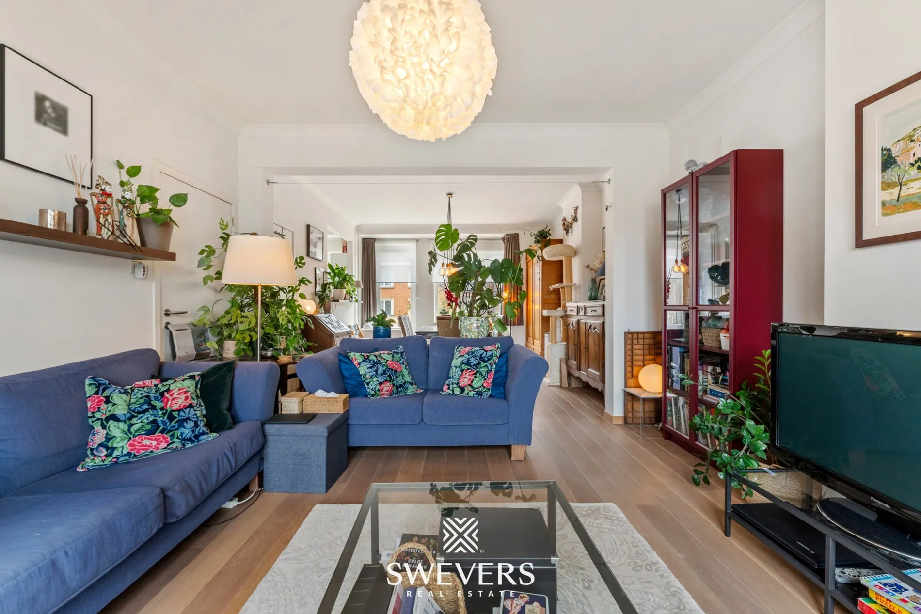 Het appartement beslaat de eerste en tweede verdieping. Op de eerste verdieping ontdekt u een bijzonder aangename leefruimte van 33,79 m². De parketvloer werd in 2000 volledig vernieuwd en straalt een tijdloze elegantie uit. Dankzij de grote raampartijen loopt de woonkamer naadloos over in een ruim terras van 36,40 m². Hier geniet u straks van lange zomeravonden, een aperitief met vrienden of een ontspannen barbecue in de zon.