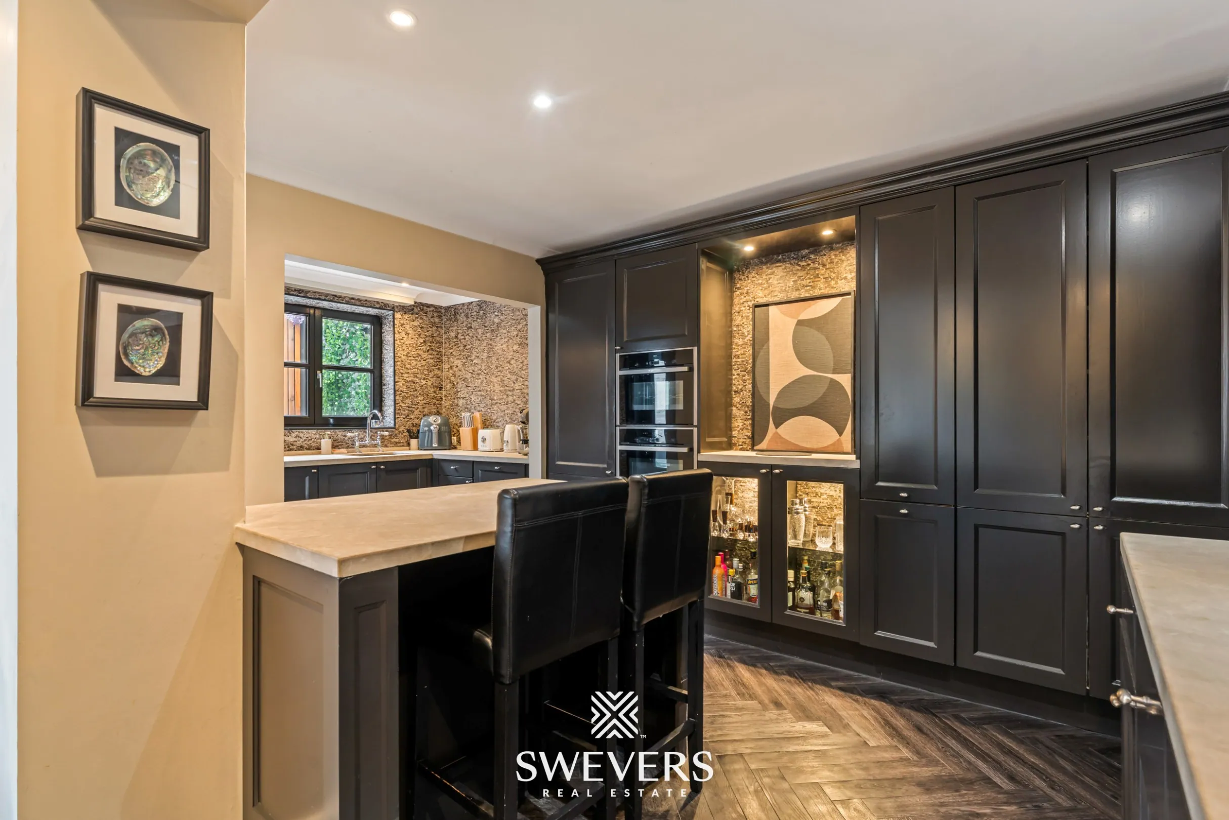 Op het gelijkvloers leidt de inkomhal naar de lichtrijke leefruimte van 32,70 m². Hier zorgen hoge plafonds en kwalitatieve afwerking voor een aangename sfeer. Aansluitend bevindt zich de ruime keuken van 26,30 m², volledig vernieuwd en praktisch ingericht. Deze keuken biedt voldoende plaats voor een grote eettafel en vormt het hart van de woning. Verder is er toegang tot één van de westelijk georiënteerde terrassen, afgewerkt met blauwe steen. Ideaal voor lange zomeravonden in de zon. Het gelijkvloers is bovendien volledig onderkelderd, goed voor 46,5 m² extra opslag- of hobbyruimte.