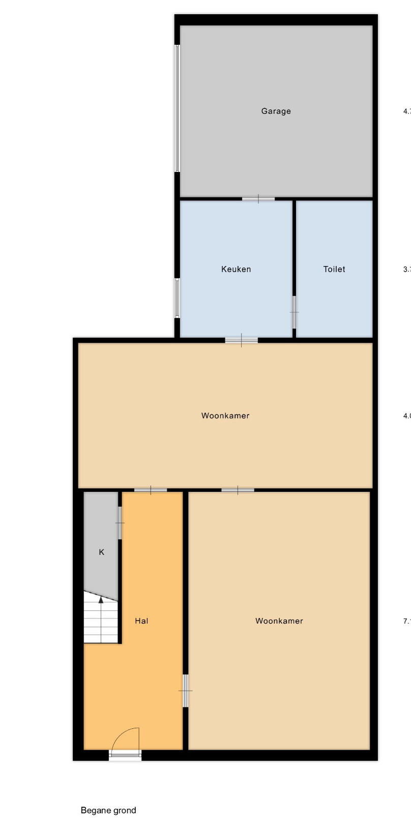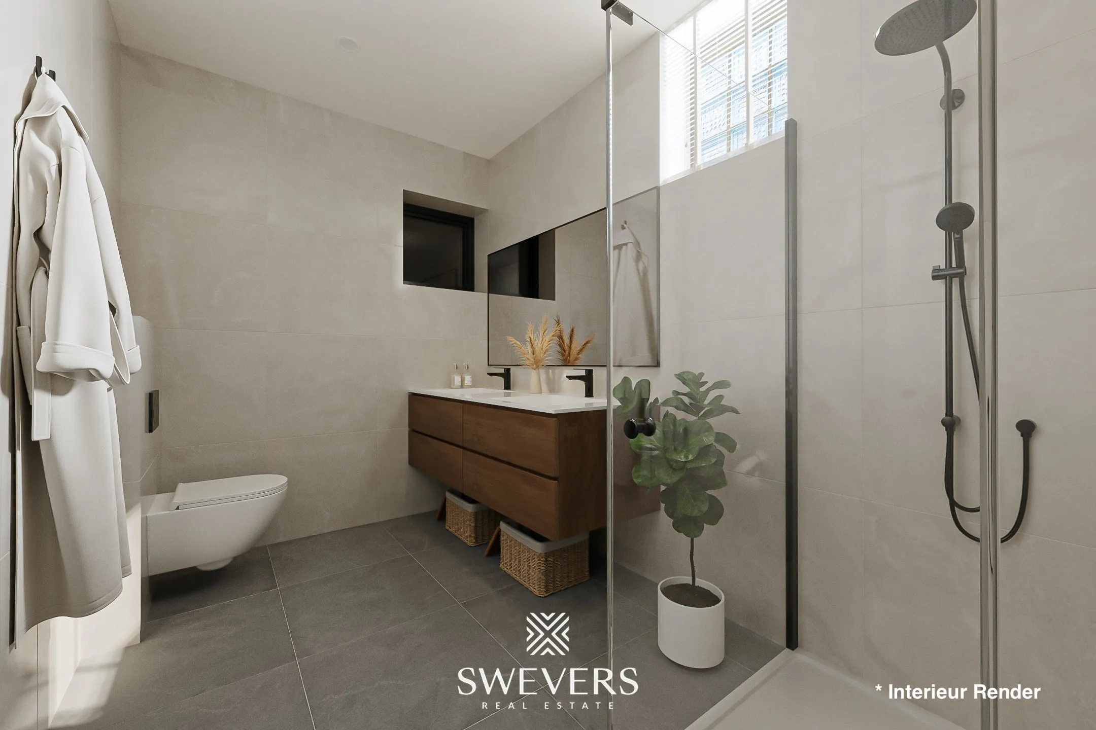 Via de gelijkvloerse verdieping wordt de woning betreden. Hier bevindt zich een ruime leefruimte van ongeveer 36 m² die voldoende plaats biedt voor een zithoek. Aansluitend ligt de eetkamer van 32m², de keuken met een oppervlakte van circa 12 m² en de gezellige badkamer. Op dit niveau is ook de garage geïntegreerd, wat zorgt voor extra comfort en praktische bergruimte. De gelijkvloers vormt een solide basis voor een open en lichtrijke leefomgeving.