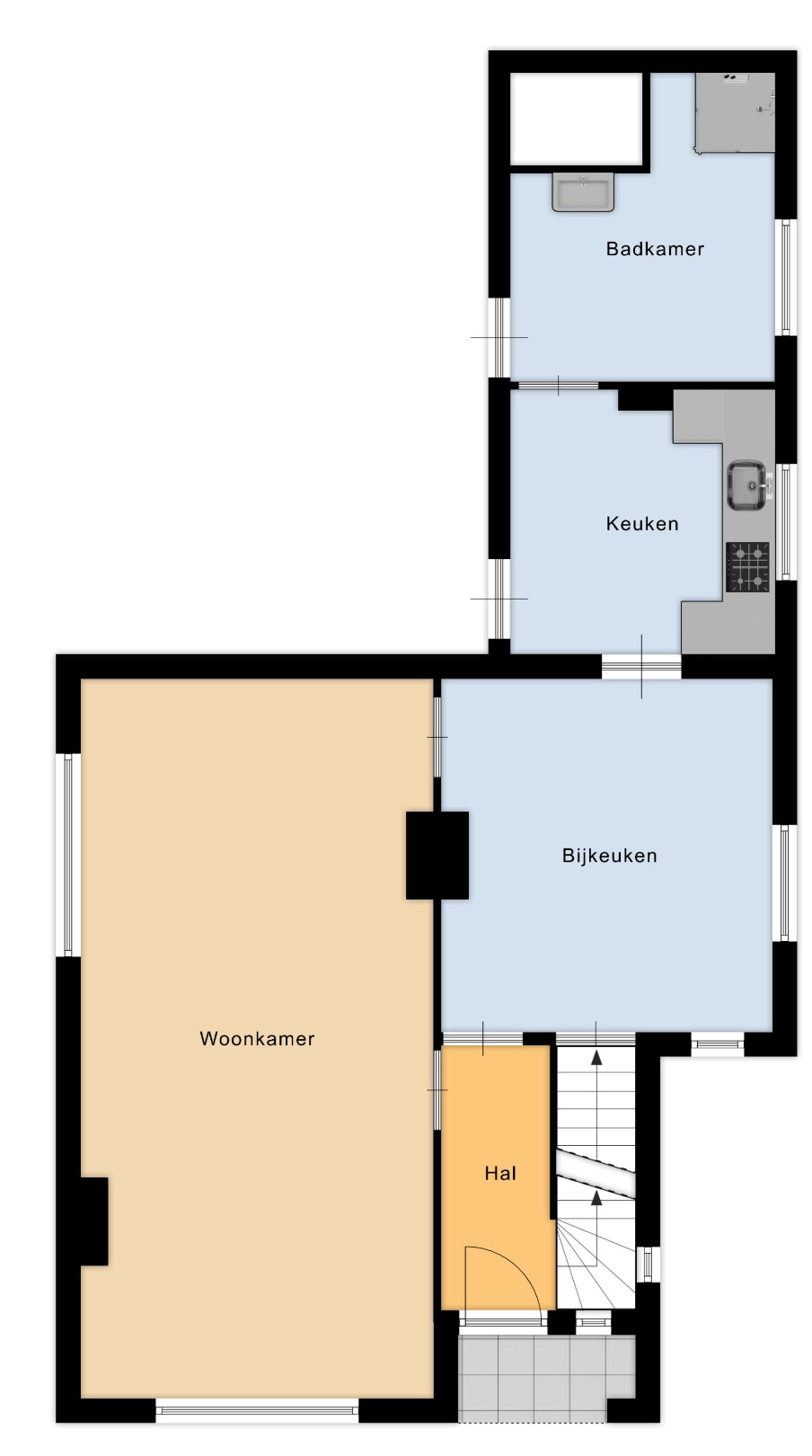 de keuken van 9 m², compact en praktisch ingericht. Daarnaast is er een eetgedeelte van 15 m², ideaal om de keuken uit te breiden en dat rechtstreeks toegang geeft tot de kelder van 8,8 m² – perfect als voorraadruimte. Verder is er een badkamer van 7,92 m², voorzien van een inloopdouche.