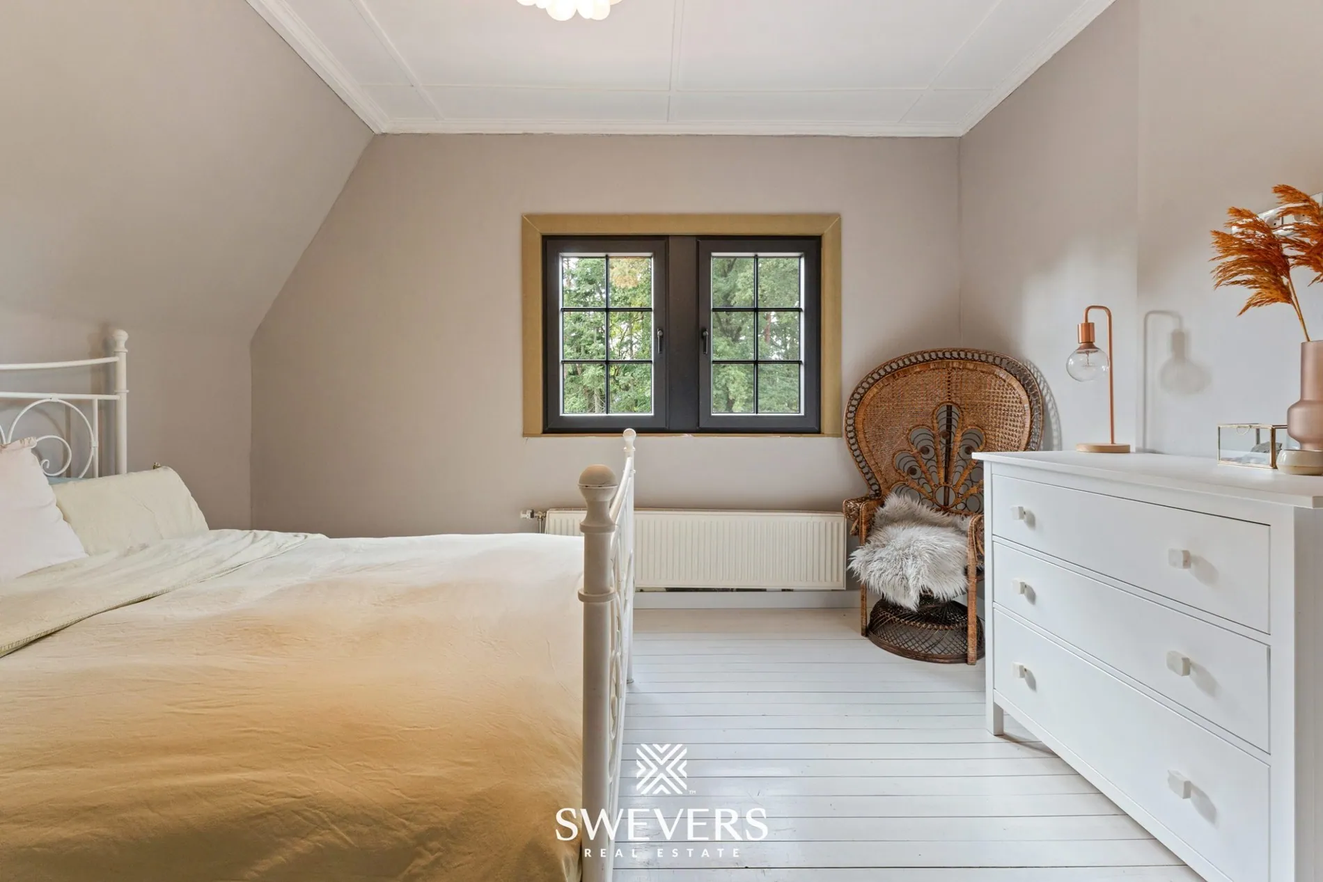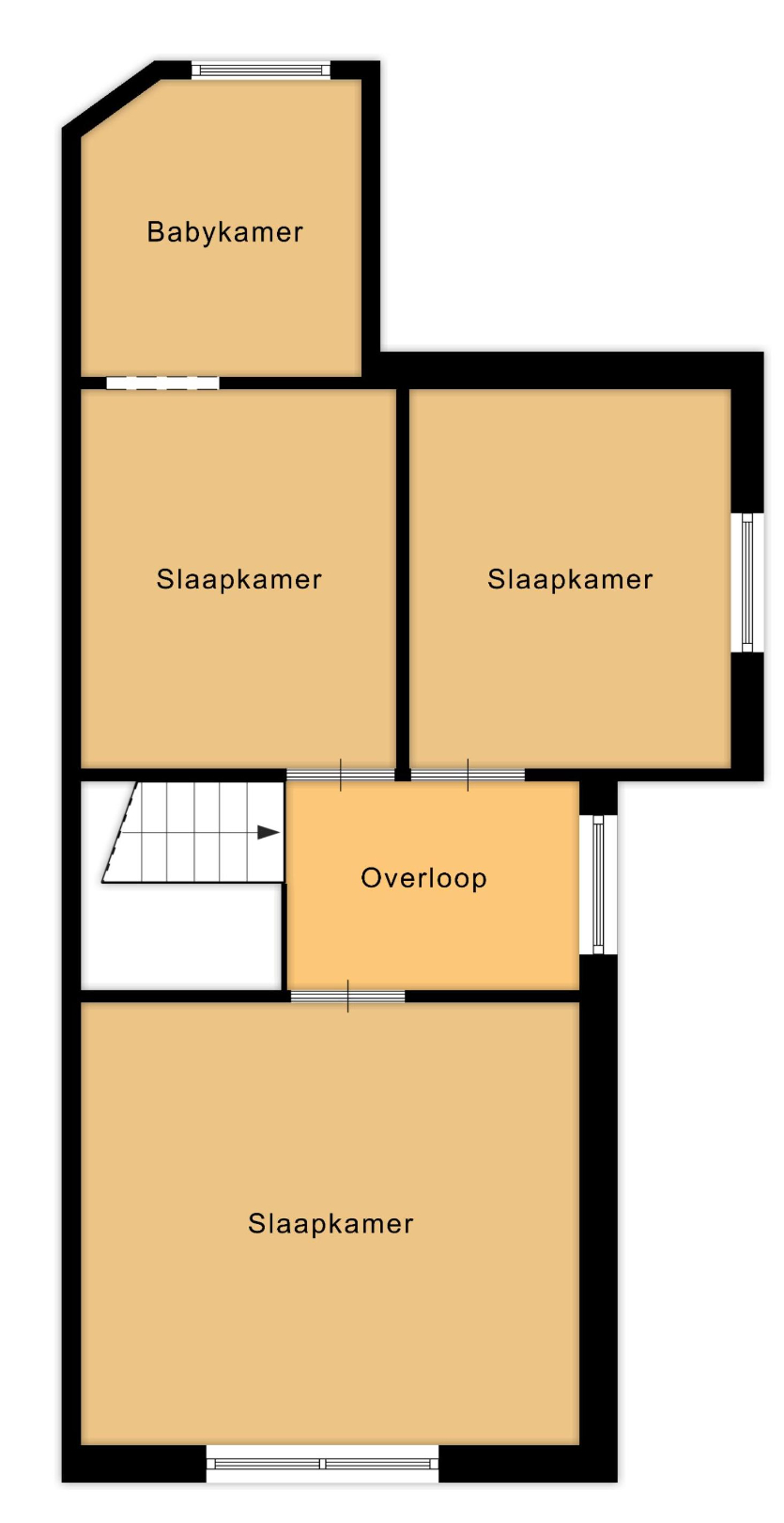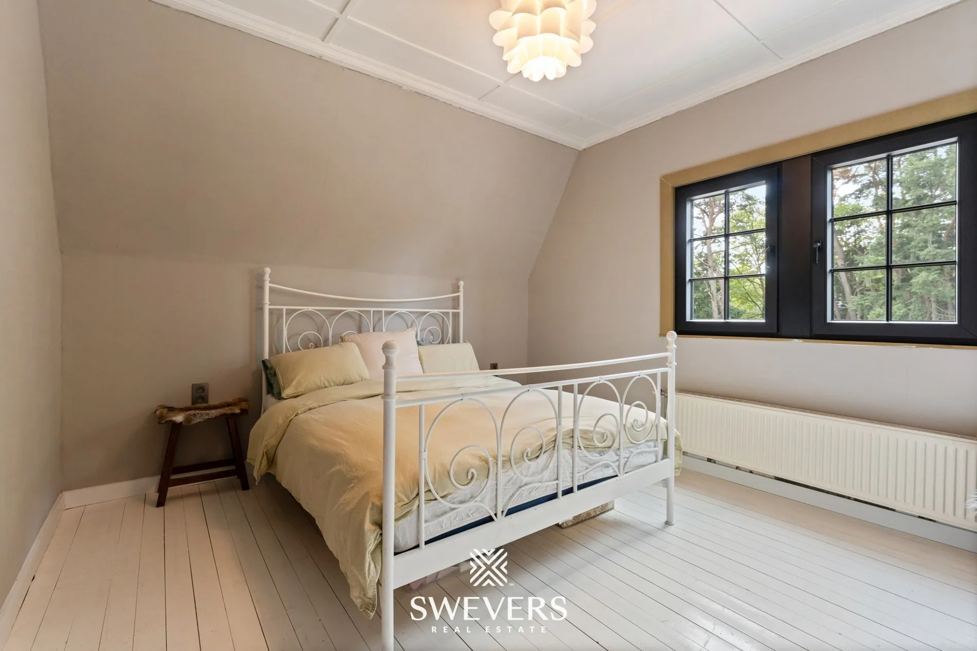 De eerste verdieping telt twee ruime slaapkamers van respectievelijk 13,38m² en 13,83m². Beide kamers genieten van veel lichtinval en hoge plafonds. Hier komt het authentieke karakter van de woning opnieuw naar voren, onder meer in de houten vloer en de originele raamverdeling. De kleinere derde slaapkamer van 7,65m² ligt eveneens op deze verdieping en leent zich perfect als kinderkamer, bureauruimte of dressing.