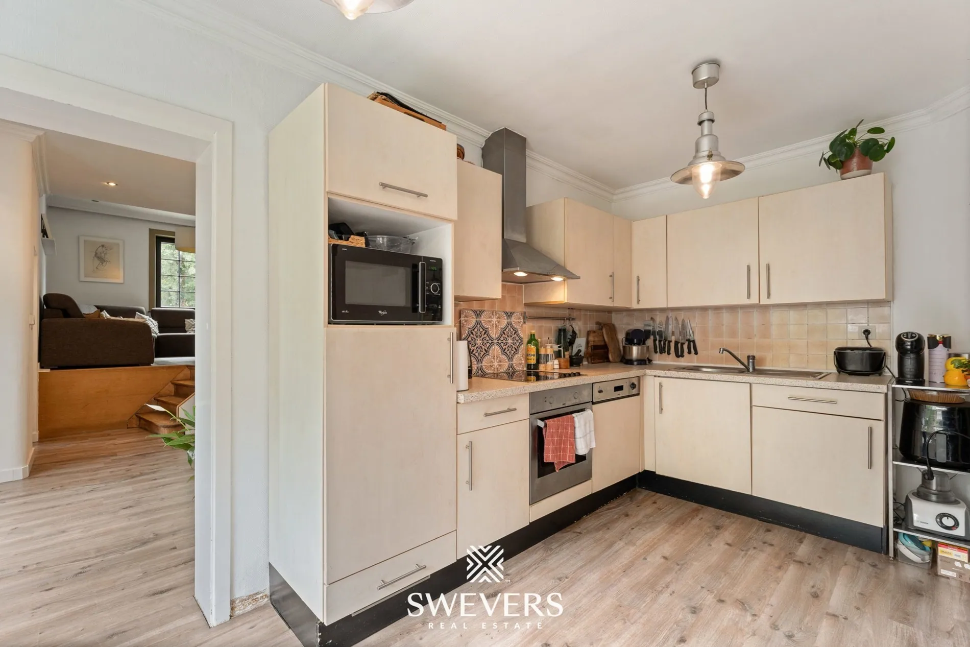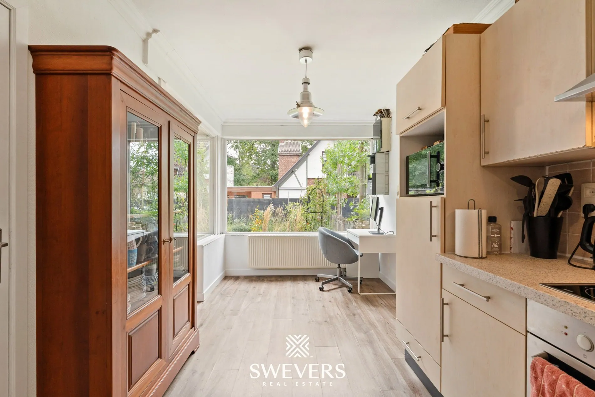 Gelijkvloers tref je naast de inkomhal een zeer gezellige leefruimte. De speelse indeling en het niveauverschil zorgen meteen voor een fijne verdeling tussen de knusse tv-hoek en de eetkamer. De authentieke elementen zoals de houten vloeren, binnendeuren en sierlijsten zorgen meteen voor heel wat charme en sfeer. Aansluitend krijg je de keuken met een oppervlakte van 13m². Deze op te frissen keuken is functioneel ingericht en kan dankzij het grote raam op heel wat natuurlijke lichtinval rekenen. Je wandelt van hieruit rechtstreeks de veranda binnen: een mooie extra ruimte die ideaal is als eetplaats of hobbyruimte met een fantastisch zicht op jouw prachtige tuin.