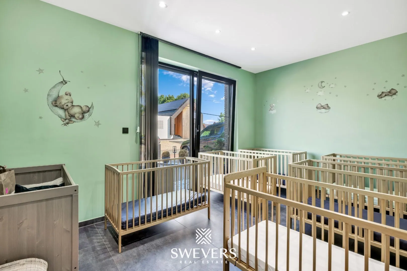 Achteraan de woning werd een grote veranda ingericht die vandaag in gebruik is als professioneel kinderdagverblijf. Deze multifunctionele ruimte opent talloze mogelijkheden: van een uitbreiding van het woongedeelte tot een zorgpraktijk of andere zelfstandige activiteit aan huis. Dankzij de grote raampartijen is het hier bovendien altijd aangenaam licht.