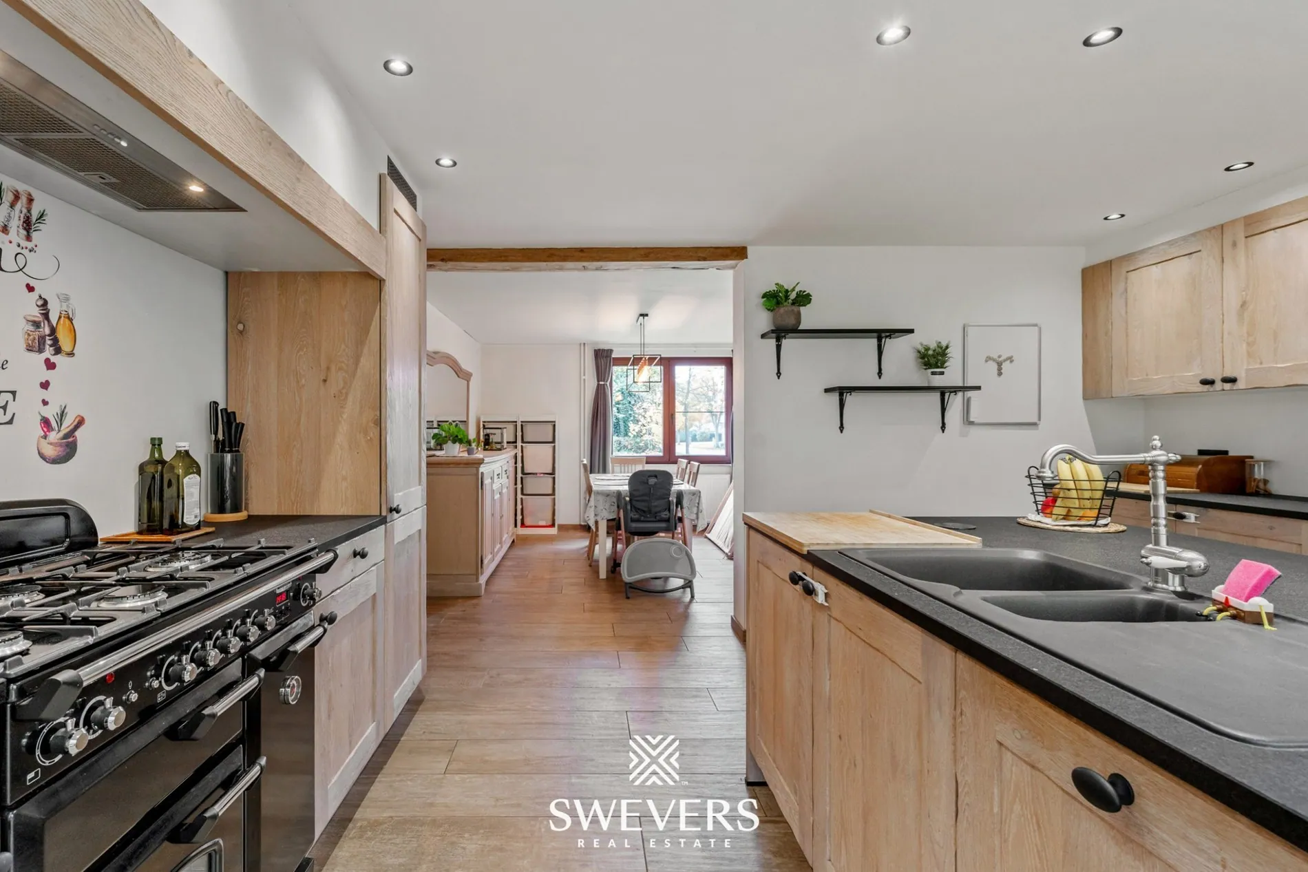 Aansluitend bevindt zich de keuken van 20 m², vernieuwd in 2020, en uitgerust met moderne toestellen en praktische opbergruimte. Dit wordt zonder twijfel de plek waar je gezellig samenkomt, waar ontbijtgeuren de ochtend vullen en waar je straks jouw favoriete gerechten klaarmaakt met uitzicht op de tuin. De verbinding met de veranda maakt deze leefruimte nog veelzijdiger.