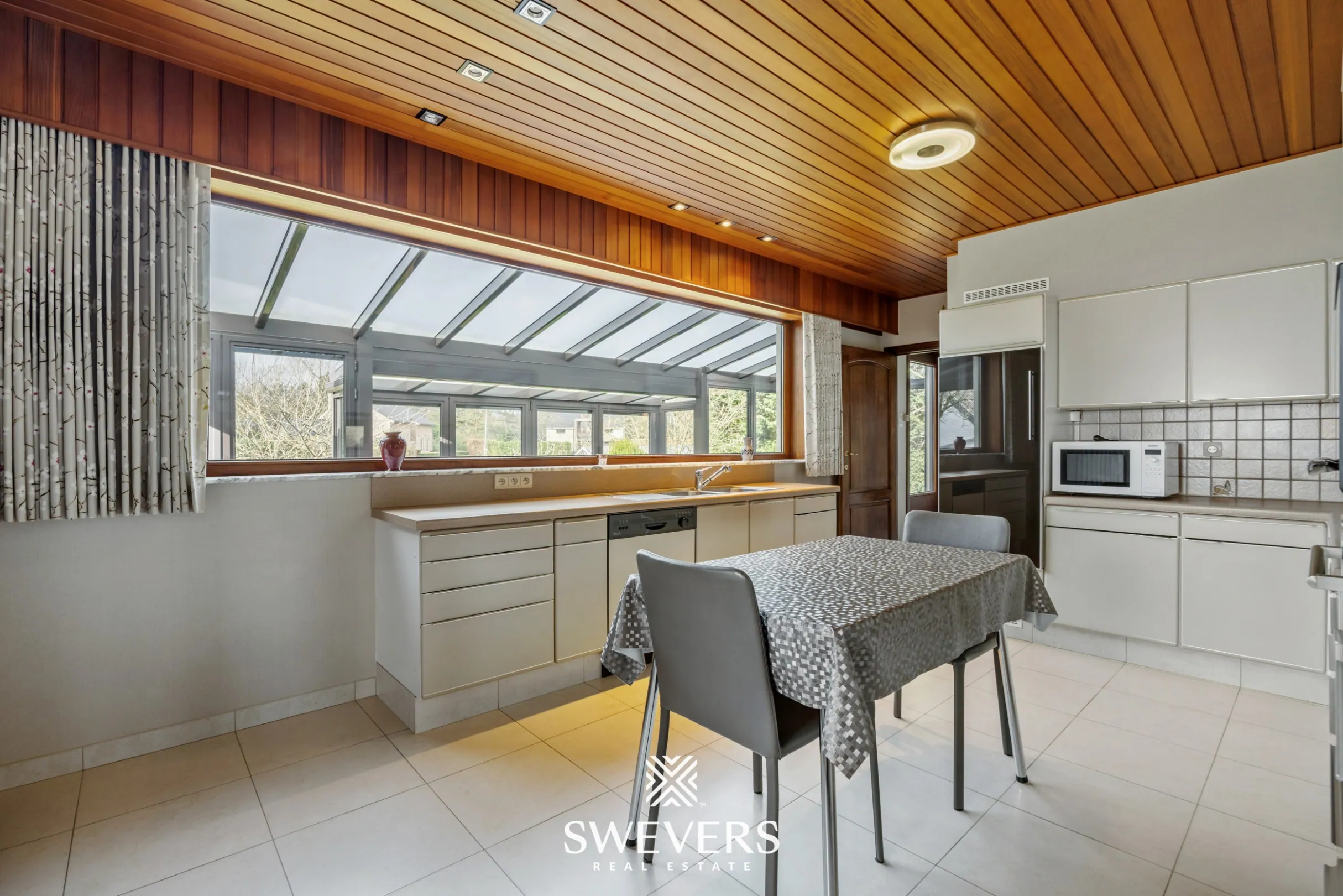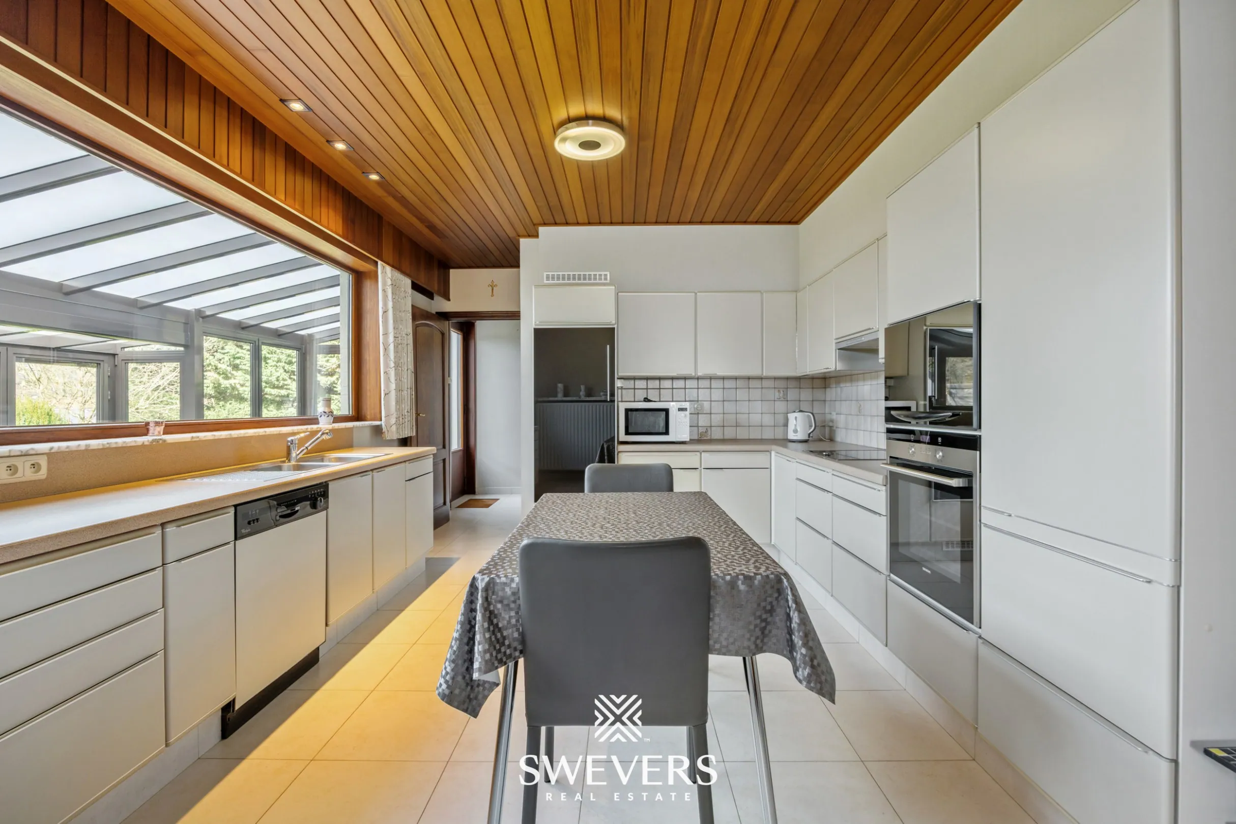 Aan de linkerkant van de inkomhal tref je de gezellige woonkamer. De oppervlakte van 32 m² geniet dankzij de grote raampartijen van een fantastische lichtinval. Aansluitend vinden we de ruime keuken met eetkamer terug. Geniet jij hier binnenkort aan een groot kookeiland van een deugddoende koffie ’s ochtends? Met een oppervlakte van maar liefst 19 m² zou je hier een riante leefkeuken kunnen voorzien. Leuk om te weten is dat de aanpalende veranda van 23 m² ook met de keuken betrokken zou kunnen worden. Zo krijg je een zalig mooi zicht op de leuke groene tuin.