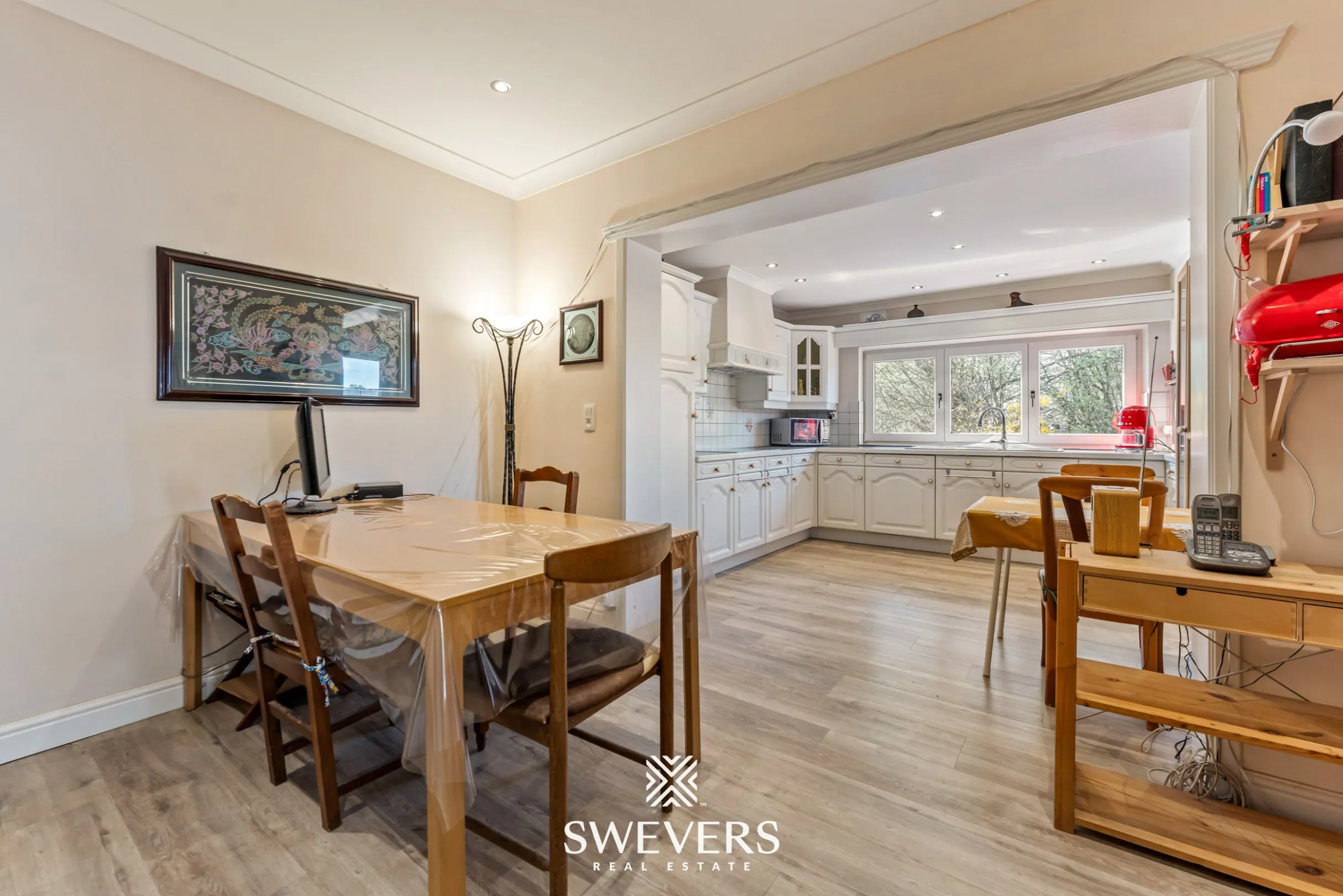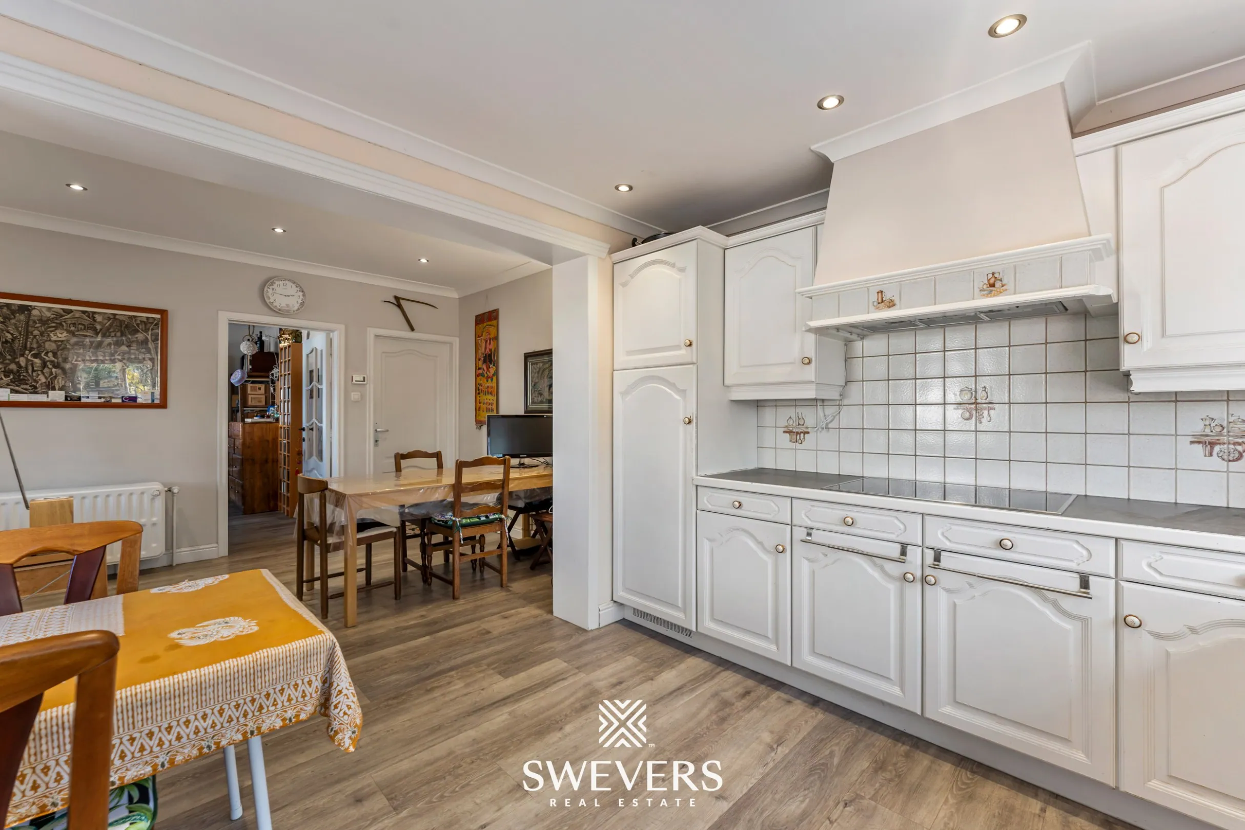 De aansluitende keuken is praktisch ingericht en biedt alle nodige functionaliteit. Met een beperkte opfrissing creëert u hier eenvoudig een hedendaagse en gezellige plek waar koken en samenzijn hand in hand gaan. Dankzij de grote raampartijen geniet u hier van een overvloed aan natuurlijk licht en een aangenaam zicht op de tuin. Hier ontstaan ongetwijfeld warme momenten met familie en vrienden.