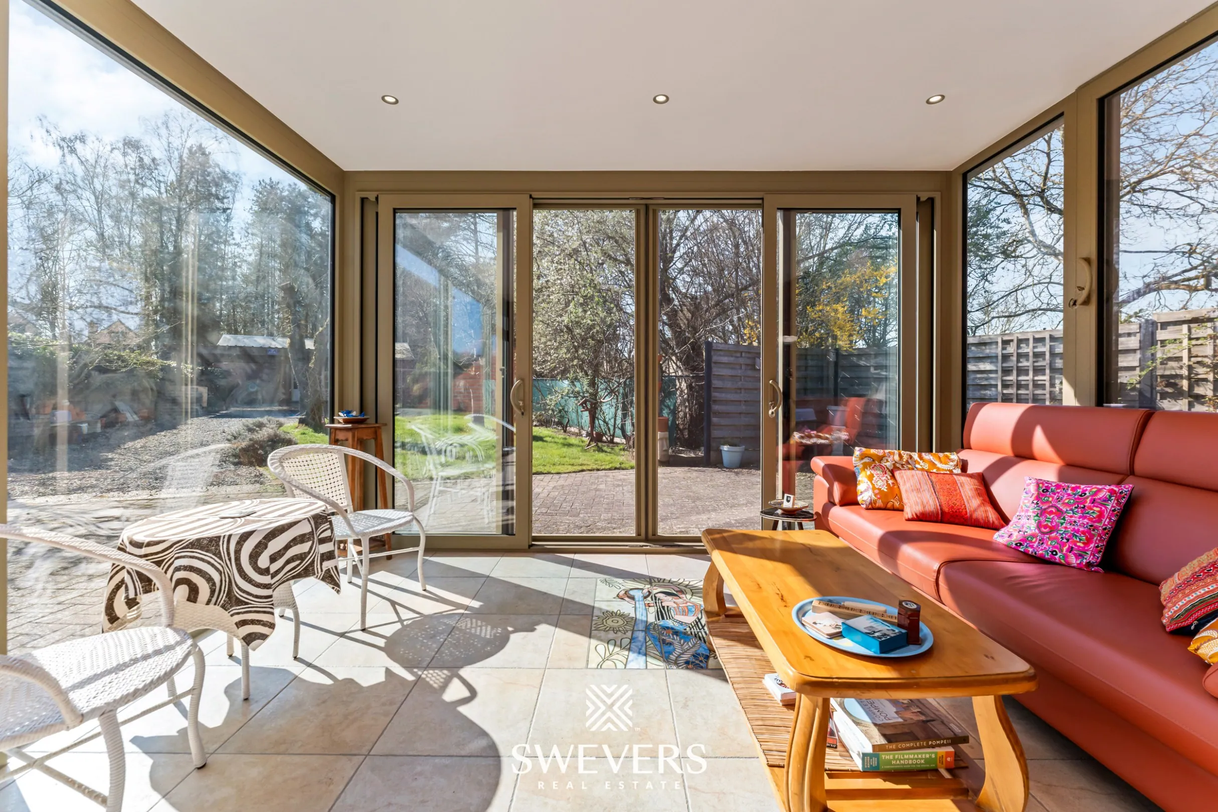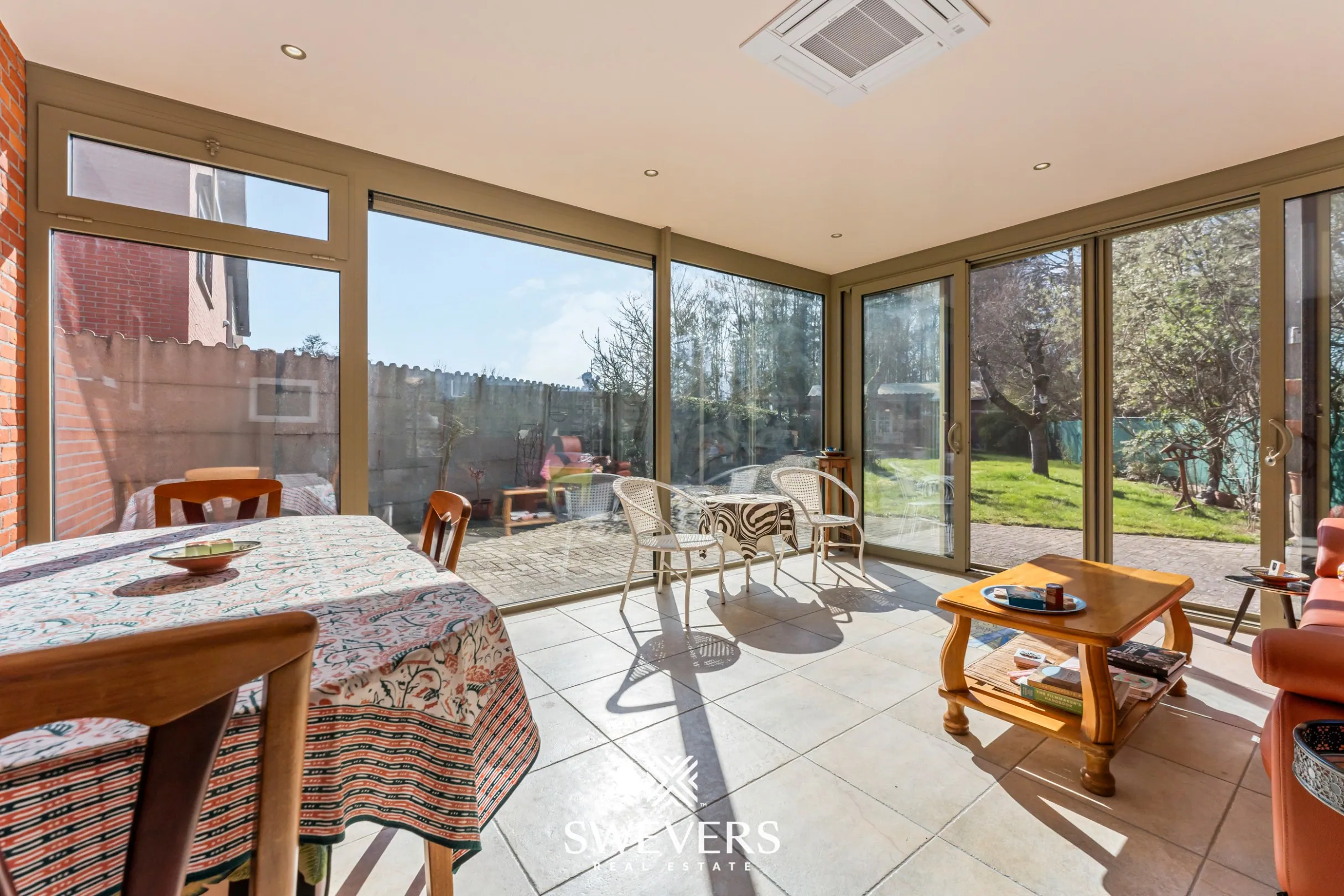 De recent geplaatste veranda (2022) vormt een prachtige verbinding tussen binnen en buiten. Dankzij de westelijke oriëntatie van het perceel geniet u hier van lange, zonnige avonden en een rustgevend uitzicht op de tuin.