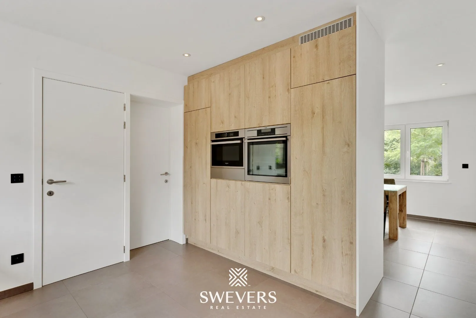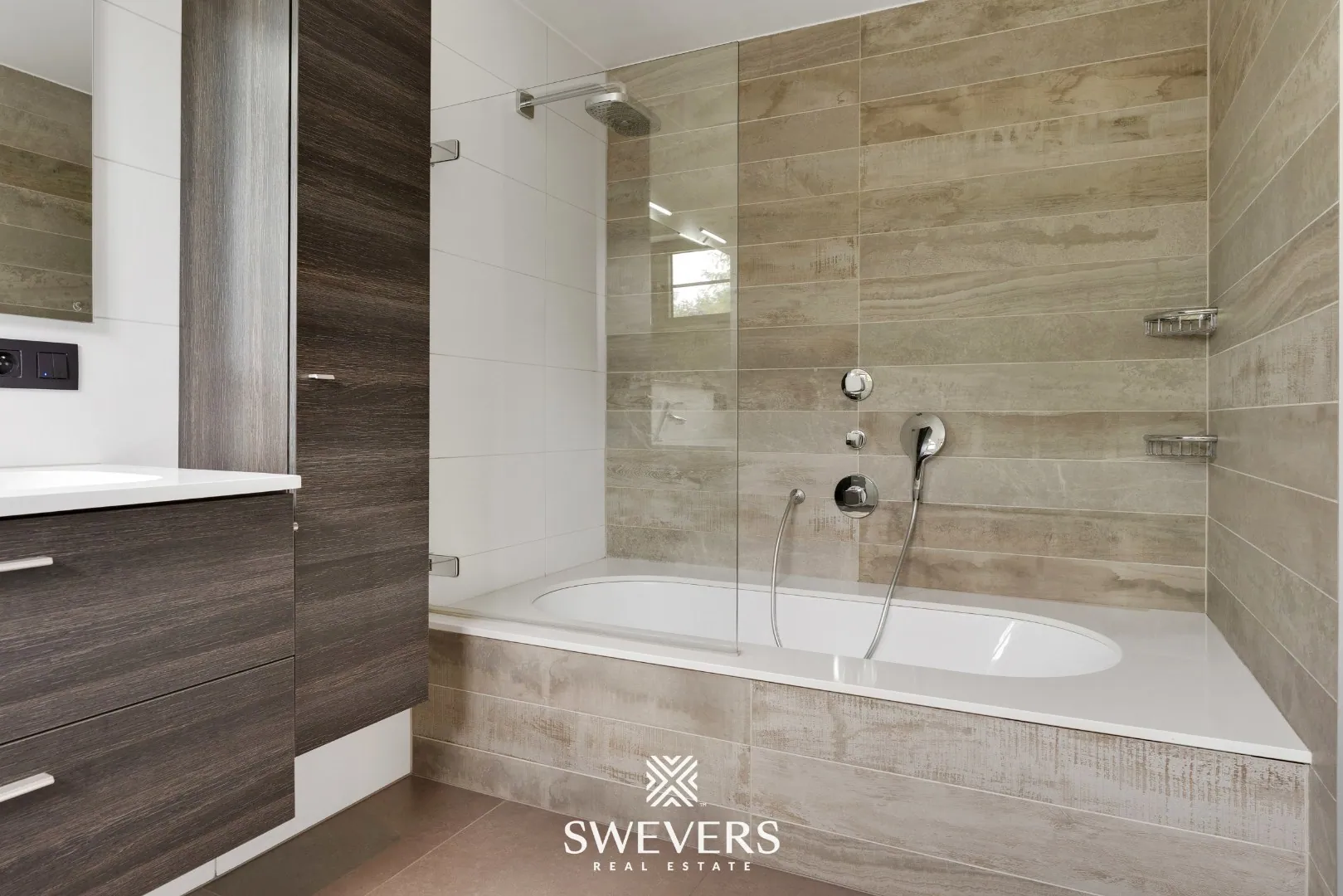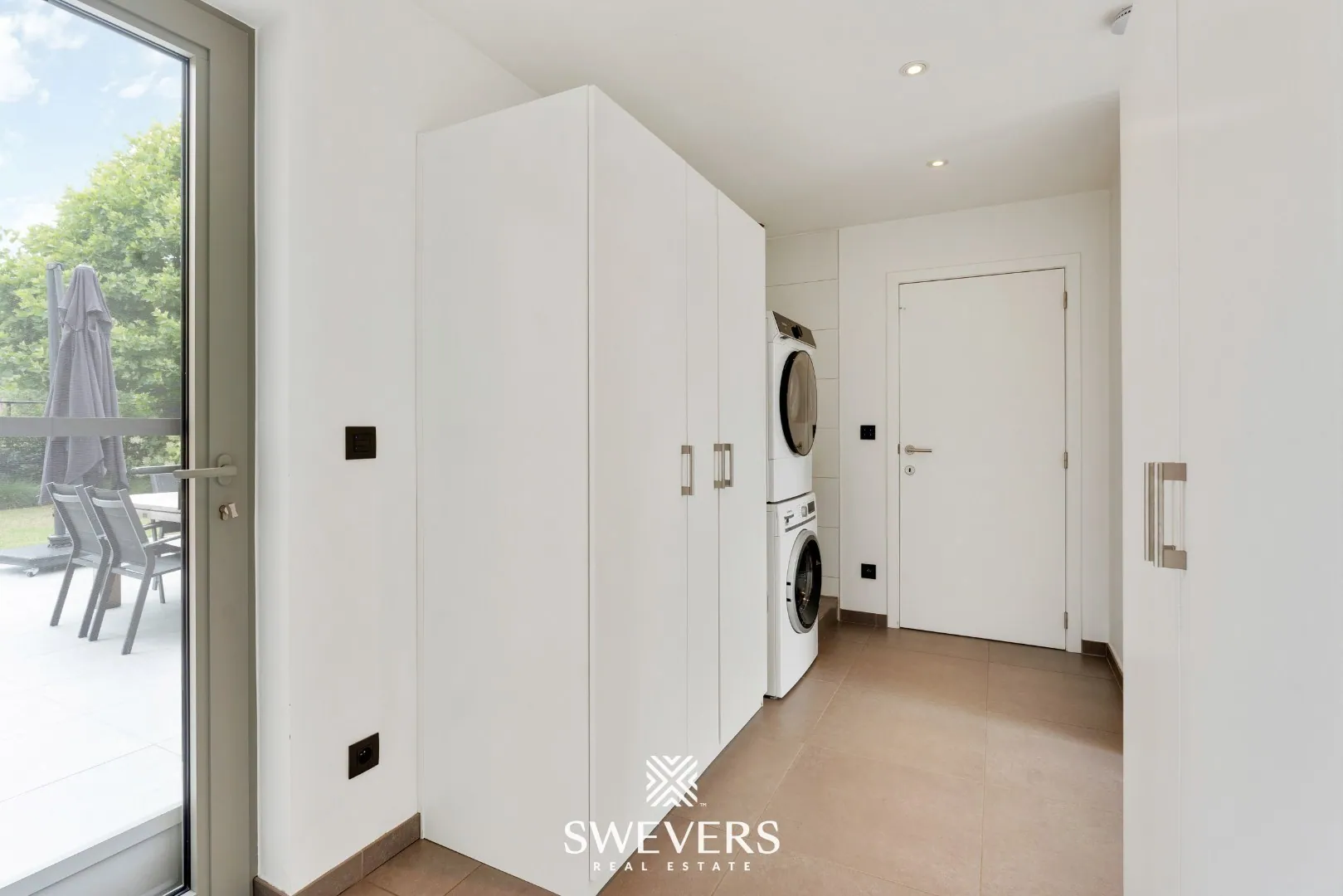 Verder krijg je gelijkvloers een grote badkamer, een apart toilet, een technische berging én een ruime wasberging. Alles werd hier netjes weggewerkt in strakke kasten.