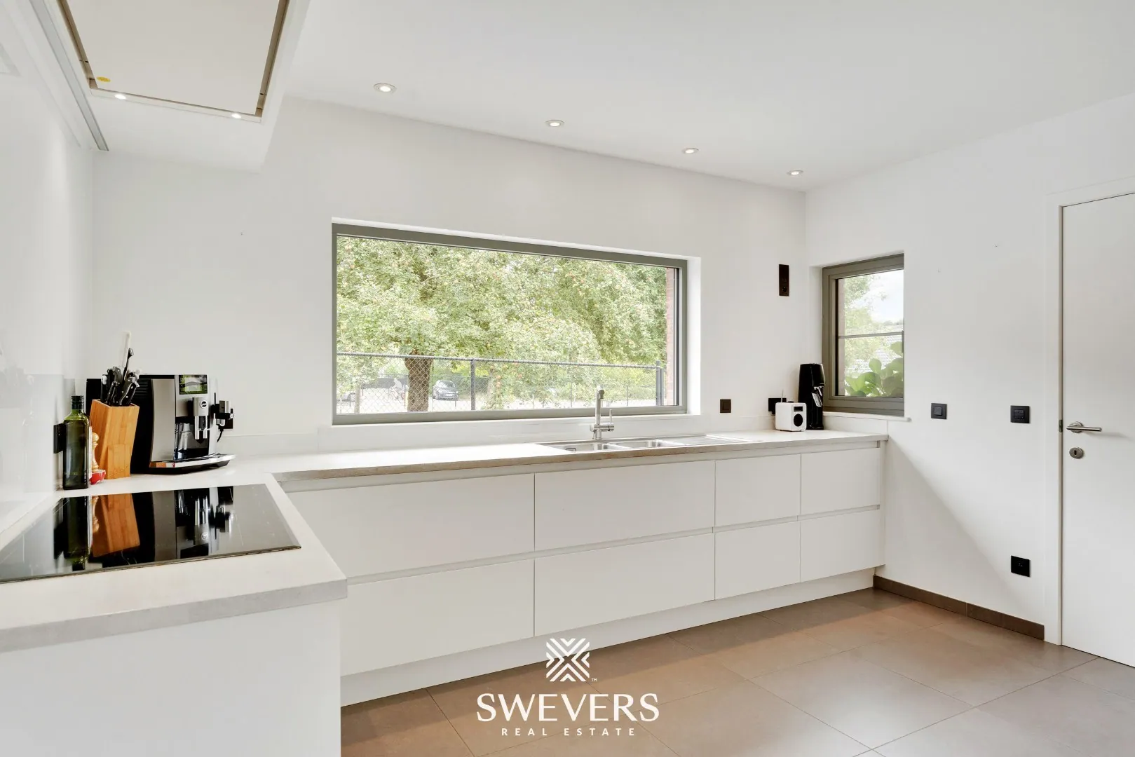 Aansluitend wandelen we de lichtrijke leefruimte binnen. Grote ramen laten het zonlicht overvloedig binnen. ’s Avonds zorgen dimbare spots en een knappe indirecte ledverlichting voor een warme, uitnodigende sfeer. Met een totale oppervlakte van maar liefst 30,10 m² is hier plaats genoeg voor een knusse tv-hoek enerzijds en een lichtrijke eetruimte anderzijds. Vanuit de eetkamer heb je een knap uitzicht op de groene tuin.