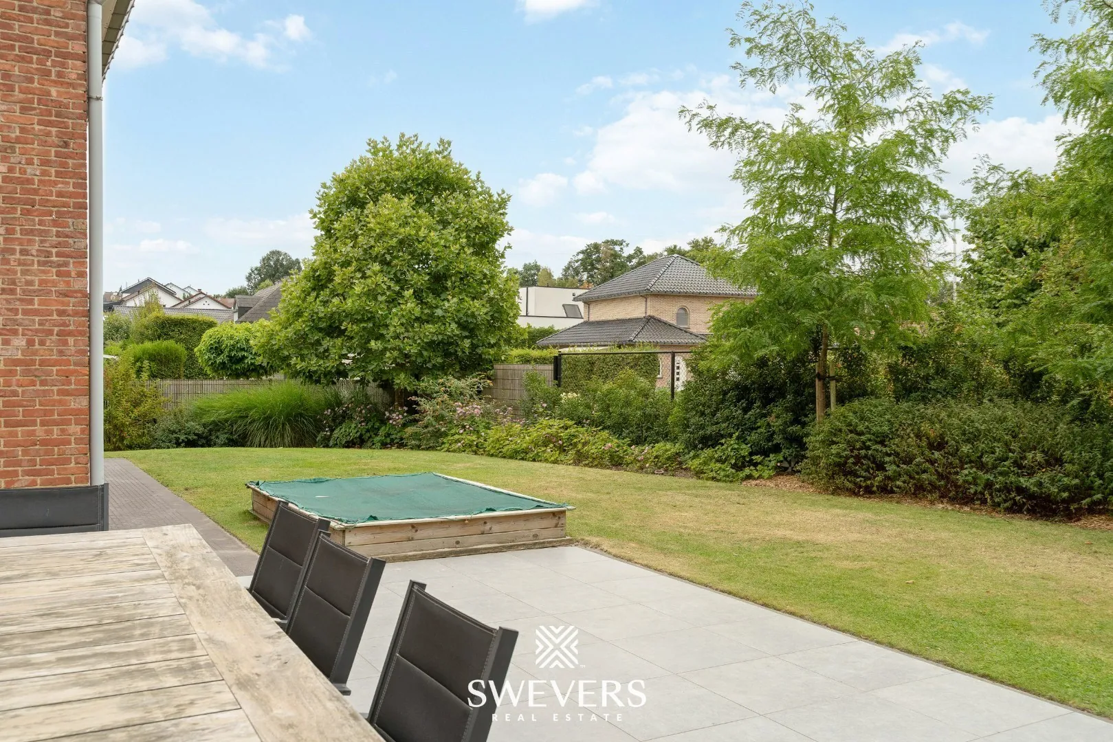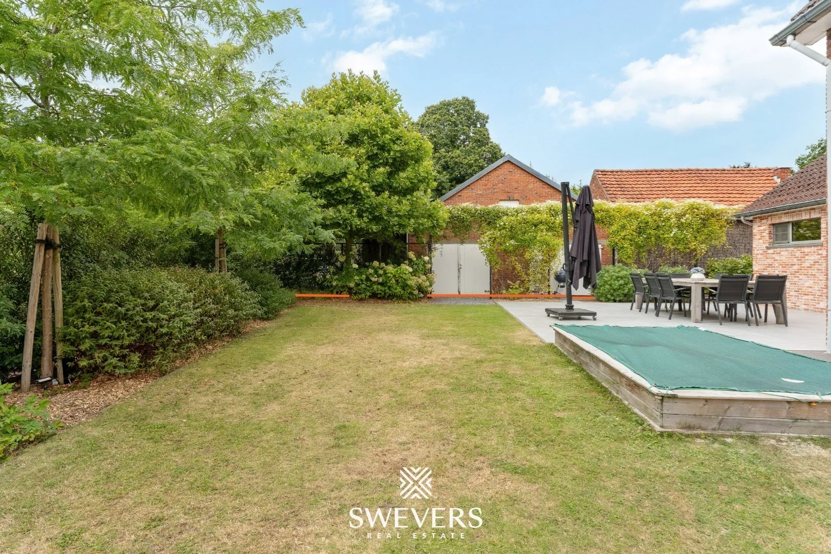 Het perceel kent een totale oppervlakte van 6a 60ca. Zeer recent werd de tuin nog volledig omheind, hetgeen voor een grote privacy en veilig gevoel zorgt. Op het immense terras aan de zijkant van de woning geniet je dankzij de zuidwestelijke oriëntatie van die zalig warme zonnestralen tot in de late uurtjes. Genieten, met de grote ‘G’, van gezellige barbecues en ontspannen avonden, terwijl de kinderen of viervoeters veilig kunnen spelen in de tuin. Dankzij een regenwaterput, grondwaterpomp en beregeningsinstallatie blijft de tuin altijd frisgroen.