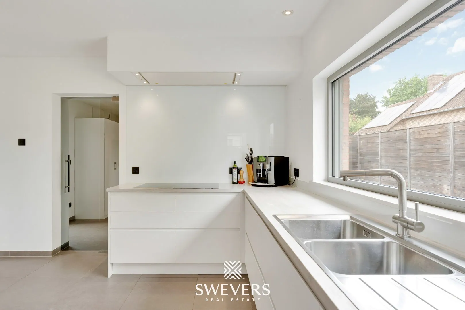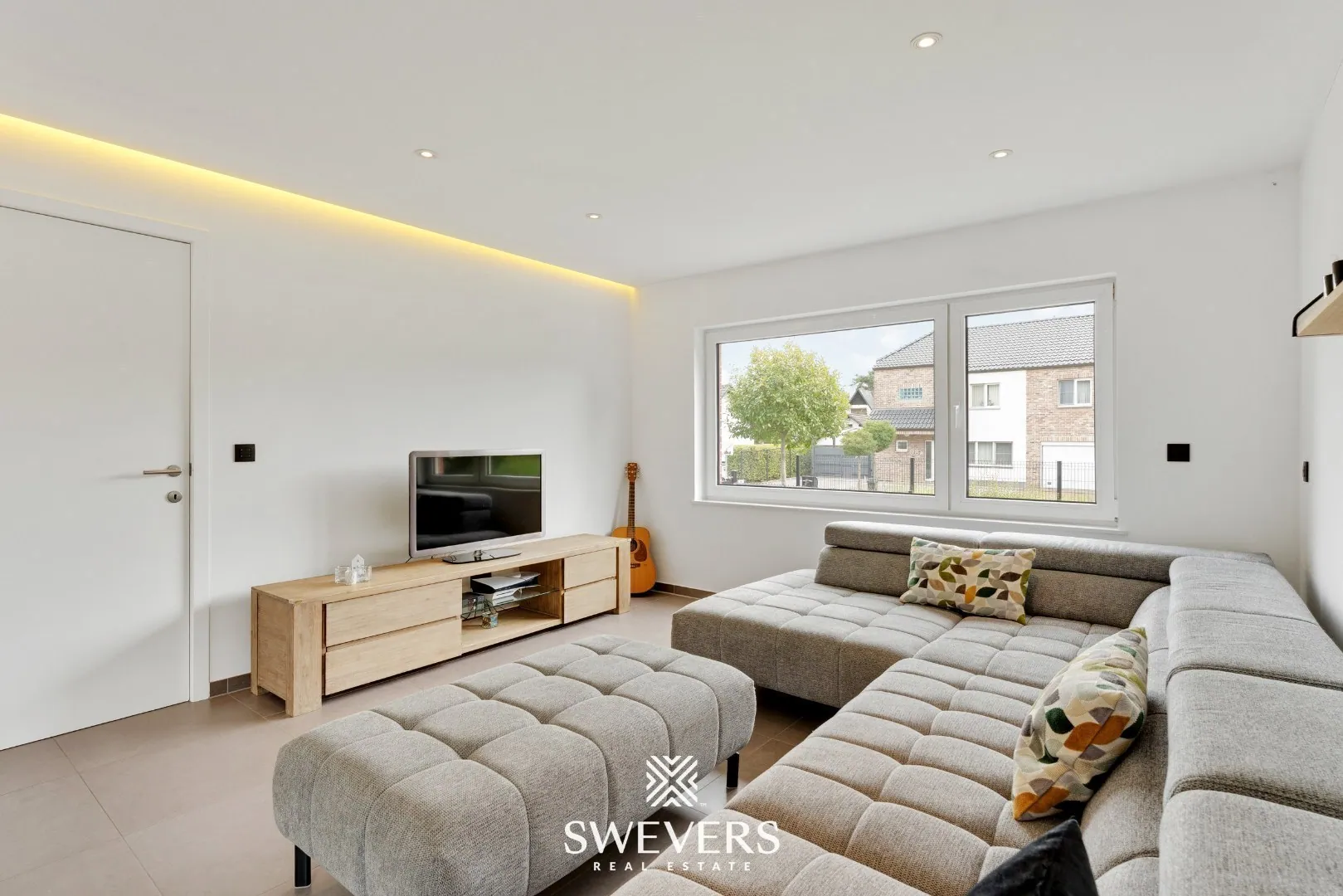 Aansluitend wandelen we de lichtrijke leefruimte binnen. Grote ramen laten het zonlicht overvloedig binnen. ’s Avonds zorgen dimbare spots en een knappe indirecte ledverlichting voor een warme, uitnodigende sfeer. Met een totale oppervlakte van maar liefst 30,10 m² is hier plaats genoeg voor een knusse tv-hoek enerzijds en een lichtrijke eetruimte anderzijds. Vanuit de eetkamer heb je een knap uitzicht op de groene tuin.