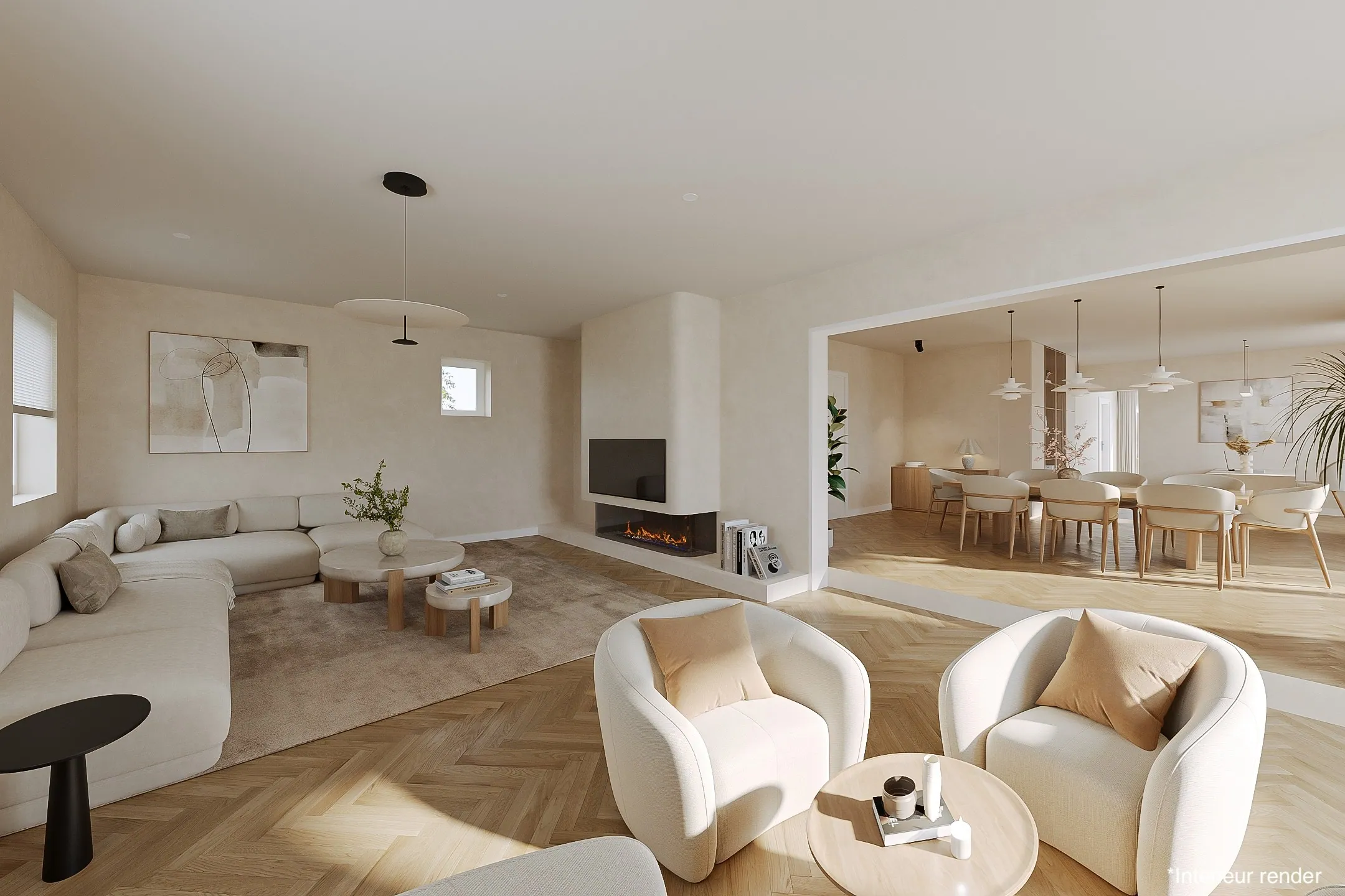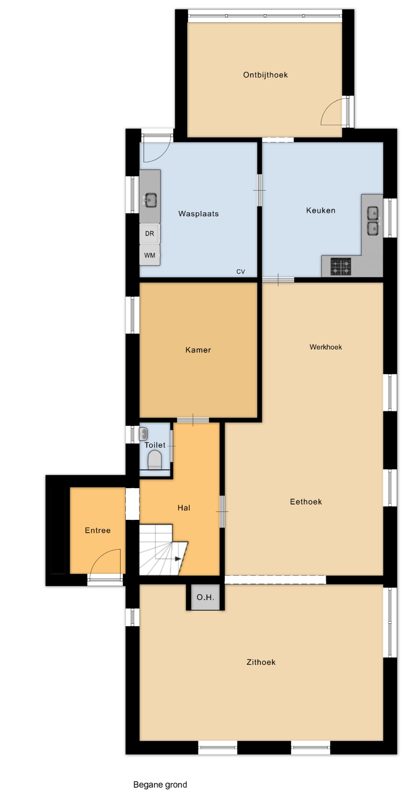 Bij het betreden van de woning komt men binnen in een ruime en lichtrijke inkomhal met een open trappenhal die doorloopt tot boven. Vanuit de hal is er toegang tot een apart gastentoilet en een gelijkvloerse kamer, die perfect kan dienen als slaapkamer, bureau of hobbyruimte. De leefruimte van maar liefst 62 m² strekt zich uit in een open L-vorm en biedt tal van indelingsmogelijkheden. Hier kan men moeiteloos een gezellige zithoek, een ruime eetplaats en zelfs een speelhoek of werkruimte creëren.