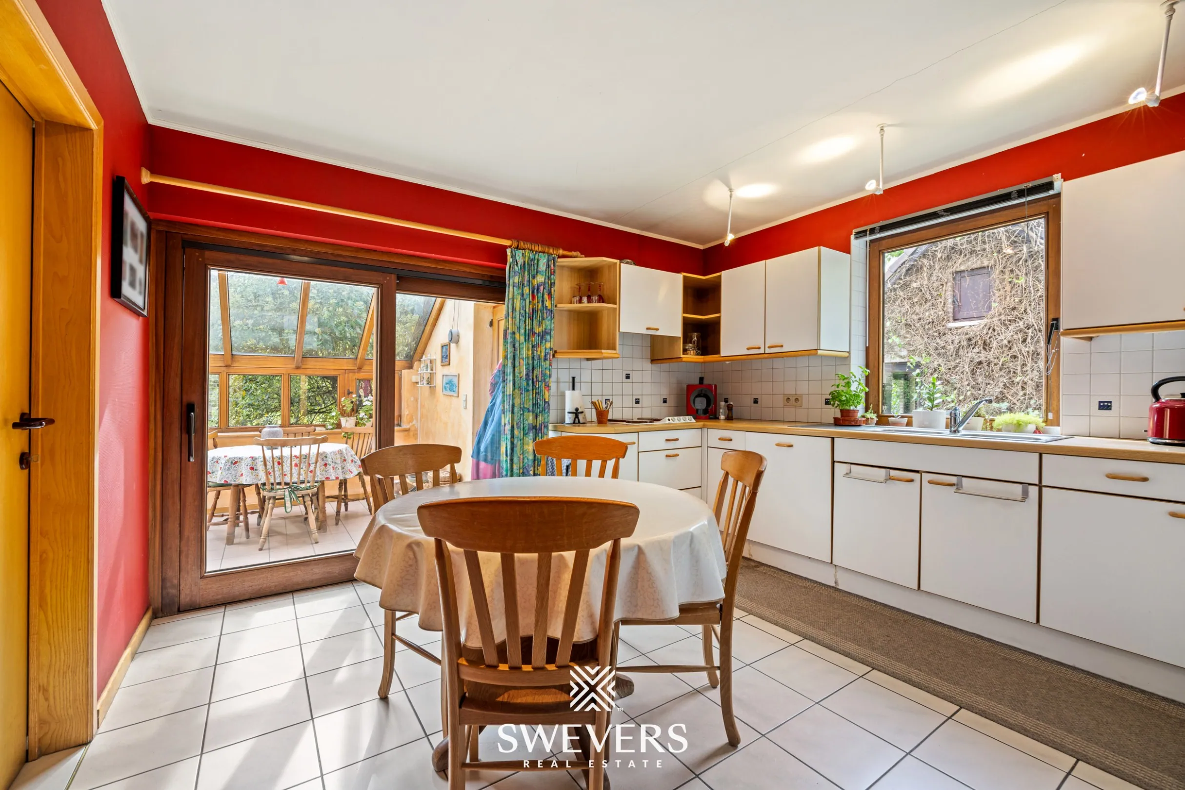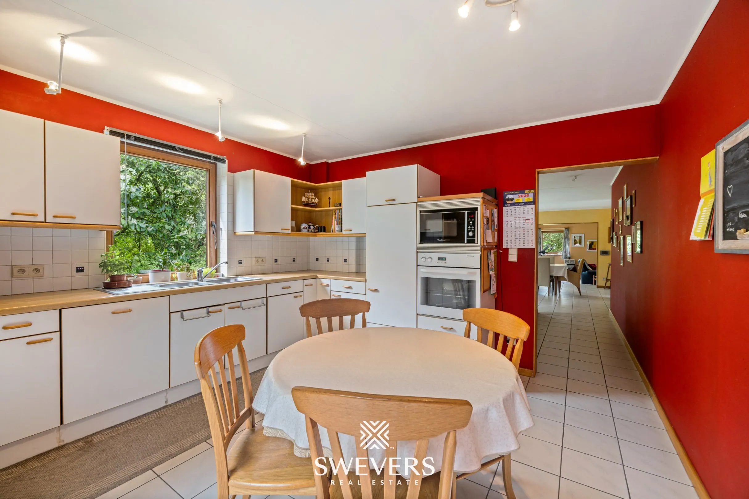 Aansluitend bevindt zich de keuken van 13 m², die functioneel is ingericht en mogelijkheden biedt tot vernieuwing. Naast de keuken ligt een aangename ontbijthoek met zicht op het groen, ideaal om de dag rustig te starten. Verder is er een praktische wasplaats met extra bergruimte.