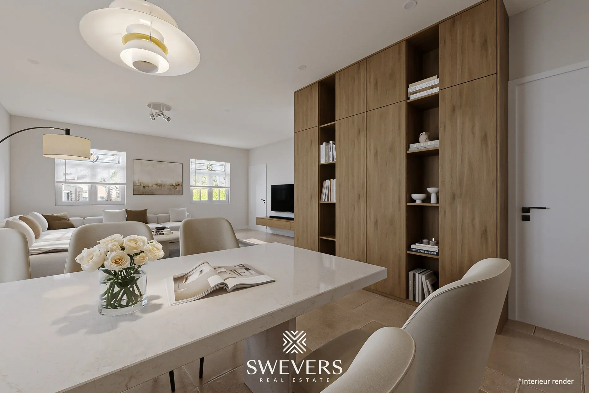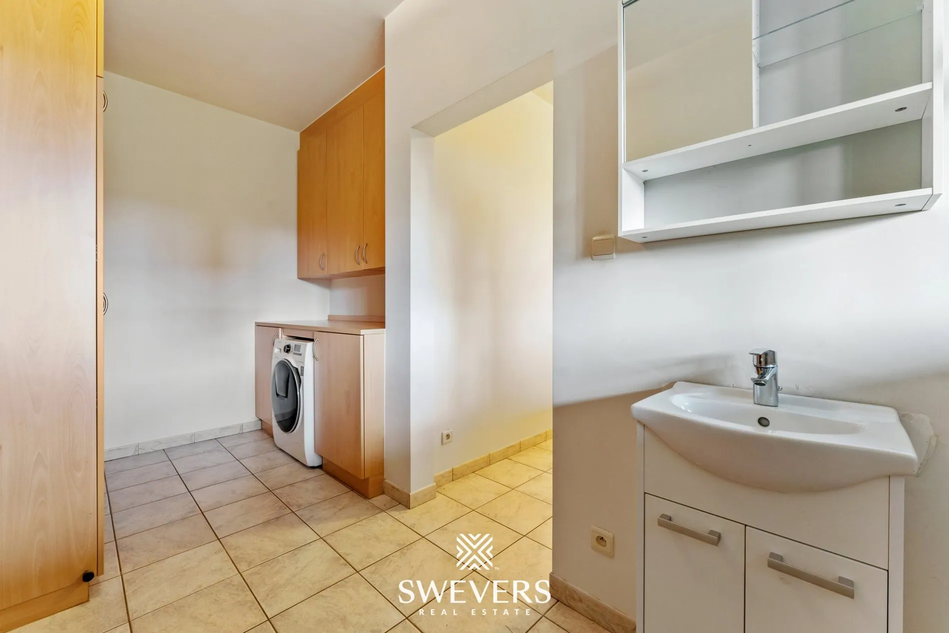 Op het gelijkvloers vormt de ruime inkomhal de toegang tot een bijzonder functionele indeling. De leefruimte van 38 m² baadt in het licht dankzij de grote ramen en biedt directe toegang tot het terras. De naastgelegen keuken van 17,40 m² is ruim en praktisch ingericht, met voldoende werk- en opbergruimte. Aan de achterzijde van de woning bevindt zich de washoek, waar ook voorzieningen zijn voor wasmachine en droogkast. Verder is er op deze verdieping een apart gastentoilet, een comfortabele badkamer met ligbad en dubbele wastafel, én een extra ruimte die vandaag dienstdoet als naaikamer, maar evengoed kan omgevormd worden tot bureauruimte of hobbykamer.