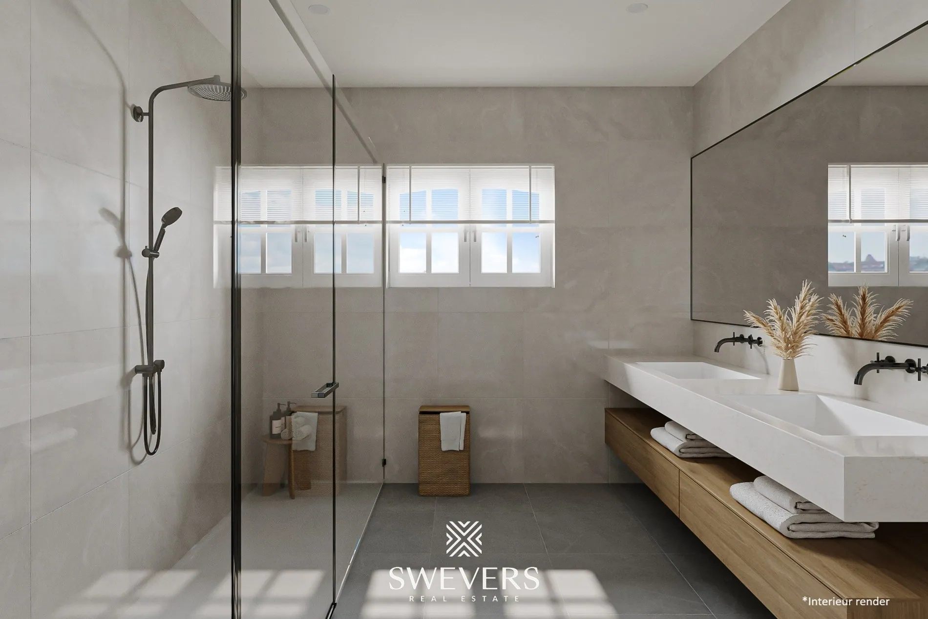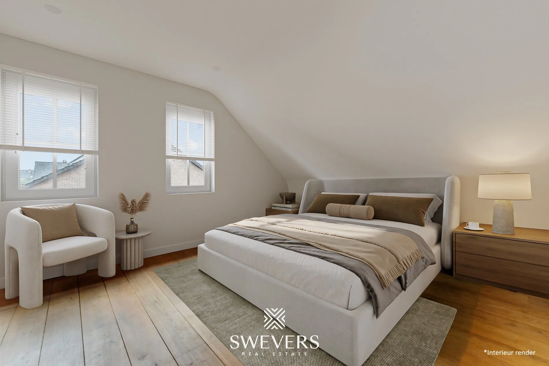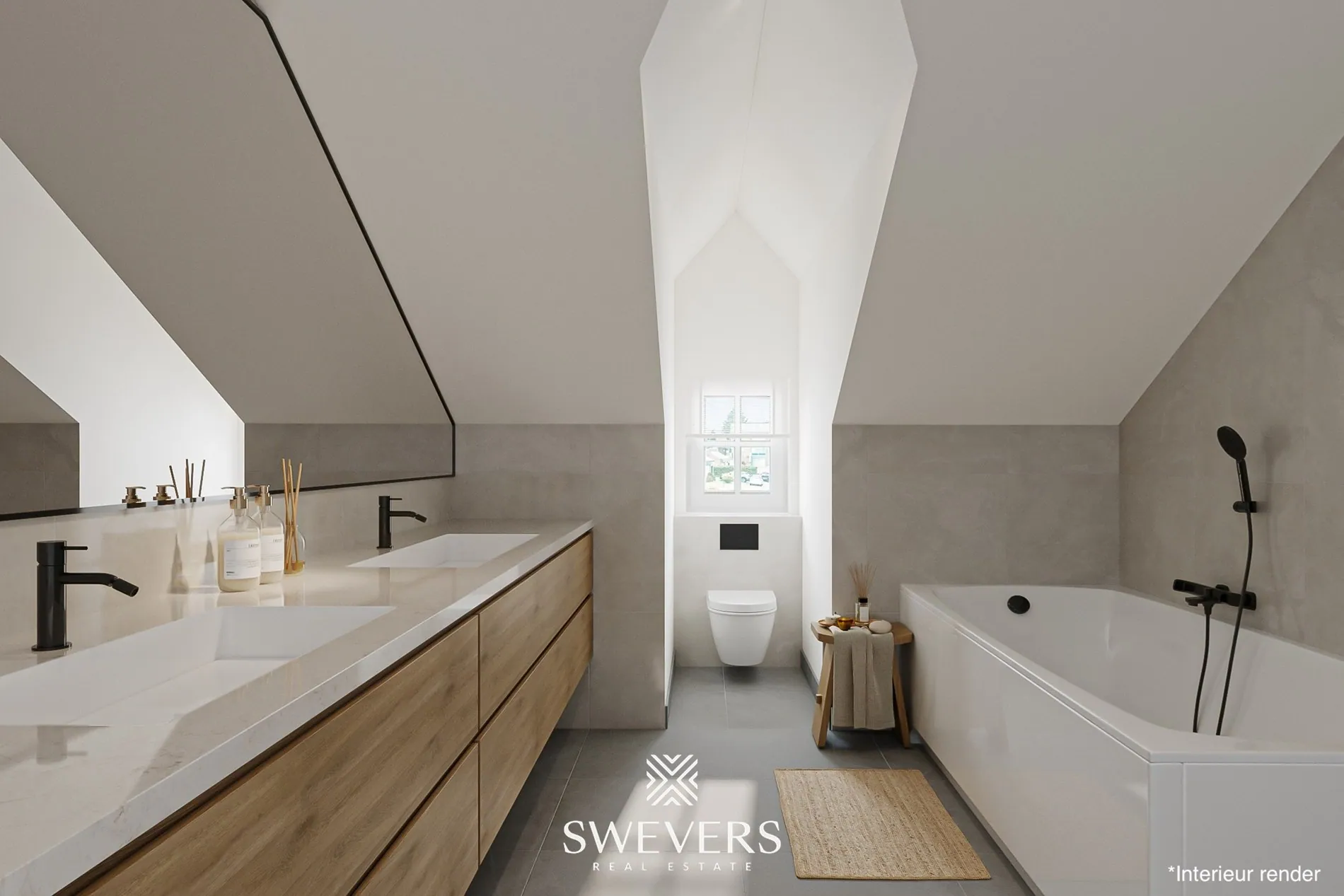 De eerste verdieping telt drie volwaardige slaapkamers met oppervlaktes van 26 m², 13,20 m² en 11,80 m². Elke kamer beschikt over voldoende lichtinval en ruimte voor een tweepersoonsbed en kast. Een tweede, compacte badkamer met lavabo zorgt voor extra comfort. Verder vind je op deze verdieping een bureauruimte die zich uitstekend leent tot thuiswerk, en een centrale overloop die zorgt voor een vlotte verbinding tussen de verschillende kamers.